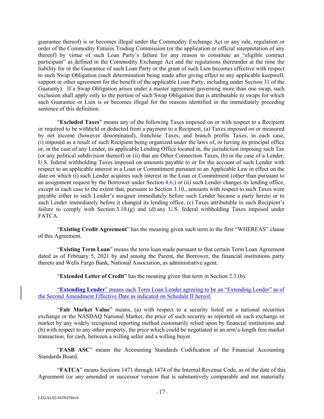 guarantee thereof) is or becomes illegal under the Commodity Exchange Act or any rule, regulation or order of the Commodity Futures Trading Commission (or the application or official interpretation of any thereof) by virtue of such Loan Party’s failure for any reason to constitute an “eligible contract participant” as defined in the Commodity Exchange Act and the regulations thereunder at the time the liability for or the Guarantee of such Loan Party or the grant of such Lien becomes effective with respect to such Swap Obligation (such determination being made after giving effect to any applicable keepwell, support or other agreement for the benefit of the applicable Loan Party, including under Section 31 of the Guaranty). If a Swap Obligation arises under a master agreement governing more than one swap, such exclusion shall apply only to the portion of such Swap Obligation that is attributable to swaps for which such Guarantee or Lien is or becomes illegal for the reasons identified in the immediately preceding sentence of this definition. “Excluded Taxes” means any of the following Taxes imposed on or with respect to a Recipient or required to be withheld or deducted from a payment to a Recipient, (a) Taxes imposed on or measured by net income (however denominated), franchise Taxes, and branch profits Taxes, in each case, (i) imposed as a result of such Recipient being organized under the laws of, or having its principal office or, in the case of any Lender, its applicable Lending Office located in, the jurisdiction imposing such Tax (or any political subdivision thereof) or (ii) that are Other Connection Taxes, (b) in the case of a Lender, U.S. federal withholding Taxes imposed on amounts payable to or for the account of such Lender with respect to an applicable interest in a Loan or Commitment pursuant to an Applicable Law in effect on the date on which (i) such Lender acquires such interest in the Loan or Commitment (other than pursuant to an assignment request by the Borrower under Section 4.6.) or (ii) such Lender changes its lending office, except in each case to the extent that, pursuant to Section 3.10., amounts with respect to such Taxes were payable either to such Lender’s assignor immediately before such Lender became a party hereto or to such Lender immediately before it changed its lending office, (c) Taxes attributable to such Recipient’s failure to comply with Section 3.10.(g) and (d) any U.S. federal withholding Taxes imposed under FATCA. “Existing Credit Agreement” has the meaning given such term in the first “WHEREAS” clause of this Agreement. “Existing Term Loan” means the term loan made pursuant to that certain Term Loan Agreement dated as of February 5, 2021 by and among the Parent, the Borrower, the financial institutions party thereto and Wells Fargo Bank, National Association, as administrative agent. “Extended Letter of Credit” has the meaning given that term in Section 2.3.(b). “Extending Lender” means each Term Loan Lender agreeing to be an “Extending Lender” as of the Second Amendment Effective Date as indicated on Schedule II hereof. “Fair Market Value” means, (a) with respect to a security listed on a national securities exchange or the NASDAQ National Market, the price of such security as reported on such exchange or market by any widely recognized reporting method customarily relied upon by financial institutions and (b) with respect to any other property, the price which could be negotiated in an arm’s-length free market transaction, for cash, between a willing seller and a willing buyer. “FASB ASC” means the Accounting Standards Codification of the Financial Accounting Standards Board. “FATCA” means Sections 1471 through 1474 of the Internal Revenue Code, as of the date of this Agreement (or any amended or successor version that is substantively comparable and not materially - 17 - LEGAL02/44384586v6