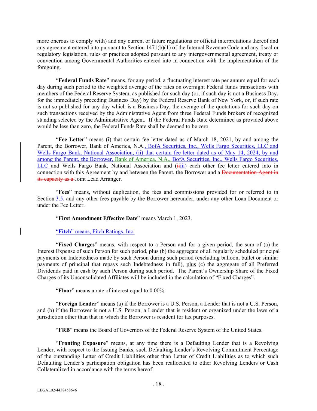 more onerous to comply with) and any current or future regulations or official interpretations thereof and any agreement entered into pursuant to Section 1471(b)(1) of the Internal Revenue Code and any fiscal or regulatory legislation, rules or practices adopted pursuant to any intergovernmental agreement, treaty or convention among Governmental Authorities entered into in connection with the implementation of the foregoing. “Federal Funds Rate” means, for any period, a fluctuating interest rate per annum equal for each day during such period to the weighted average of the rates on overnight Federal funds transactions with members of the Federal Reserve System, as published for such day (or, if such day is not a Business Day, for the immediately preceding Business Day) by the Federal Reserve Bank of New York, or, if such rate is not so published for any day which is a Business Day, the average of the quotations for such day on such transactions received by the Administrative Agent from three Federal Funds brokers of recognized standing selected by the Administrative Agent. If the Federal Funds Rate determined as provided above would be less than zero, the Federal Funds Rate shall be deemed to be zero. “Fee Letter” means (i) that certain fee letter dated as of March 18, 2021, by and among the Parent, the Borrower, Bank of America, N.A., BofA Securities, Inc., Wells Fargo Securities, LLC and Wells Fargo Bank, National Association, (ii) that certain fee letter dated as of May 14, 2024, by and among the Parent, the Borrower, Bank of America, N.A., BofA Securities, Inc., Wells Fargo Securities, LLC and Wells Fargo Bank, National Association and (iiiii) each other fee letter entered into in connection with this Agreement by and between the Parent, the Borrower and a Documentation Agent in its capacity as a Joint Lead Arranger. “Fees” means, without duplication, the fees and commissions provided for or referred to in Section 3.5. and any other fees payable by the Borrower hereunder, under any other Loan Document or under the Fee Letter. “First Amendment Effective Date” means March 1, 2023. “Fitch” means, Fitch Ratings, Inc. “Fixed Charges” means, with respect to a Person and for a given period, the sum of (a) the Interest Expense of such Person for such period, plus (b) the aggregate of all regularly scheduled principal payments on Indebtedness made by such Person during such period (excluding balloon, bullet or similar payments of principal that repays such Indebtedness in full), plus (c) the aggregate of all Preferred Dividends paid in cash by such Person during such period. The Parent’s Ownership Share of the Fixed Charges of its Unconsolidated Affiliates will be included in the calculation of “Fixed Charges”. “Floor” means a rate of interest equal to 0.00%. “Foreign Lender” means (a) if the Borrower is a U.S. Person, a Lender that is not a U.S. Person, and (b) if the Borrower is not a U.S. Person, a Lender that is resident or organized under the laws of a jurisdiction other than that in which the Borrower is resident for tax purposes. “FRB” means the Board of Governors of the Federal Reserve System of the United States. “Fronting Exposure” means, at any time there is a Defaulting Lender that is a Revolving Lender, with respect to the Issuing Banks, such Defaulting Lender’s Revolving Commitment Percentage of the outstanding Letter of Credit Liabilities other than Letter of Credit Liabilities as to which such Defaulting Lender’s participation obligation has been reallocated to other Revolving Lenders or Cash Collateralized in accordance with the terms hereof. - 18 - LEGAL02/44384586v6