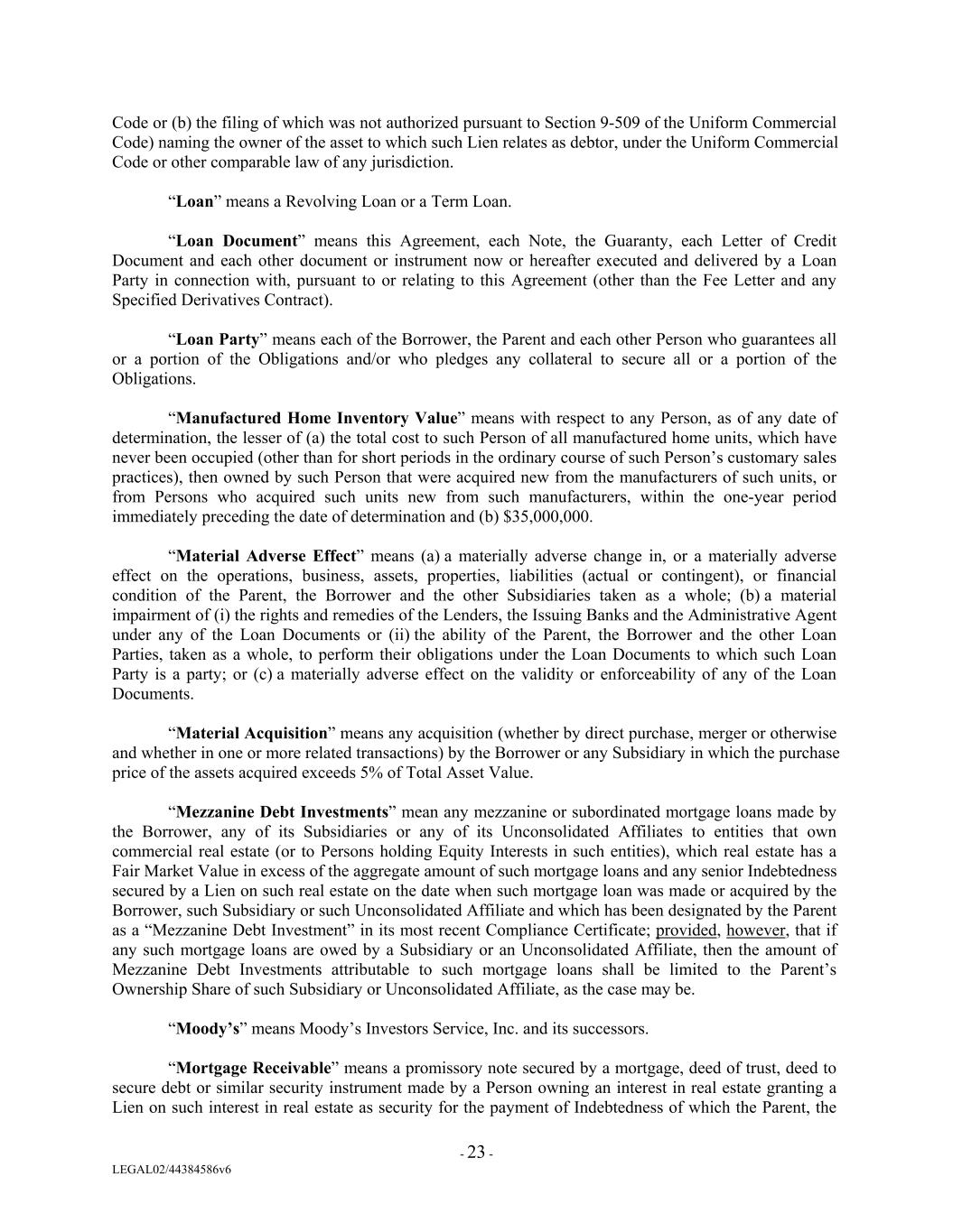 Code or (b) the filing of which was not authorized pursuant to Section 9-509 of the Uniform Commercial Code) naming the owner of the asset to which such Lien relates as debtor, under the Uniform Commercial Code or other comparable law of any jurisdiction. “Loan” means a Revolving Loan or a Term Loan. “Loan Document” means this Agreement, each Note, the Guaranty, each Letter of Credit Document and each other document or instrument now or hereafter executed and delivered by a Loan Party in connection with, pursuant to or relating to this Agreement (other than the Fee Letter and any Specified Derivatives Contract). “Loan Party” means each of the Borrower, the Parent and each other Person who guarantees all or a portion of the Obligations and/or who pledges any collateral to secure all or a portion of the Obligations. “Manufactured Home Inventory Value” means with respect to any Person, as of any date of determination, the lesser of (a) the total cost to such Person of all manufactured home units, which have never been occupied (other than for short periods in the ordinary course of such Person’s customary sales practices), then owned by such Person that were acquired new from the manufacturers of such units, or from Persons who acquired such units new from such manufacturers, within the one-year period immediately preceding the date of determination and (b) $35,000,000. “Material Adverse Effect” means (a) a materially adverse change in, or a materially adverse effect on the operations, business, assets, properties, liabilities (actual or contingent), or financial condition of the Parent, the Borrower and the other Subsidiaries taken as a whole; (b) a material impairment of (i) the rights and remedies of the Lenders, the Issuing Banks and the Administrative Agent under any of the Loan Documents or (ii) the ability of the Parent, the Borrower and the other Loan Parties, taken as a whole, to perform their obligations under the Loan Documents to which such Loan Party is a party; or (c) a materially adverse effect on the validity or enforceability of any of the Loan Documents. “Material Acquisition” means any acquisition (whether by direct purchase, merger or otherwise and whether in one or more related transactions) by the Borrower or any Subsidiary in which the purchase price of the assets acquired exceeds 5% of Total Asset Value. “Mezzanine Debt Investments” mean any mezzanine or subordinated mortgage loans made by the Borrower, any of its Subsidiaries or any of its Unconsolidated Affiliates to entities that own commercial real estate (or to Persons holding Equity Interests in such entities), which real estate has a Fair Market Value in excess of the aggregate amount of such mortgage loans and any senior Indebtedness secured by a Lien on such real estate on the date when such mortgage loan was made or acquired by the Borrower, such Subsidiary or such Unconsolidated Affiliate and which has been designated by the Parent as a “Mezzanine Debt Investment” in its most recent Compliance Certificate; provided, however, that if any such mortgage loans are owed by a Subsidiary or an Unconsolidated Affiliate, then the amount of Mezzanine Debt Investments attributable to such mortgage loans shall be limited to the Parent’s Ownership Share of such Subsidiary or Unconsolidated Affiliate, as the case may be. “Moody’s” means Moody’s Investors Service, Inc. and its successors. “Mortgage Receivable” means a promissory note secured by a mortgage, deed of trust, deed to secure debt or similar security instrument made by a Person owning an interest in real estate granting a Lien on such interest in real estate as security for the payment of Indebtedness of which the Parent, the - 23 - LEGAL02/44384586v6