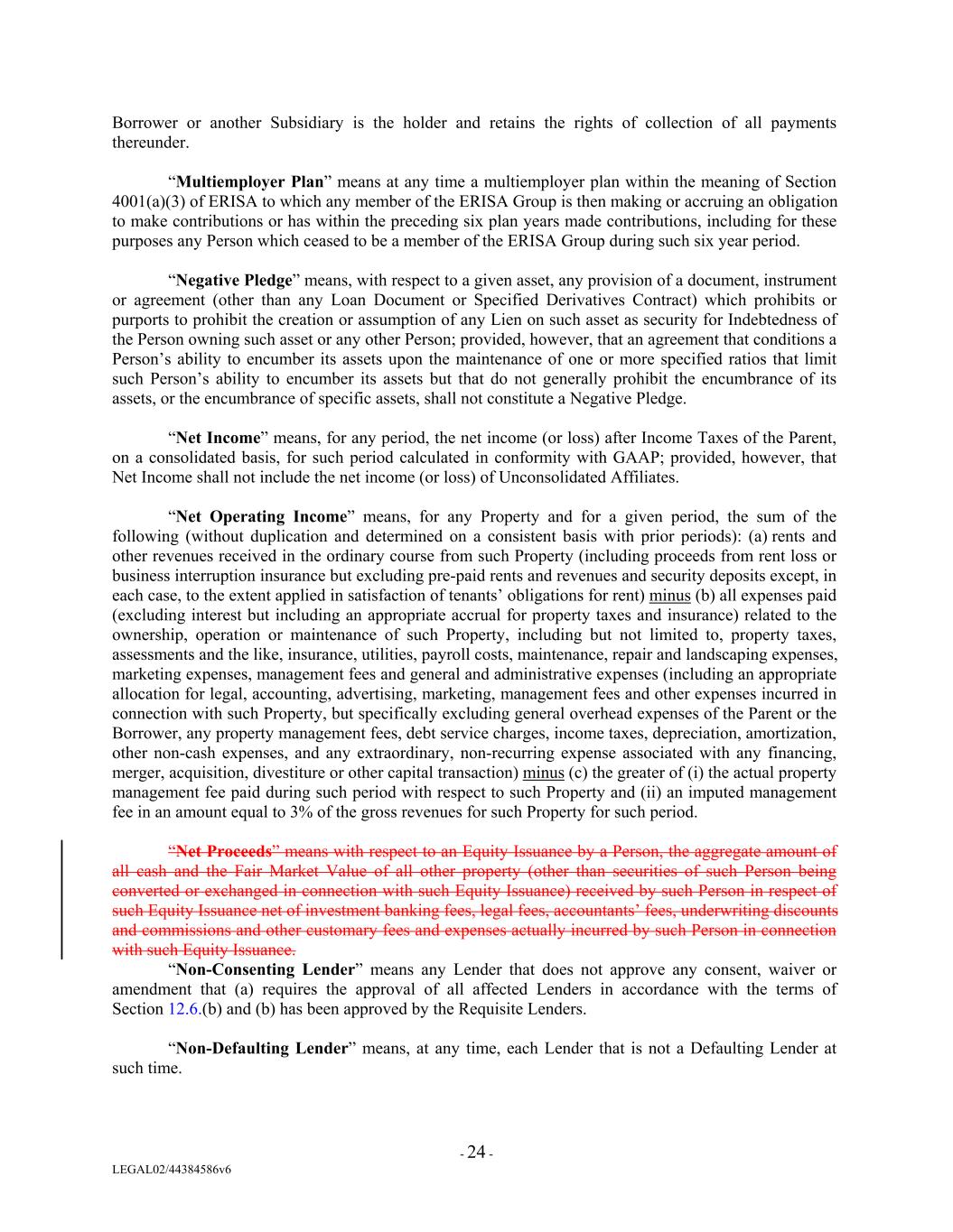 Borrower or another Subsidiary is the holder and retains the rights of collection of all payments thereunder. “Multiemployer Plan” means at any time a multiemployer plan within the meaning of Section 4001(a)(3) of ERISA to which any member of the ERISA Group is then making or accruing an obligation to make contributions or has within the preceding six plan years made contributions, including for these purposes any Person which ceased to be a member of the ERISA Group during such six year period. “Negative Pledge” means, with respect to a given asset, any provision of a document, instrument or agreement (other than any Loan Document or Specified Derivatives Contract) which prohibits or purports to prohibit the creation or assumption of any Lien on such asset as security for Indebtedness of the Person owning such asset or any other Person; provided, however, that an agreement that conditions a Person’s ability to encumber its assets upon the maintenance of one or more specified ratios that limit such Person’s ability to encumber its assets but that do not generally prohibit the encumbrance of its assets, or the encumbrance of specific assets, shall not constitute a Negative Pledge. “Net Income” means, for any period, the net income (or loss) after Income Taxes of the Parent, on a consolidated basis, for such period calculated in conformity with GAAP; provided, however, that Net Income shall not include the net income (or loss) of Unconsolidated Affiliates. “Net Operating Income” means, for any Property and for a given period, the sum of the following (without duplication and determined on a consistent basis with prior periods): (a) rents and other revenues received in the ordinary course from such Property (including proceeds from rent loss or business interruption insurance but excluding pre-paid rents and revenues and security deposits except, in each case, to the extent applied in satisfaction of tenants’ obligations for rent) minus (b) all expenses paid (excluding interest but including an appropriate accrual for property taxes and insurance) related to the ownership, operation or maintenance of such Property, including but not limited to, property taxes, assessments and the like, insurance, utilities, payroll costs, maintenance, repair and landscaping expenses, marketing expenses, management fees and general and administrative expenses (including an appropriate allocation for legal, accounting, advertising, marketing, management fees and other expenses incurred in connection with such Property, but specifically excluding general overhead expenses of the Parent or the Borrower, any property management fees, debt service charges, income taxes, depreciation, amortization, other non-cash expenses, and any extraordinary, non-recurring expense associated with any financing, merger, acquisition, divestiture or other capital transaction) minus (c) the greater of (i) the actual property management fee paid during such period with respect to such Property and (ii) an imputed management fee in an amount equal to 3% of the gross revenues for such Property for such period. “Net Proceeds” means with respect to an Equity Issuance by a Person, the aggregate amount of all cash and the Fair Market Value of all other property (other than securities of such Person being converted or exchanged in connection with such Equity Issuance) received by such Person in respect of such Equity Issuance net of investment banking fees, legal fees, accountants’ fees, underwriting discounts and commissions and other customary fees and expenses actually incurred by such Person in connection with such Equity Issuance. “Non-Consenting Lender” means any Lender that does not approve any consent, waiver or amendment that (a) requires the approval of all affected Lenders in accordance with the terms of Section 12.6.(b) and (b) has been approved by the Requisite Lenders. “Non-Defaulting Lender” means, at any time, each Lender that is not a Defaulting Lender at such time. - 24 - LEGAL02/44384586v6