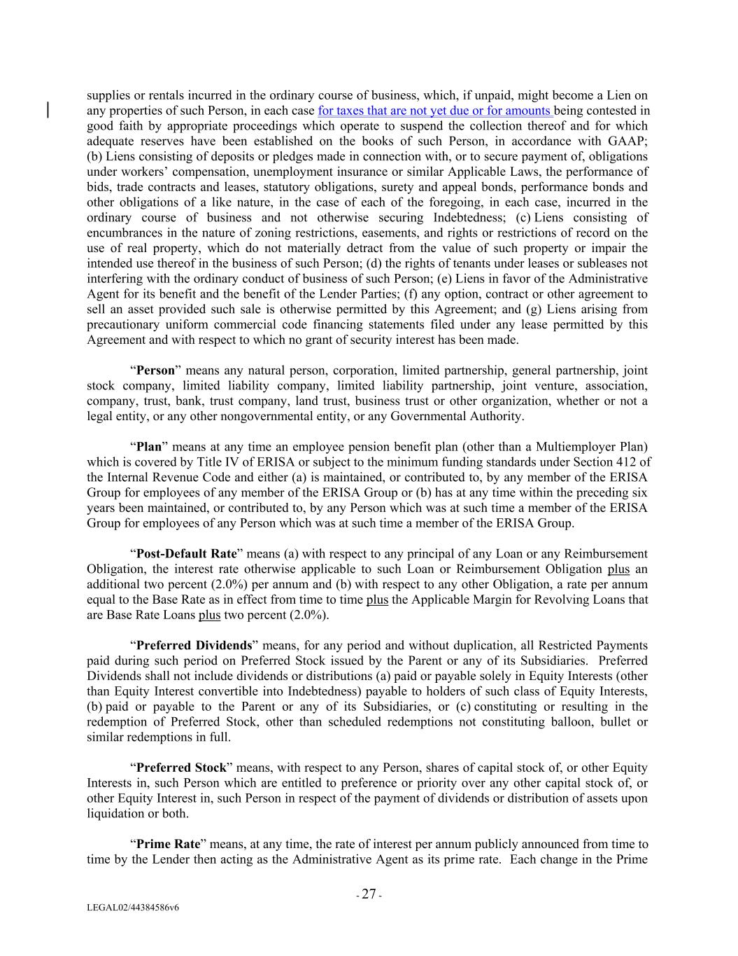 supplies or rentals incurred in the ordinary course of business, which, if unpaid, might become a Lien on any properties of such Person, in each case for taxes that are not yet due or for amounts being contested in good faith by appropriate proceedings which operate to suspend the collection thereof and for which adequate reserves have been established on the books of such Person, in accordance with GAAP; (b) Liens consisting of deposits or pledges made in connection with, or to secure payment of, obligations under workers’ compensation, unemployment insurance or similar Applicable Laws, the performance of bids, trade contracts and leases, statutory obligations, surety and appeal bonds, performance bonds and other obligations of a like nature, in the case of each of the foregoing, in each case, incurred in the ordinary course of business and not otherwise securing Indebtedness; (c) Liens consisting of encumbrances in the nature of zoning restrictions, easements, and rights or restrictions of record on the use of real property, which do not materially detract from the value of such property or impair the intended use thereof in the business of such Person; (d) the rights of tenants under leases or subleases not interfering with the ordinary conduct of business of such Person; (e) Liens in favor of the Administrative Agent for its benefit and the benefit of the Lender Parties; (f) any option, contract or other agreement to sell an asset provided such sale is otherwise permitted by this Agreement; and (g) Liens arising from precautionary uniform commercial code financing statements filed under any lease permitted by this Agreement and with respect to which no grant of security interest has been made. “Person” means any natural person, corporation, limited partnership, general partnership, joint stock company, limited liability company, limited liability partnership, joint venture, association, company, trust, bank, trust company, land trust, business trust or other organization, whether or not a legal entity, or any other nongovernmental entity, or any Governmental Authority. “Plan” means at any time an employee pension benefit plan (other than a Multiemployer Plan) which is covered by Title IV of ERISA or subject to the minimum funding standards under Section 412 of the Internal Revenue Code and either (a) is maintained, or contributed to, by any member of the ERISA Group for employees of any member of the ERISA Group or (b) has at any time within the preceding six years been maintained, or contributed to, by any Person which was at such time a member of the ERISA Group for employees of any Person which was at such time a member of the ERISA Group. “Post-Default Rate” means (a) with respect to any principal of any Loan or any Reimbursement Obligation, the interest rate otherwise applicable to such Loan or Reimbursement Obligation plus an additional two percent (2.0%) per annum and (b) with respect to any other Obligation, a rate per annum equal to the Base Rate as in effect from time to time plus the Applicable Margin for Revolving Loans that are Base Rate Loans plus two percent (2.0%). “Preferred Dividends” means, for any period and without duplication, all Restricted Payments paid during such period on Preferred Stock issued by the Parent or any of its Subsidiaries. Preferred Dividends shall not include dividends or distributions (a) paid or payable solely in Equity Interests (other than Equity Interest convertible into Indebtedness) payable to holders of such class of Equity Interests, (b) paid or payable to the Parent or any of its Subsidiaries, or (c) constituting or resulting in the redemption of Preferred Stock, other than scheduled redemptions not constituting balloon, bullet or similar redemptions in full. “Preferred Stock” means, with respect to any Person, shares of capital stock of, or other Equity Interests in, such Person which are entitled to preference or priority over any other capital stock of, or other Equity Interest in, such Person in respect of the payment of dividends or distribution of assets upon liquidation or both. “Prime Rate” means, at any time, the rate of interest per annum publicly announced from time to time by the Lender then acting as the Administrative Agent as its prime rate. Each change in the Prime - 27 - LEGAL02/44384586v6