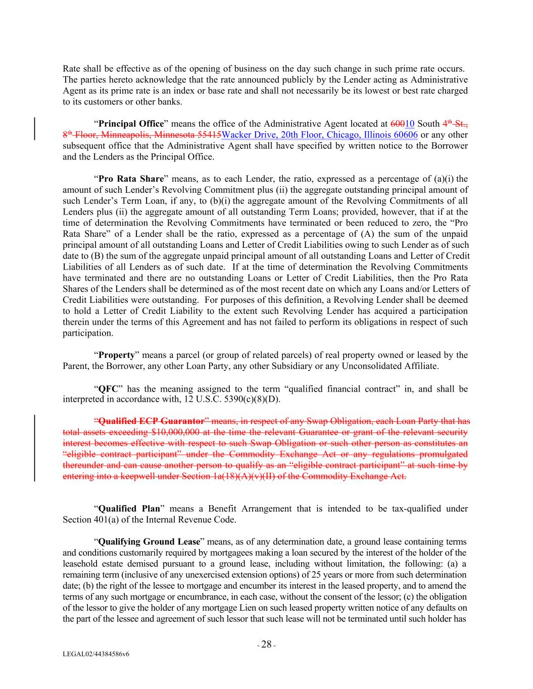 Rate shall be effective as of the opening of business on the day such change in such prime rate occurs. The parties hereto acknowledge that the rate announced publicly by the Lender acting as Administrative Agent as its prime rate is an index or base rate and shall not necessarily be its lowest or best rate charged to its customers or other banks. “Principal Office” means the office of the Administrative Agent located at 60010 South 4th St., 8th Floor, Minneapolis, Minnesota 55415Wacker Drive, 20th Floor, Chicago, Illinois 60606 or any other subsequent office that the Administrative Agent shall have specified by written notice to the Borrower and the Lenders as the Principal Office. “Pro Rata Share” means, as to each Lender, the ratio, expressed as a percentage of (a)(i) the amount of such Lender’s Revolving Commitment plus (ii) the aggregate outstanding principal amount of such Lender’s Term Loan, if any, to (b)(i) the aggregate amount of the Revolving Commitments of all Lenders plus (ii) the aggregate amount of all outstanding Term Loans; provided, however, that if at the time of determination the Revolving Commitments have terminated or been reduced to zero, the “Pro Rata Share” of a Lender shall be the ratio, expressed as a percentage of (A) the sum of the unpaid principal amount of all outstanding Loans and Letter of Credit Liabilities owing to such Lender as of such date to (B) the sum of the aggregate unpaid principal amount of all outstanding Loans and Letter of Credit Liabilities of all Lenders as of such date. If at the time of determination the Revolving Commitments have terminated and there are no outstanding Loans or Letter of Credit Liabilities, then the Pro Rata Shares of the Lenders shall be determined as of the most recent date on which any Loans and/or Letters of Credit Liabilities were outstanding. For purposes of this definition, a Revolving Lender shall be deemed to hold a Letter of Credit Liability to the extent such Revolving Lender has acquired a participation therein under the terms of this Agreement and has not failed to perform its obligations in respect of such participation. “Property” means a parcel (or group of related parcels) of real property owned or leased by the Parent, the Borrower, any other Loan Party, any other Subsidiary or any Unconsolidated Affiliate. “QFC” has the meaning assigned to the term “qualified financial contract” in, and shall be interpreted in accordance with, 12 U.S.C. 5390(c)(8)(D). “Qualified ECP Guarantor” means, in respect of any Swap Obligation, each Loan Party that has total assets exceeding $10,000,000 at the time the relevant Guarantee or grant of the relevant security interest becomes effective with respect to such Swap Obligation or such other person as constitutes an “eligible contract participant” under the Commodity Exchange Act or any regulations promulgated thereunder and can cause another person to qualify as an “eligible contract participant” at such time by entering into a keepwell under Section 1a(18)(A)(v)(II) of the Commodity Exchange Act. “Qualified Plan” means a Benefit Arrangement that is intended to be tax-qualified under Section 401(a) of the Internal Revenue Code. “Qualifying Ground Lease” means, as of any determination date, a ground lease containing terms and conditions customarily required by mortgagees making a loan secured by the interest of the holder of the leasehold estate demised pursuant to a ground lease, including without limitation, the following: (a) a remaining term (inclusive of any unexercised extension options) of 25 years or more from such determination date; (b) the right of the lessee to mortgage and encumber its interest in the leased property, and to amend the terms of any such mortgage or encumbrance, in each case, without the consent of the lessor; (c) the obligation of the lessor to give the holder of any mortgage Lien on such leased property written notice of any defaults on the part of the lessee and agreement of such lessor that such lease will not be terminated until such holder has - 28 - LEGAL02/44384586v6