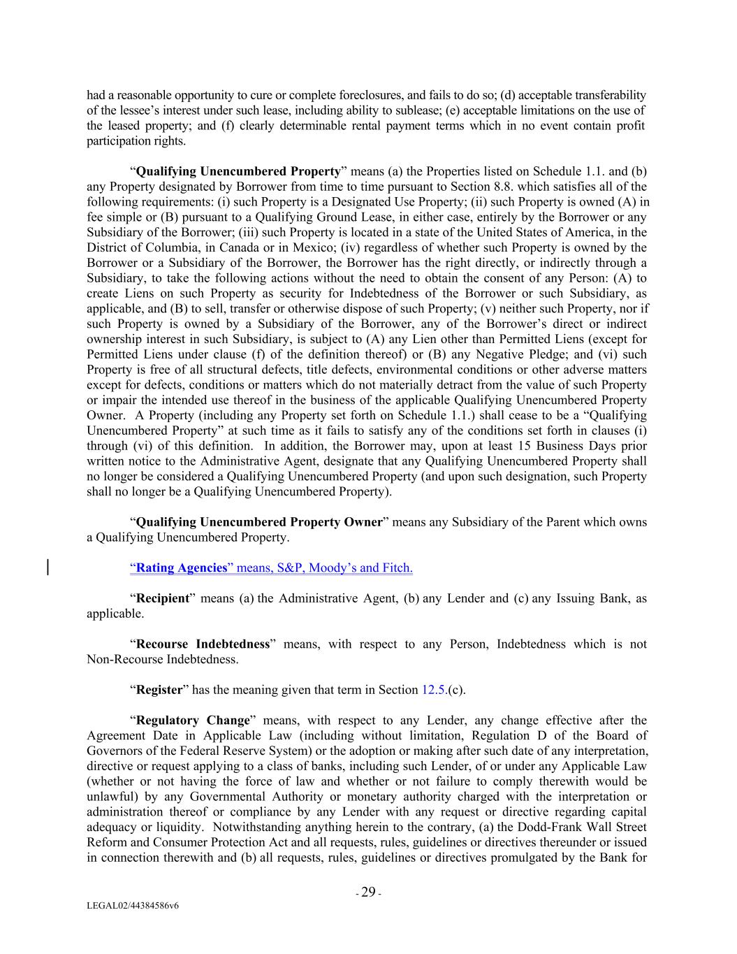 had a reasonable opportunity to cure or complete foreclosures, and fails to do so; (d) acceptable transferability of the lessee’s interest under such lease, including ability to sublease; (e) acceptable limitations on the use of the leased property; and (f) clearly determinable rental payment terms which in no event contain profit participation rights. “Qualifying Unencumbered Property” means (a) the Properties listed on Schedule 1.1. and (b) any Property designated by Borrower from time to time pursuant to Section 8.8. which satisfies all of the following requirements: (i) such Property is a Designated Use Property; (ii) such Property is owned (A) in fee simple or (B) pursuant to a Qualifying Ground Lease, in either case, entirely by the Borrower or any Subsidiary of the Borrower; (iii) such Property is located in a state of the United States of America, in the District of Columbia, in Canada or in Mexico; (iv) regardless of whether such Property is owned by the Borrower or a Subsidiary of the Borrower, the Borrower has the right directly, or indirectly through a Subsidiary, to take the following actions without the need to obtain the consent of any Person: (A) to create Liens on such Property as security for Indebtedness of the Borrower or such Subsidiary, as applicable, and (B) to sell, transfer or otherwise dispose of such Property; (v) neither such Property, nor if such Property is owned by a Subsidiary of the Borrower, any of the Borrower’s direct or indirect ownership interest in such Subsidiary, is subject to (A) any Lien other than Permitted Liens (except for Permitted Liens under clause (f) of the definition thereof) or (B) any Negative Pledge; and (vi) such Property is free of all structural defects, title defects, environmental conditions or other adverse matters except for defects, conditions or matters which do not materially detract from the value of such Property or impair the intended use thereof in the business of the applicable Qualifying Unencumbered Property Owner. A Property (including any Property set forth on Schedule 1.1.) shall cease to be a “Qualifying Unencumbered Property” at such time as it fails to satisfy any of the conditions set forth in clauses (i) through (vi) of this definition. In addition, the Borrower may, upon at least 15 Business Days prior written notice to the Administrative Agent, designate that any Qualifying Unencumbered Property shall no longer be considered a Qualifying Unencumbered Property (and upon such designation, such Property shall no longer be a Qualifying Unencumbered Property). “Qualifying Unencumbered Property Owner” means any Subsidiary of the Parent which owns a Qualifying Unencumbered Property. “Rating Agencies” means, S&P, Moody’s and Fitch. “Recipient” means (a) the Administrative Agent, (b) any Lender and (c) any Issuing Bank, as applicable. “Recourse Indebtedness” means, with respect to any Person, Indebtedness which is not Non-Recourse Indebtedness. “Register” has the meaning given that term in Section 12.5.(c). “Regulatory Change” means, with respect to any Lender, any change effective after the Agreement Date in Applicable Law (including without limitation, Regulation D of the Board of Governors of the Federal Reserve System) or the adoption or making after such date of any interpretation, directive or request applying to a class of banks, including such Lender, of or under any Applicable Law (whether or not having the force of law and whether or not failure to comply therewith would be unlawful) by any Governmental Authority or monetary authority charged with the interpretation or administration thereof or compliance by any Lender with any request or directive regarding capital adequacy or liquidity. Notwithstanding anything herein to the contrary, (a) the Dodd-Frank Wall Street Reform and Consumer Protection Act and all requests, rules, guidelines or directives thereunder or issued in connection therewith and (b) all requests, rules, guidelines or directives promulgated by the Bank for - 29 - LEGAL02/44384586v6