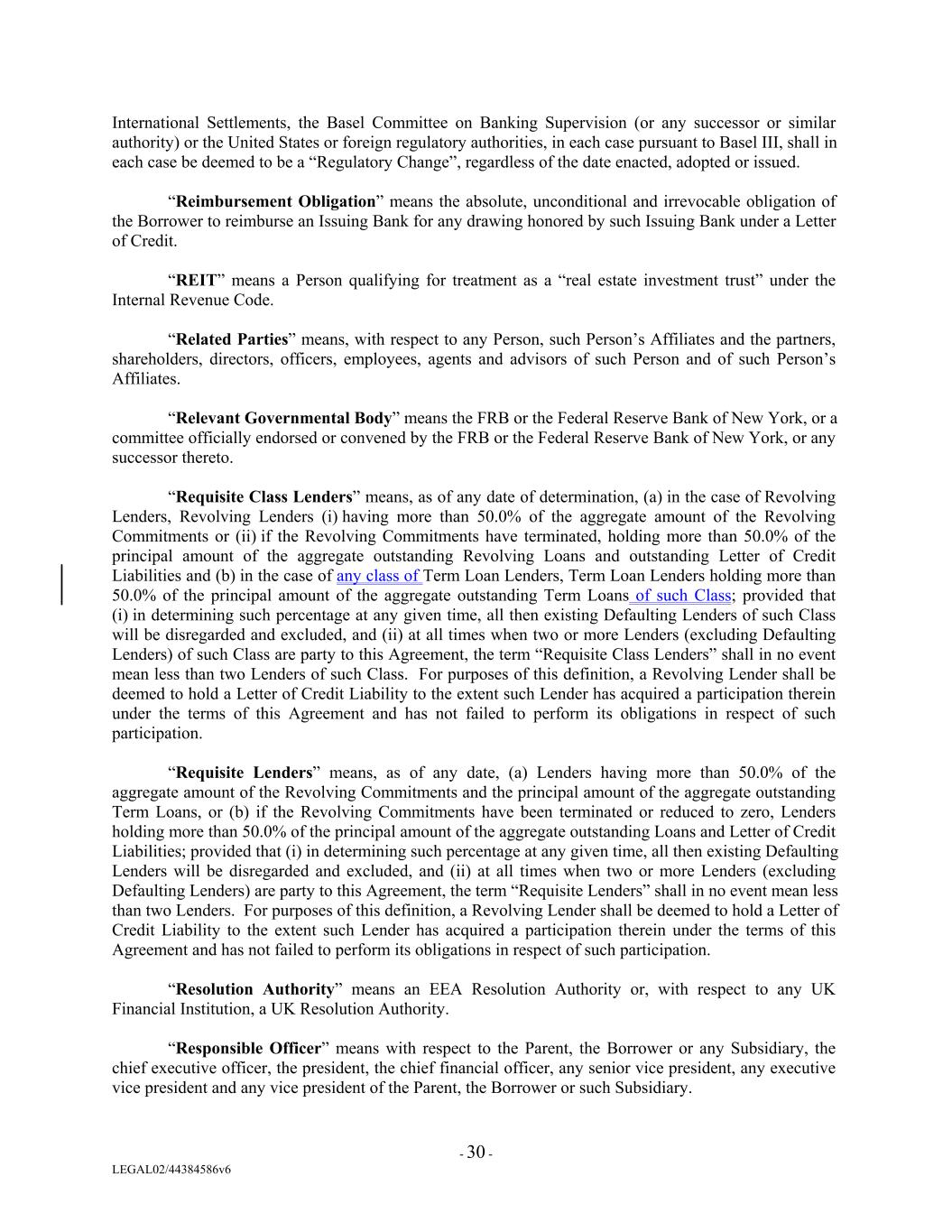International Settlements, the Basel Committee on Banking Supervision (or any successor or similar authority) or the United States or foreign regulatory authorities, in each case pursuant to Basel III, shall in each case be deemed to be a “Regulatory Change”, regardless of the date enacted, adopted or issued. “Reimbursement Obligation” means the absolute, unconditional and irrevocable obligation of the Borrower to reimburse an Issuing Bank for any drawing honored by such Issuing Bank under a Letter of Credit. “REIT” means a Person qualifying for treatment as a “real estate investment trust” under the Internal Revenue Code. “Related Parties” means, with respect to any Person, such Person’s Affiliates and the partners, shareholders, directors, officers, employees, agents and advisors of such Person and of such Person’s Affiliates. “Relevant Governmental Body” means the FRB or the Federal Reserve Bank of New York, or a committee officially endorsed or convened by the FRB or the Federal Reserve Bank of New York, or any successor thereto. “Requisite Class Lenders” means, as of any date of determination, (a) in the case of Revolving Lenders, Revolving Lenders (i) having more than 50.0% of the aggregate amount of the Revolving Commitments or (ii) if the Revolving Commitments have terminated, holding more than 50.0% of the principal amount of the aggregate outstanding Revolving Loans and outstanding Letter of Credit Liabilities and (b) in the case of any class of Term Loan Lenders, Term Loan Lenders holding more than 50.0% of the principal amount of the aggregate outstanding Term Loans of such Class; provided that (i) in determining such percentage at any given time, all then existing Defaulting Lenders of such Class will be disregarded and excluded, and (ii) at all times when two or more Lenders (excluding Defaulting Lenders) of such Class are party to this Agreement, the term “Requisite Class Lenders” shall in no event mean less than two Lenders of such Class. For purposes of this definition, a Revolving Lender shall be deemed to hold a Letter of Credit Liability to the extent such Lender has acquired a participation therein under the terms of this Agreement and has not failed to perform its obligations in respect of such participation. “Requisite Lenders” means, as of any date, (a) Lenders having more than 50.0% of the aggregate amount of the Revolving Commitments and the principal amount of the aggregate outstanding Term Loans, or (b) if the Revolving Commitments have been terminated or reduced to zero, Lenders holding more than 50.0% of the principal amount of the aggregate outstanding Loans and Letter of Credit Liabilities; provided that (i) in determining such percentage at any given time, all then existing Defaulting Lenders will be disregarded and excluded, and (ii) at all times when two or more Lenders (excluding Defaulting Lenders) are party to this Agreement, the term “Requisite Lenders” shall in no event mean less than two Lenders. For purposes of this definition, a Revolving Lender shall be deemed to hold a Letter of Credit Liability to the extent such Lender has acquired a participation therein under the terms of this Agreement and has not failed to perform its obligations in respect of such participation. “Resolution Authority” means an EEA Resolution Authority or, with respect to any UK Financial Institution, a UK Resolution Authority. “Responsible Officer” means with respect to the Parent, the Borrower or any Subsidiary, the chief executive officer, the president, the chief financial officer, any senior vice president, any executive vice president and any vice president of the Parent, the Borrower or such Subsidiary. - 30 - LEGAL02/44384586v6