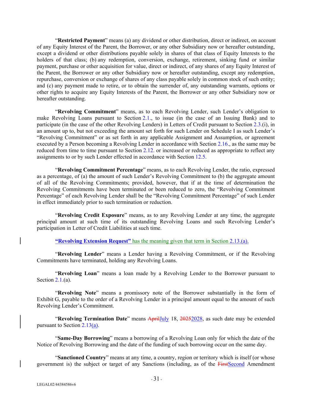 “Restricted Payment” means (a) any dividend or other distribution, direct or indirect, on account of any Equity Interest of the Parent, the Borrower, or any other Subsidiary now or hereafter outstanding, except a dividend or other distributions payable solely in shares of that class of Equity Interests to the holders of that class; (b) any redemption, conversion, exchange, retirement, sinking fund or similar payment, purchase or other acquisition for value, direct or indirect, of any shares of any Equity Interest of the Parent, the Borrower or any other Subsidiary now or hereafter outstanding, except any redemption, repurchase, conversion or exchange of shares of any class payable solely in common stock of such entity; and (c) any payment made to retire, or to obtain the surrender of, any outstanding warrants, options or other rights to acquire any Equity Interests of the Parent, the Borrower or any other Subsidiary now or hereafter outstanding. “Revolving Commitment” means, as to each Revolving Lender, such Lender’s obligation to make Revolving Loans pursuant to Section 2.1., to issue (in the case of an Issuing Bank) and to participate (in the case of the other Revolving Lenders) in Letters of Credit pursuant to Section 2.3.(i), in an amount up to, but not exceeding the amount set forth for such Lender on Schedule I as such Lender’s “Revolving Commitment” or as set forth in any applicable Assignment and Assumption, or agreement executed by a Person becoming a Revolving Lender in accordance with Section 2.16., as the same may be reduced from time to time pursuant to Section 2.12. or increased or reduced as appropriate to reflect any assignments to or by such Lender effected in accordance with Section 12.5. “Revolving Commitment Percentage” means, as to each Revolving Lender, the ratio, expressed as a percentage, of (a) the amount of such Lender’s Revolving Commitment to (b) the aggregate amount of all of the Revolving Commitments; provided, however, that if at the time of determination the Revolving Commitments have been terminated or been reduced to zero, the “Revolving Commitment Percentage” of each Revolving Lender shall be the “Revolving Commitment Percentage” of such Lender in effect immediately prior to such termination or reduction. “Revolving Credit Exposure” means, as to any Revolving Lender at any time, the aggregate principal amount at such time of its outstanding Revolving Loans and such Revolving Lender’s participation in Letter of Credit Liabilities at such time. “Revolving Extension Request” has the meaning given that term in Section 2.13.(a). “Revolving Lender” means a Lender having a Revolving Commitment, or if the Revolving Commitments have terminated, holding any Revolving Loans. “Revolving Loan” means a loan made by a Revolving Lender to the Borrower pursuant to Section 2.1.(a). “Revolving Note” means a promissory note of the Borrower substantially in the form of Exhibit G, payable to the order of a Revolving Lender in a principal amount equal to the amount of such Revolving Lender’s Commitment. “Revolving Termination Date” means AprilJuly 18, 20252028, as such date may be extended pursuant to Section 2.13(a). “Same-Day Borrowing” means a borrowing of a Revolving Loan only for which the date of the Notice of Revolving Borrowing and the date of the funding of such borrowing occur on the same day. “Sanctioned Country” means at any time, a country, region or territory which is itself (or whose government is) the subject or target of any Sanctions (including, as of the FirstSecond Amendment - 31 - LEGAL02/44384586v6