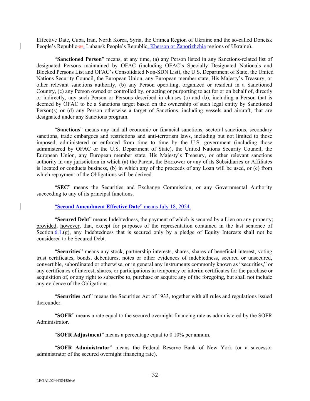 Effective Date, Cuba, Iran, North Korea, Syria, the Crimea Region of Ukraine and the so-called Donetsk People’s Republic or, Luhansk People’s Republic, Kherson or Zaporizhzhia regions of Ukraine). “Sanctioned Person” means, at any time, (a) any Person listed in any Sanctions-related list of designated Persons maintained by OFAC (including OFAC’s Specially Designated Nationals and Blocked Persons List and OFAC’s Consolidated Non-SDN List), the U.S. Department of State, the United Nations Security Council, the European Union, any European member state, His Majesty’s Treasury, or other relevant sanctions authority, (b) any Person operating, organized or resident in a Sanctioned Country, (c) any Person owned or controlled by, or acting or purporting to act for or on behalf of, directly or indirectly, any such Person or Persons described in clauses (a) and (b), including a Person that is deemed by OFAC to be a Sanctions target based on the ownership of such legal entity by Sanctioned Person(s) or (d) any Person otherwise a target of Sanctions, including vessels and aircraft, that are designated under any Sanctions program. “Sanctions” means any and all economic or financial sanctions, sectoral sanctions, secondary sanctions, trade embargoes and restrictions and anti-terrorism laws, including but not limited to those imposed, administered or enforced from time to time by the U.S. government (including those administered by OFAC or the U.S. Department of State), the United Nations Security Council, the European Union, any European member state, His Majesty’s Treasury, or other relevant sanctions authority in any jurisdiction in which (a) the Parent, the Borrower or any of its Subsidiaries or Affiliates is located or conducts business, (b) in which any of the proceeds of any Loan will be used, or (c) from which repayment of the Obligations will be derived. “SEC” means the Securities and Exchange Commission, or any Governmental Authority succeeding to any of its principal functions. “Second Amendment Effective Date” means July 18, 2024. “Secured Debt” means Indebtedness, the payment of which is secured by a Lien on any property; provided, however, that, except for purposes of the representation contained in the last sentence of Section 6.1.(g), any Indebtedness that is secured only by a pledge of Equity Interests shall not be considered to be Secured Debt. “Securities” means any stock, partnership interests, shares, shares of beneficial interest, voting trust certificates, bonds, debentures, notes or other evidences of indebtedness, secured or unsecured, convertible, subordinated or otherwise, or in general any instruments commonly known as “securities,” or any certificates of interest, shares, or participations in temporary or interim certificates for the purchase or acquisition of, or any right to subscribe to, purchase or acquire any of the foregoing, but shall not include any evidence of the Obligations. “Securities Act” means the Securities Act of 1933, together with all rules and regulations issued thereunder. “SOFR” means a rate equal to the secured overnight financing rate as administered by the SOFR Administrator. “SOFR Adjustment” means a percentage equal to 0.10% per annum. “SOFR Administrator” means the Federal Reserve Bank of New York (or a successor administrator of the secured overnight financing rate). - 32 - LEGAL02/44384586v6