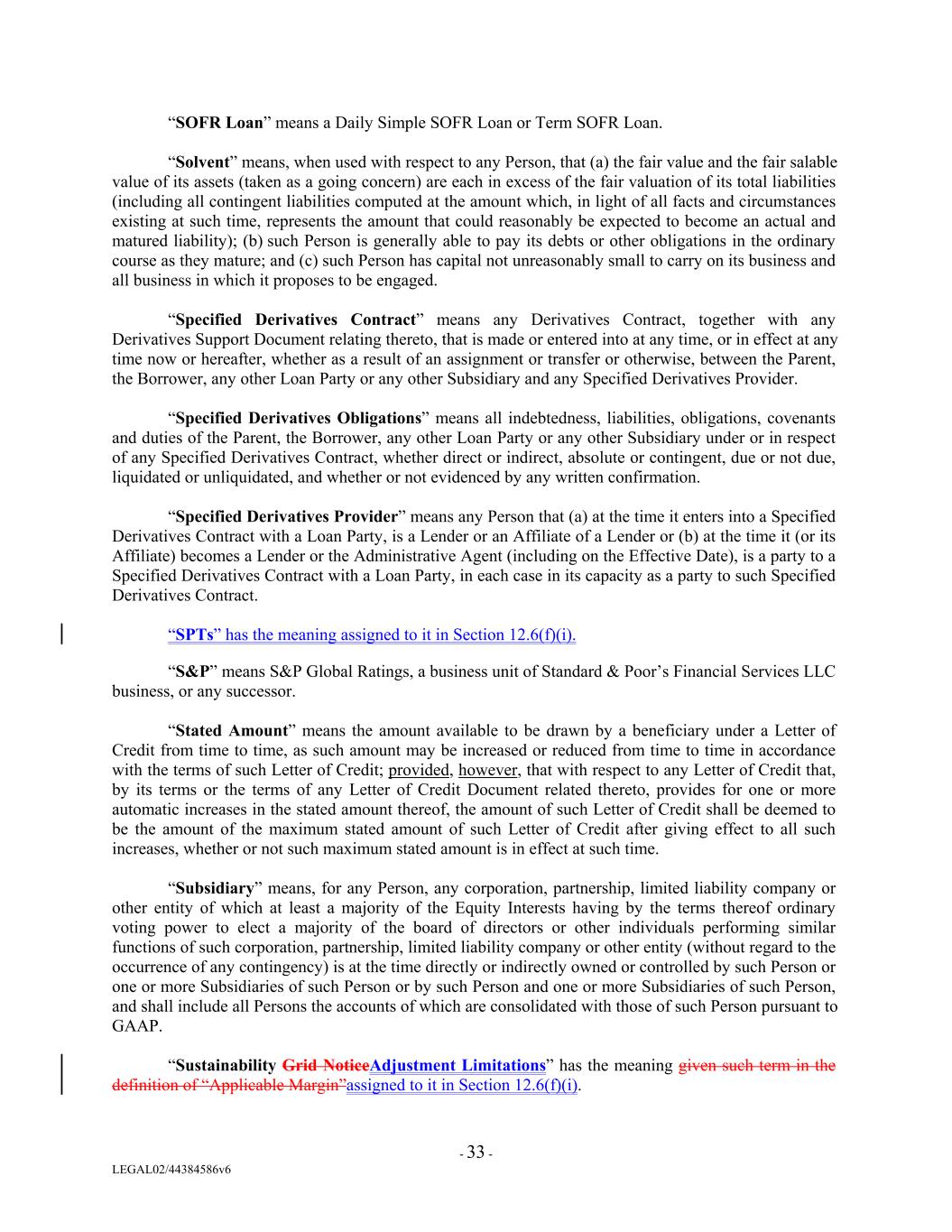 “SOFR Loan” means a Daily Simple SOFR Loan or Term SOFR Loan. “Solvent” means, when used with respect to any Person, that (a) the fair value and the fair salable value of its assets (taken as a going concern) are each in excess of the fair valuation of its total liabilities (including all contingent liabilities computed at the amount which, in light of all facts and circumstances existing at such time, represents the amount that could reasonably be expected to become an actual and matured liability); (b) such Person is generally able to pay its debts or other obligations in the ordinary course as they mature; and (c) such Person has capital not unreasonably small to carry on its business and all business in which it proposes to be engaged. “Specified Derivatives Contract” means any Derivatives Contract, together with any Derivatives Support Document relating thereto, that is made or entered into at any time, or in effect at any time now or hereafter, whether as a result of an assignment or transfer or otherwise, between the Parent, the Borrower, any other Loan Party or any other Subsidiary and any Specified Derivatives Provider. “Specified Derivatives Obligations” means all indebtedness, liabilities, obligations, covenants and duties of the Parent, the Borrower, any other Loan Party or any other Subsidiary under or in respect of any Specified Derivatives Contract, whether direct or indirect, absolute or contingent, due or not due, liquidated or unliquidated, and whether or not evidenced by any written confirmation. “Specified Derivatives Provider” means any Person that (a) at the time it enters into a Specified Derivatives Contract with a Loan Party, is a Lender or an Affiliate of a Lender or (b) at the time it (or its Affiliate) becomes a Lender or the Administrative Agent (including on the Effective Date), is a party to a Specified Derivatives Contract with a Loan Party, in each case in its capacity as a party to such Specified Derivatives Contract. “SPTs” has the meaning assigned to it in Section 12.6(f)(i). “S&P” means S&P Global Ratings, a business unit of Standard & Poor’s Financial Services LLC business, or any successor. “Stated Amount” means the amount available to be drawn by a beneficiary under a Letter of Credit from time to time, as such amount may be increased or reduced from time to time in accordance with the terms of such Letter of Credit; provided, however, that with respect to any Letter of Credit that, by its terms or the terms of any Letter of Credit Document related thereto, provides for one or more automatic increases in the stated amount thereof, the amount of such Letter of Credit shall be deemed to be the amount of the maximum stated amount of such Letter of Credit after giving effect to all such increases, whether or not such maximum stated amount is in effect at such time. “Subsidiary” means, for any Person, any corporation, partnership, limited liability company or other entity of which at least a majority of the Equity Interests having by the terms thereof ordinary voting power to elect a majority of the board of directors or other individuals performing similar functions of such corporation, partnership, limited liability company or other entity (without regard to the occurrence of any contingency) is at the time directly or indirectly owned or controlled by such Person or one or more Subsidiaries of such Person or by such Person and one or more Subsidiaries of such Person, and shall include all Persons the accounts of which are consolidated with those of such Person pursuant to GAAP. “Sustainability Grid NoticeAdjustment Limitations” has the meaning given such term in the definition of “Applicable Margin”assigned to it in Section 12.6(f)(i). - 33 - LEGAL02/44384586v6