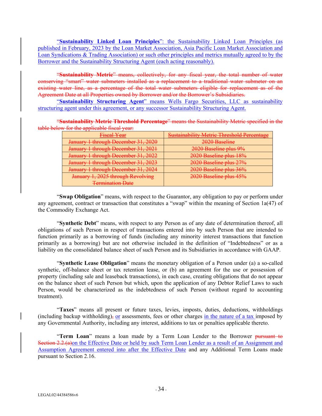 - 34 - LEGAL02/44384586v6 January 1 through December 31, 2022 2020 Baseline plus 18% January 1 through December 31, 2020 January 1 through December 31, 2023 2020 Baseline 2020 Baseline plus 27% Fiscal Year January 1 through December 31, 2024 2020 Baseline plus 36% January 1 through December 31, 2021 Sustainability Metric Threshold Percentage January 1, 2025 through Revolving Termination Date 2020 Baseline plus 9% 2020 Baseline plus 45% “Sustainability Linked Loan Principles”: the Sustainability Linked Loan Principles (as published in February, 2023 by the Loan Market Association, Asia Pacific Loan Market Association and Loan Syndications & Trading Association) or such other principles and metrics mutually agreed to by the Borrower and the Sustainability Structuring Agent (each acting reasonably). “Sustainability Metric” means, collectively, for any fiscal year, the total number of water conserving “smart” water submeters installed as a replacement to a traditional water submeter on an existing water line, as a percentage of the total water submeters eligible for replacement as of the Agreement Date at all Properties owned by Borrower and/or the Borrower’s Subsidiaries. “Sustainability Structuring Agent” means Wells Fargo Securities, LLC as sustainability structuring agent under this agreement, or any successor Sustainability Structuring Agent. “Sustainability Metric Threshold Percentage” means the Sustainability Metric specified in the table below for the applicable fiscal year: “Swap Obligation” means, with respect to the Guarantor, any obligation to pay or perform under any agreement, contract or transaction that constitutes a “swap” within the meaning of Section 1a(47) of the Commodity Exchange Act. “Synthetic Debt” means, with respect to any Person as of any date of determination thereof, all obligations of such Person in respect of transactions entered into by such Person that are intended to function primarily as a borrowing of funds (including any minority interest transactions that function primarily as a borrowing) but are not otherwise included in the definition of “Indebtedness” or as a liability on the consolidated balance sheet of such Person and its Subsidiaries in accordance with GAAP. “Synthetic Lease Obligation” means the monetary obligation of a Person under (a) a so-called synthetic, off-balance sheet or tax retention lease, or (b) an agreement for the use or possession of property (including sale and leaseback transactions), in each case, creating obligations that do not appear on the balance sheet of such Person but which, upon the application of any Debtor Relief Laws to such Person, would be characterized as the indebtedness of such Person (without regard to accounting treatment). “Taxes” means all present or future taxes, levies, imposts, duties, deductions, withholdings (including backup withholding), or assessments, fees or other charges in the nature of a tax imposed by any Governmental Authority, including any interest, additions to tax or penalties applicable thereto. “Term Loan” means a loan made by a Term Loan Lender to the Borrower pursuant to Section 2.2.(a)on the Effective Date or held by such Term Loan Lender as a result of an Assignment and Assumption Agreement entered into after the Effective Date and any Additional Term Loans made pursuant to Section 2.16.