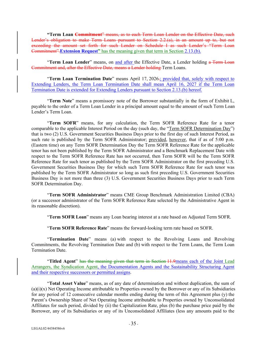 “Term Loan Commitment” means, as to each Term Loan Lender on the Effective Date, such Lender’s obligation to make Term Loans pursuant to Section 2.2.(a), in an amount up to, but not exceeding the amount set forth for such Lender on Schedule I as such Lender’s “Term Loan Commitment”.Extension Request” has the meaning given that term in Section 2.13.(b). “Term Loan Lender” means, on and after the Effective Date, a Lender holding a Term Loan Commitment and, after the Effective Date, means a Lender holding Term Loans. “Term Loan Termination Date” means April 17, 2026.; provided that, solely with respect to Extending Lenders, the Term Loan Termination Date shall mean April 16, 2027 if the Term Loan Termination Date is extended for Extending Lenders pursuant to Section 2.13.(b) hereof. “Term Note” means a promissory note of the Borrower substantially in the form of Exhibit L, payable to the order of a Term Loan Lender in a principal amount equal to the amount of such Term Loan Lender’s Term Loan. “Term SOFR” means, for any calculation, the Term SOFR Reference Rate for a tenor comparable to the applicable Interest Period on the day (such day, the “Term SOFR Determination Day”) that is two (2) U.S. Government Securities Business Days prior to the first day of such Interest Period, as such rate is published by the Term SOFR Administrator; provided, however, that if as of 5:00 p.m. (Eastern time) on any Term SOFR Determination Day the Term SOFR Reference Rate for the applicable tenor has not been published by the Term SOFR Administrator and a Benchmark Replacement Date with respect to the Term SOFR Reference Rate has not occurred, then Term SOFR will be the Term SOFR Reference Rate for such tenor as published by the Term SOFR Administrator on the first preceding U.S. Government Securities Business Day for which such Term SOFR Reference Rate for such tenor was published by the Term SOFR Administrator so long as such first preceding U.S. Government Securities Business Day is not more than three (3) U.S. Government Securities Business Days prior to such Term SOFR Determination Day. “Term SOFR Administrator” means CME Group Benchmark Administration Limited (CBA) (or a successor administrator of the Term SOFR Reference Rate selected by the Administrative Agent in its reasonable discretion). “Term SOFR Loan” means any Loan bearing interest at a rate based on Adjusted Term SOFR. “Term SOFR Reference Rate” means the forward-looking term rate based on SOFR. “Termination Date” means (a) with respect to the Revolving Loans and Revolving Commitments, the Revolving Termination Date and (b) with respect to the Term Loans, the Term Loan Termination Date. “Titled Agent” has the meaning given that term in Section 11.9means each of the Joint Lead Arrangers, the Syndication Agent, the Documentation Agents and the Sustainability Structuring Agent and their respective successors or permitted assigns. “Total Asset Value” means, as of any date of determination and without duplication, the sum of (a)(i)(x) Net Operating Income attributable to Properties owned by the Borrower or any of its Subsidiaries for any period of 12 consecutive calendar months ending during the term of this Agreement plus (y) the Parent’s Ownership Share of Net Operating Income attributable to Properties owned by Unconsolidated Affiliates for such period, divided by (ii) the Capitalization Rate, plus (b) the purchase price paid by the Borrower, any of its Subsidiaries or any of its Unconsolidated Affiliates (less any amounts paid to the - 35 - LEGAL02/44384586v6