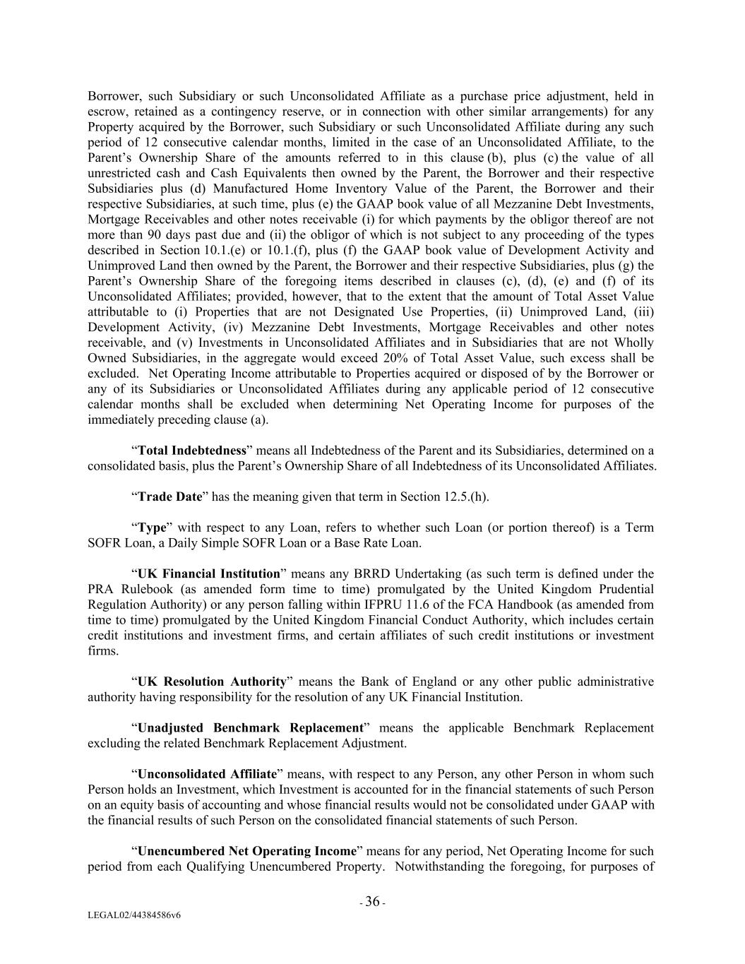 Borrower, such Subsidiary or such Unconsolidated Affiliate as a purchase price adjustment, held in escrow, retained as a contingency reserve, or in connection with other similar arrangements) for any Property acquired by the Borrower, such Subsidiary or such Unconsolidated Affiliate during any such period of 12 consecutive calendar months, limited in the case of an Unconsolidated Affiliate, to the Parent’s Ownership Share of the amounts referred to in this clause (b), plus (c) the value of all unrestricted cash and Cash Equivalents then owned by the Parent, the Borrower and their respective Subsidiaries plus (d) Manufactured Home Inventory Value of the Parent, the Borrower and their respective Subsidiaries, at such time, plus (e) the GAAP book value of all Mezzanine Debt Investments, Mortgage Receivables and other notes receivable (i) for which payments by the obligor thereof are not more than 90 days past due and (ii) the obligor of which is not subject to any proceeding of the types described in Section 10.1.(e) or 10.1.(f), plus (f) the GAAP book value of Development Activity and Unimproved Land then owned by the Parent, the Borrower and their respective Subsidiaries, plus (g) the Parent’s Ownership Share of the foregoing items described in clauses (c), (d), (e) and (f) of its Unconsolidated Affiliates; provided, however, that to the extent that the amount of Total Asset Value attributable to (i) Properties that are not Designated Use Properties, (ii) Unimproved Land, (iii) Development Activity, (iv) Mezzanine Debt Investments, Mortgage Receivables and other notes receivable, and (v) Investments in Unconsolidated Affiliates and in Subsidiaries that are not Wholly Owned Subsidiaries, in the aggregate would exceed 20% of Total Asset Value, such excess shall be excluded. Net Operating Income attributable to Properties acquired or disposed of by the Borrower or any of its Subsidiaries or Unconsolidated Affiliates during any applicable period of 12 consecutive calendar months shall be excluded when determining Net Operating Income for purposes of the immediately preceding clause (a). “Total Indebtedness” means all Indebtedness of the Parent and its Subsidiaries, determined on a consolidated basis, plus the Parent’s Ownership Share of all Indebtedness of its Unconsolidated Affiliates. “Trade Date” has the meaning given that term in Section 12.5.(h). “Type” with respect to any Loan, refers to whether such Loan (or portion thereof) is a Term SOFR Loan, a Daily Simple SOFR Loan or a Base Rate Loan. “UK Financial Institution” means any BRRD Undertaking (as such term is defined under the PRA Rulebook (as amended form time to time) promulgated by the United Kingdom Prudential Regulation Authority) or any person falling within IFPRU 11.6 of the FCA Handbook (as amended from time to time) promulgated by the United Kingdom Financial Conduct Authority, which includes certain credit institutions and investment firms, and certain affiliates of such credit institutions or investment firms. “UK Resolution Authority” means the Bank of England or any other public administrative authority having responsibility for the resolution of any UK Financial Institution. “Unadjusted Benchmark Replacement” means the applicable Benchmark Replacement excluding the related Benchmark Replacement Adjustment. “Unconsolidated Affiliate” means, with respect to any Person, any other Person in whom such Person holds an Investment, which Investment is accounted for in the financial statements of such Person on an equity basis of accounting and whose financial results would not be consolidated under GAAP with the financial results of such Person on the consolidated financial statements of such Person. “Unencumbered Net Operating Income” means for any period, Net Operating Income for such period from each Qualifying Unencumbered Property. Notwithstanding the foregoing, for purposes of - 36 - LEGAL02/44384586v6