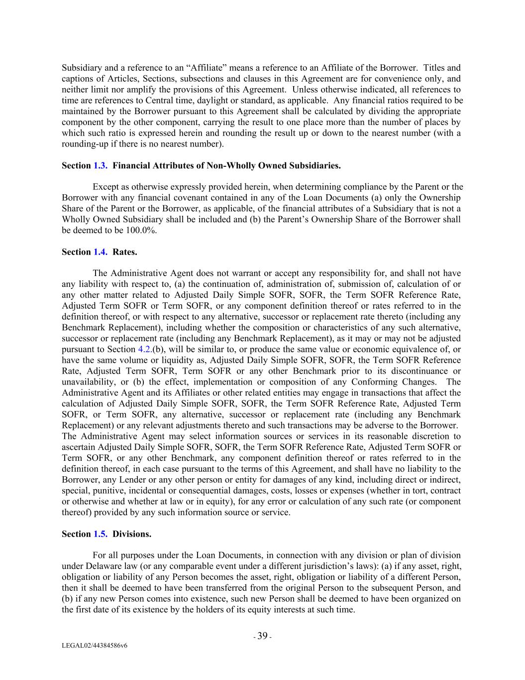 Subsidiary and a reference to an “Affiliate” means a reference to an Affiliate of the Borrower. Titles and captions of Articles, Sections, subsections and clauses in this Agreement are for convenience only, and neither limit nor amplify the provisions of this Agreement. Unless otherwise indicated, all references to time are references to Central time, daylight or standard, as applicable. Any financial ratios required to be maintained by the Borrower pursuant to this Agreement shall be calculated by dividing the appropriate component by the other component, carrying the result to one place more than the number of places by which such ratio is expressed herein and rounding the result up or down to the nearest number (with a rounding-up if there is no nearest number). Section 1.3. Financial Attributes of Non-Wholly Owned Subsidiaries. Except as otherwise expressly provided herein, when determining compliance by the Parent or the Borrower with any financial covenant contained in any of the Loan Documents (a) only the Ownership Share of the Parent or the Borrower, as applicable, of the financial attributes of a Subsidiary that is not a Wholly Owned Subsidiary shall be included and (b) the Parent’s Ownership Share of the Borrower shall be deemed to be 100.0%. Section 1.4. Rates. The Administrative Agent does not warrant or accept any responsibility for, and shall not have any liability with respect to, (a) the continuation of, administration of, submission of, calculation of or any other matter related to Adjusted Daily Simple SOFR, SOFR, the Term SOFR Reference Rate, Adjusted Term SOFR or Term SOFR, or any component definition thereof or rates referred to in the definition thereof, or with respect to any alternative, successor or replacement rate thereto (including any Benchmark Replacement), including whether the composition or characteristics of any such alternative, successor or replacement rate (including any Benchmark Replacement), as it may or may not be adjusted pursuant to Section 4.2.(b), will be similar to, or produce the same value or economic equivalence of, or have the same volume or liquidity as, Adjusted Daily Simple SOFR, SOFR, the Term SOFR Reference Rate, Adjusted Term SOFR, Term SOFR or any other Benchmark prior to its discontinuance or unavailability, or (b) the effect, implementation or composition of any Conforming Changes. The Administrative Agent and its Affiliates or other related entities may engage in transactions that affect the calculation of Adjusted Daily Simple SOFR, SOFR, the Term SOFR Reference Rate, Adjusted Term SOFR, or Term SOFR, any alternative, successor or replacement rate (including any Benchmark Replacement) or any relevant adjustments thereto and such transactions may be adverse to the Borrower. The Administrative Agent may select information sources or services in its reasonable discretion to ascertain Adjusted Daily Simple SOFR, SOFR, the Term SOFR Reference Rate, Adjusted Term SOFR or Term SOFR, or any other Benchmark, any component definition thereof or rates referred to in the definition thereof, in each case pursuant to the terms of this Agreement, and shall have no liability to the Borrower, any Lender or any other person or entity for damages of any kind, including direct or indirect, special, punitive, incidental or consequential damages, costs, losses or expenses (whether in tort, contract or otherwise and whether at law or in equity), for any error or calculation of any such rate (or component thereof) provided by any such information source or service. Section 1.5. Divisions. For all purposes under the Loan Documents, in connection with any division or plan of division under Delaware law (or any comparable event under a different jurisdiction’s laws): (a) if any asset, right, obligation or liability of any Person becomes the asset, right, obligation or liability of a different Person, then it shall be deemed to have been transferred from the original Person to the subsequent Person, and (b) if any new Person comes into existence, such new Person shall be deemed to have been organized on the first date of its existence by the holders of its equity interests at such time. - 39 - LEGAL02/44384586v6