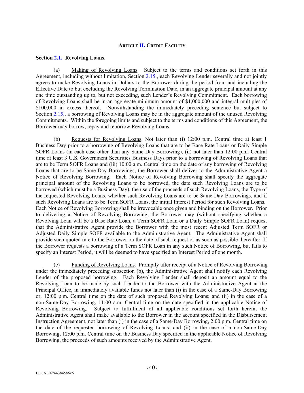 ARTICLE II. CREDIT FACILITY Section 2.1. Revolving Loans. (a) Making of Revolving Loans. Subject to the terms and conditions set forth in this Agreement, including without limitation, Section 2.15., each Revolving Lender severally and not jointly agrees to make Revolving Loans in Dollars to the Borrower during the period from and including the Effective Date to but excluding the Revolving Termination Date, in an aggregate principal amount at any one time outstanding up to, but not exceeding, such Lender’s Revolving Commitment. Each borrowing of Revolving Loans shall be in an aggregate minimum amount of $1,000,000 and integral multiples of $100,000 in excess thereof. Notwithstanding the immediately preceding sentence but subject to Section 2.15., a borrowing of Revolving Loans may be in the aggregate amount of the unused Revolving Commitments. Within the foregoing limits and subject to the terms and conditions of this Agreement, the Borrower may borrow, repay and reborrow Revolving Loans. (b) Requests for Revolving Loans. Not later than (i) 12:00 p.m. Central time at least 1 Business Day prior to a borrowing of Revolving Loans that are to be Base Rate Loans or Daily Simple SOFR Loans (in each case other than any Same-Day Borrowing), (ii) not later than 12:00 p.m. Central time at least 3 U.S. Government Securities Business Days prior to a borrowing of Revolving Loans that are to be Term SOFR Loans and (iii) 10:00 a.m. Central time on the date of any borrowing of Revolving Loans that are to be Same-Day Borrowings, the Borrower shall deliver to the Administrative Agent a Notice of Revolving Borrowing. Each Notice of Revolving Borrowing shall specify the aggregate principal amount of the Revolving Loans to be borrowed, the date such Revolving Loans are to be borrowed (which must be a Business Day), the use of the proceeds of such Revolving Loans, the Type of the requested Revolving Loans, whether such Revolving Loans are to be Same-Day Borrowings, and if such Revolving Loans are to be Term SOFR Loans, the initial Interest Period for such Revolving Loans. Each Notice of Revolving Borrowing shall be irrevocable once given and binding on the Borrower. Prior to delivering a Notice of Revolving Borrowing, the Borrower may (without specifying whether a Revolving Loan will be a Base Rate Loan, a Term SOFR Loan or a Daily Simple SOFR Loan) request that the Administrative Agent provide the Borrower with the most recent Adjusted Term SOFR or Adjusted Daily Simple SOFR available to the Administrative Agent. The Administrative Agent shall provide such quoted rate to the Borrower on the date of such request or as soon as possible thereafter. If the Borrower requests a borrowing of a Term SOFR Loan in any such Notice of Borrowing, but fails to specify an Interest Period, it will be deemed to have specified an Interest Period of one month. (c) Funding of Revolving Loans. Promptly after receipt of a Notice of Revolving Borrowing under the immediately preceding subsection (b), the Administrative Agent shall notify each Revolving Lender of the proposed borrowing. Each Revolving Lender shall deposit an amount equal to the Revolving Loan to be made by such Lender to the Borrower with the Administrative Agent at the Principal Office, in immediately available funds not later than (i) in the case of a Same-Day Borrowing or, 12:00 p.m. Central time on the date of such proposed Revolving Loans; and (ii) in the case of a non-Same-Day Borrowing, 11:00 a.m. Central time on the date specified in the applicable Notice of Revolving Borrowing. Subject to fulfillment of all applicable conditions set forth herein, the Administrative Agent shall make available to the Borrower in the account specified in the Disbursement Instruction Agreement, not later than (i) in the case of a Same-Day Borrowing, 2:00 p.m. Central time on the date of the requested borrowing of Revolving Loans; and (ii) in the case of a non-Same-Day Borrowing, 12:00 p.m. Central time on the Business Day specified in the applicable Notice of Revolving Borrowing, the proceeds of such amounts received by the Administrative Agent. - 40 - LEGAL02/44384586v6