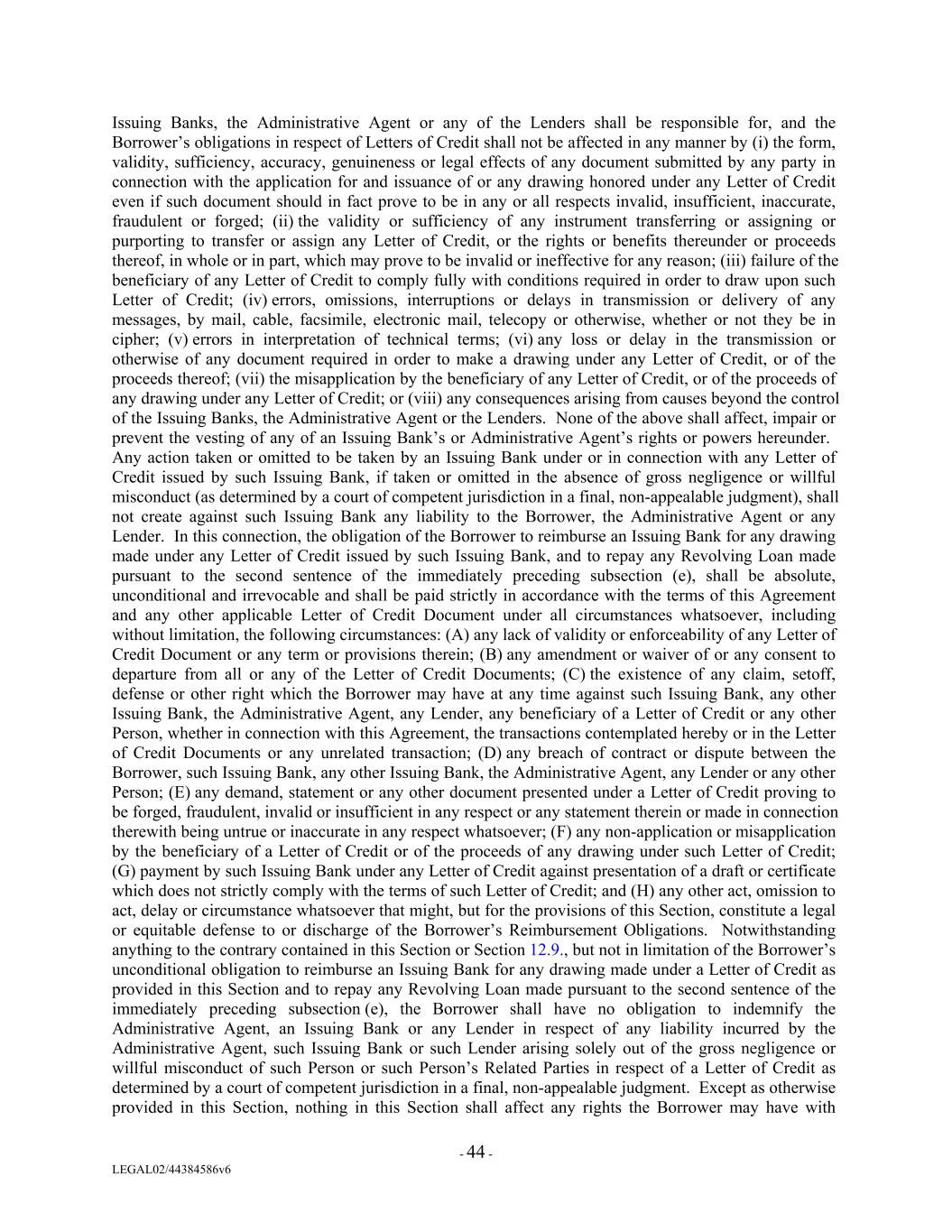 Issuing Banks, the Administrative Agent or any of the Lenders shall be responsible for, and the Borrower’s obligations in respect of Letters of Credit shall not be affected in any manner by (i) the form, validity, sufficiency, accuracy, genuineness or legal effects of any document submitted by any party in connection with the application for and issuance of or any drawing honored under any Letter of Credit even if such document should in fact prove to be in any or all respects invalid, insufficient, inaccurate, fraudulent or forged; (ii) the validity or sufficiency of any instrument transferring or assigning or purporting to transfer or assign any Letter of Credit, or the rights or benefits thereunder or proceeds thereof, in whole or in part, which may prove to be invalid or ineffective for any reason; (iii) failure of the beneficiary of any Letter of Credit to comply fully with conditions required in order to draw upon such Letter of Credit; (iv) errors, omissions, interruptions or delays in transmission or delivery of any messages, by mail, cable, facsimile, electronic mail, telecopy or otherwise, whether or not they be in cipher; (v) errors in interpretation of technical terms; (vi) any loss or delay in the transmission or otherwise of any document required in order to make a drawing under any Letter of Credit, or of the proceeds thereof; (vii) the misapplication by the beneficiary of any Letter of Credit, or of the proceeds of any drawing under any Letter of Credit; or (viii) any consequences arising from causes beyond the control of the Issuing Banks, the Administrative Agent or the Lenders. None of the above shall affect, impair or prevent the vesting of any of an Issuing Bank’s or Administrative Agent’s rights or powers hereunder. Any action taken or omitted to be taken by an Issuing Bank under or in connection with any Letter of Credit issued by such Issuing Bank, if taken or omitted in the absence of gross negligence or willful misconduct (as determined by a court of competent jurisdiction in a final, non-appealable judgment), shall not create against such Issuing Bank any liability to the Borrower, the Administrative Agent or any Lender. In this connection, the obligation of the Borrower to reimburse an Issuing Bank for any drawing made under any Letter of Credit issued by such Issuing Bank, and to repay any Revolving Loan made pursuant to the second sentence of the immediately preceding subsection (e), shall be absolute, unconditional and irrevocable and shall be paid strictly in accordance with the terms of this Agreement and any other applicable Letter of Credit Document under all circumstances whatsoever, including without limitation, the following circumstances: (A) any lack of validity or enforceability of any Letter of Credit Document or any term or provisions therein; (B) any amendment or waiver of or any consent to departure from all or any of the Letter of Credit Documents; (C) the existence of any claim, setoff, defense or other right which the Borrower may have at any time against such Issuing Bank, any other Issuing Bank, the Administrative Agent, any Lender, any beneficiary of a Letter of Credit or any other Person, whether in connection with this Agreement, the transactions contemplated hereby or in the Letter of Credit Documents or any unrelated transaction; (D) any breach of contract or dispute between the Borrower, such Issuing Bank, any other Issuing Bank, the Administrative Agent, any Lender or any other Person; (E) any demand, statement or any other document presented under a Letter of Credit proving to be forged, fraudulent, invalid or insufficient in any respect or any statement therein or made in connection therewith being untrue or inaccurate in any respect whatsoever; (F) any non-application or misapplication by the beneficiary of a Letter of Credit or of the proceeds of any drawing under such Letter of Credit; (G) payment by such Issuing Bank under any Letter of Credit against presentation of a draft or certificate which does not strictly comply with the terms of such Letter of Credit; and (H) any other act, omission to act, delay or circumstance whatsoever that might, but for the provisions of this Section, constitute a legal or equitable defense to or discharge of the Borrower’s Reimbursement Obligations. Notwithstanding anything to the contrary contained in this Section or Section 12.9., but not in limitation of the Borrower’s unconditional obligation to reimburse an Issuing Bank for any drawing made under a Letter of Credit as provided in this Section and to repay any Revolving Loan made pursuant to the second sentence of the immediately preceding subsection (e), the Borrower shall have no obligation to indemnify the Administrative Agent, an Issuing Bank or any Lender in respect of any liability incurred by the Administrative Agent, such Issuing Bank or such Lender arising solely out of the gross negligence or willful misconduct of such Person or such Person’s Related Parties in respect of a Letter of Credit as determined by a court of competent jurisdiction in a final, non-appealable judgment. Except as otherwise provided in this Section, nothing in this Section shall affect any rights the Borrower may have with - 44 - LEGAL02/44384586v6