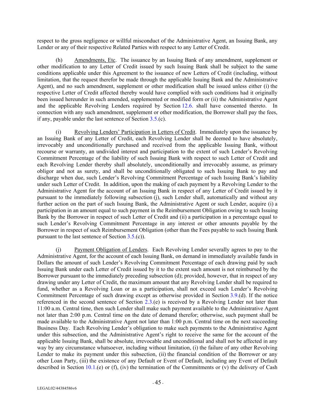 respect to the gross negligence or willful misconduct of the Administrative Agent, an Issuing Bank, any Lender or any of their respective Related Parties with respect to any Letter of Credit. (h) Amendments, Etc. The issuance by an Issuing Bank of any amendment, supplement or other modification to any Letter of Credit issued by such Issuing Bank shall be subject to the same conditions applicable under this Agreement to the issuance of new Letters of Credit (including, without limitation, that the request therefor be made through the applicable Issuing Bank and the Administrative Agent), and no such amendment, supplement or other modification shall be issued unless either (i) the respective Letter of Credit affected thereby would have complied with such conditions had it originally been issued hereunder in such amended, supplemented or modified form or (ii) the Administrative Agent and the applicable Revolving Lenders required by Section 12.6. shall have consented thereto. In connection with any such amendment, supplement or other modification, the Borrower shall pay the fees, if any, payable under the last sentence of Section 3.5.(c). (i) Revolving Lenders’ Participation in Letters of Credit. Immediately upon the issuance by an Issuing Bank of any Letter of Credit, each Revolving Lender shall be deemed to have absolutely, irrevocably and unconditionally purchased and received from the applicable Issuing Bank, without recourse or warranty, an undivided interest and participation to the extent of such Lender’s Revolving Commitment Percentage of the liability of such Issuing Bank with respect to such Letter of Credit and each Revolving Lender thereby shall absolutely, unconditionally and irrevocably assume, as primary obligor and not as surety, and shall be unconditionally obligated to such Issuing Bank to pay and discharge when due, such Lender’s Revolving Commitment Percentage of such Issuing Bank’s liability under such Letter of Credit. In addition, upon the making of each payment by a Revolving Lender to the Administrative Agent for the account of an Issuing Bank in respect of any Letter of Credit issued by it pursuant to the immediately following subsection (j), such Lender shall, automatically and without any further action on the part of such Issuing Bank, the Administrative Agent or such Lender, acquire (i) a participation in an amount equal to such payment in the Reimbursement Obligation owing to such Issuing Bank by the Borrower in respect of such Letter of Credit and (ii) a participation in a percentage equal to such Lender’s Revolving Commitment Percentage in any interest or other amounts payable by the Borrower in respect of such Reimbursement Obligation (other than the Fees payable to such Issuing Bank pursuant to the last sentence of Section 3.5.(c)). (j) Payment Obligation of Lenders. Each Revolving Lender severally agrees to pay to the Administrative Agent, for the account of each Issuing Bank, on demand in immediately available funds in Dollars the amount of such Lender’s Revolving Commitment Percentage of each drawing paid by such Issuing Bank under each Letter of Credit issued by it to the extent such amount is not reimbursed by the Borrower pursuant to the immediately preceding subsection (d); provided, however, that in respect of any drawing under any Letter of Credit, the maximum amount that any Revolving Lender shall be required to fund, whether as a Revolving Loan or as a participation, shall not exceed such Lender’s Revolving Commitment Percentage of such drawing except as otherwise provided in Section 3.9.(d). If the notice referenced in the second sentence of Section 2.3.(e) is received by a Revolving Lender not later than 11:00 a.m. Central time, then such Lender shall make such payment available to the Administrative Agent not later than 2:00 p.m. Central time on the date of demand therefor; otherwise, such payment shall be made available to the Administrative Agent not later than 1:00 p.m. Central time on the next succeeding Business Day. Each Revolving Lender’s obligation to make such payments to the Administrative Agent under this subsection, and the Administrative Agent’s right to receive the same for the account of the applicable Issuing Bank, shall be absolute, irrevocable and unconditional and shall not be affected in any way by any circumstance whatsoever, including without limitation, (i) the failure of any other Revolving Lender to make its payment under this subsection, (ii) the financial condition of the Borrower or any other Loan Party, (iii) the existence of any Default or Event of Default, including any Event of Default described in Section 10.1.(e) or (f), (iv) the termination of the Commitments or (v) the delivery of Cash - 45 - LEGAL02/44384586v6