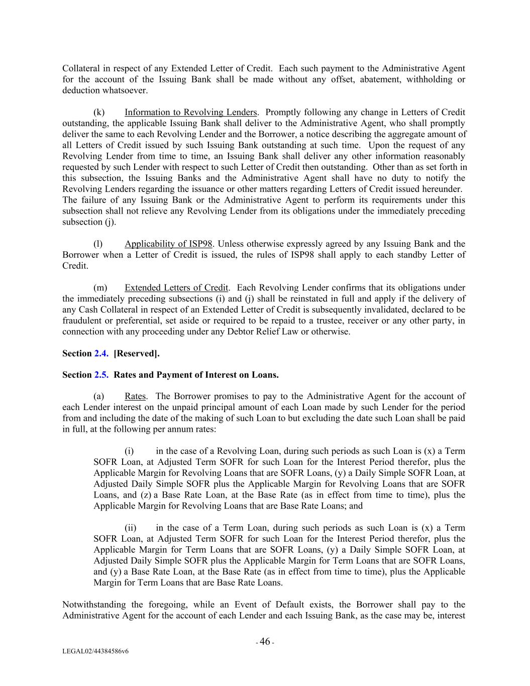 Collateral in respect of any Extended Letter of Credit. Each such payment to the Administrative Agent for the account of the Issuing Bank shall be made without any offset, abatement, withholding or deduction whatsoever. (k) Information to Revolving Lenders. Promptly following any change in Letters of Credit outstanding, the applicable Issuing Bank shall deliver to the Administrative Agent, who shall promptly deliver the same to each Revolving Lender and the Borrower, a notice describing the aggregate amount of all Letters of Credit issued by such Issuing Bank outstanding at such time. Upon the request of any Revolving Lender from time to time, an Issuing Bank shall deliver any other information reasonably requested by such Lender with respect to such Letter of Credit then outstanding. Other than as set forth in this subsection, the Issuing Banks and the Administrative Agent shall have no duty to notify the Revolving Lenders regarding the issuance or other matters regarding Letters of Credit issued hereunder. The failure of any Issuing Bank or the Administrative Agent to perform its requirements under this subsection shall not relieve any Revolving Lender from its obligations under the immediately preceding subsection (j). (l) Applicability of ISP98. Unless otherwise expressly agreed by any Issuing Bank and the Borrower when a Letter of Credit is issued, the rules of ISP98 shall apply to each standby Letter of Credit. (m) Extended Letters of Credit. Each Revolving Lender confirms that its obligations under the immediately preceding subsections (i) and (j) shall be reinstated in full and apply if the delivery of any Cash Collateral in respect of an Extended Letter of Credit is subsequently invalidated, declared to be fraudulent or preferential, set aside or required to be repaid to a trustee, receiver or any other party, in connection with any proceeding under any Debtor Relief Law or otherwise. Section 2.4. [Reserved]. Section 2.5. Rates and Payment of Interest on Loans. (a) Rates. The Borrower promises to pay to the Administrative Agent for the account of each Lender interest on the unpaid principal amount of each Loan made by such Lender for the period from and including the date of the making of such Loan to but excluding the date such Loan shall be paid in full, at the following per annum rates: (i) in the case of a Revolving Loan, during such periods as such Loan is (x) a Term SOFR Loan, at Adjusted Term SOFR for such Loan for the Interest Period therefor, plus the Applicable Margin for Revolving Loans that are SOFR Loans, (y) a Daily Simple SOFR Loan, at Adjusted Daily Simple SOFR plus the Applicable Margin for Revolving Loans that are SOFR Loans, and (z) a Base Rate Loan, at the Base Rate (as in effect from time to time), plus the Applicable Margin for Revolving Loans that are Base Rate Loans; and (ii) in the case of a Term Loan, during such periods as such Loan is (x) a Term SOFR Loan, at Adjusted Term SOFR for such Loan for the Interest Period therefor, plus the Applicable Margin for Term Loans that are SOFR Loans, (y) a Daily Simple SOFR Loan, at Adjusted Daily Simple SOFR plus the Applicable Margin for Term Loans that are SOFR Loans, and (y) a Base Rate Loan, at the Base Rate (as in effect from time to time), plus the Applicable Margin for Term Loans that are Base Rate Loans. Notwithstanding the foregoing, while an Event of Default exists, the Borrower shall pay to the Administrative Agent for the account of each Lender and each Issuing Bank, as the case may be, interest - 46 - LEGAL02/44384586v6
