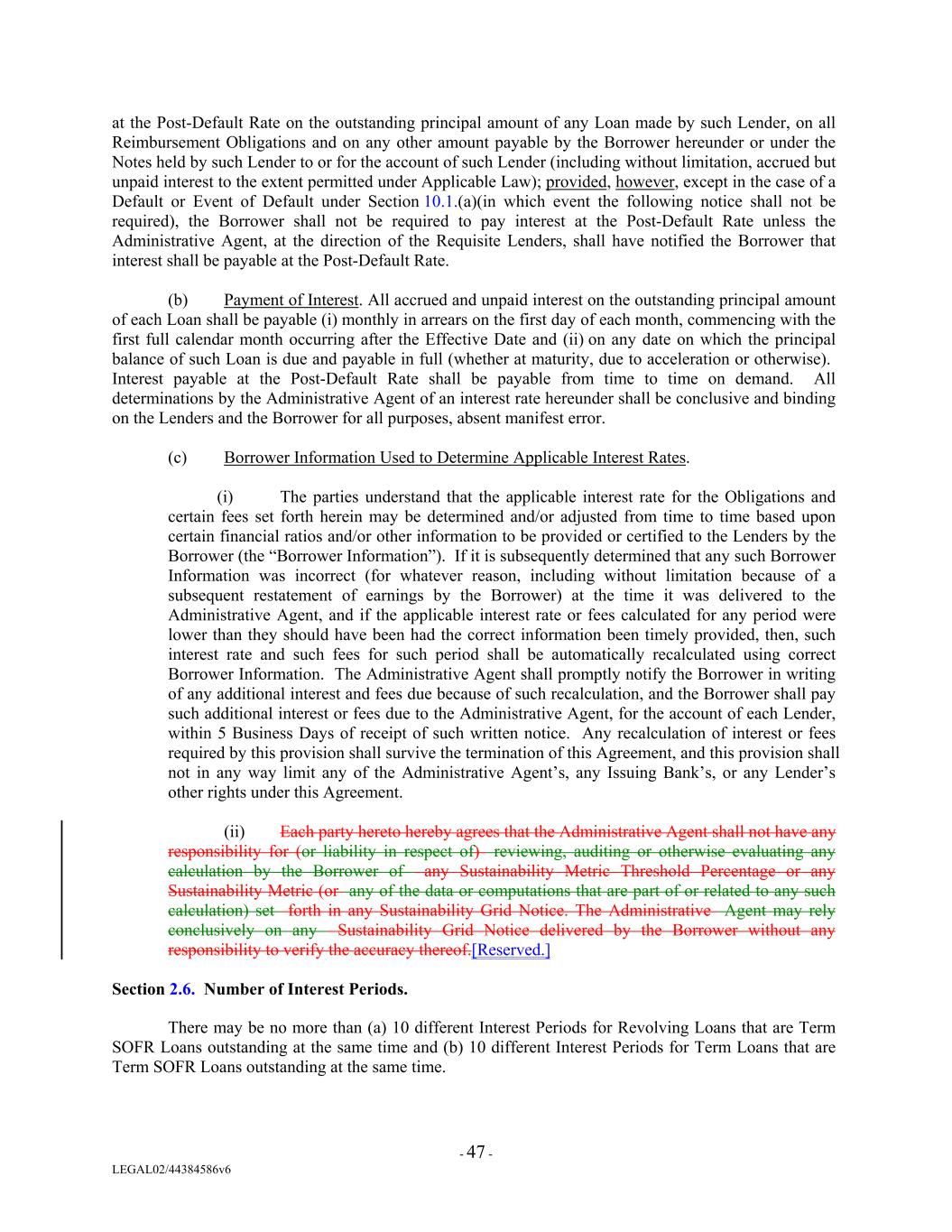 at the Post-Default Rate on the outstanding principal amount of any Loan made by such Lender, on all Reimbursement Obligations and on any other amount payable by the Borrower hereunder or under the Notes held by such Lender to or for the account of such Lender (including without limitation, accrued but unpaid interest to the extent permitted under Applicable Law); provided, however, except in the case of a Default or Event of Default under Section 10.1.(a)(in which event the following notice shall not be required), the Borrower shall not be required to pay interest at the Post-Default Rate unless the Administrative Agent, at the direction of the Requisite Lenders, shall have notified the Borrower that interest shall be payable at the Post-Default Rate. (b) Payment of Interest. All accrued and unpaid interest on the outstanding principal amount of each Loan shall be payable (i) monthly in arrears on the first day of each month, commencing with the first full calendar month occurring after the Effective Date and (ii) on any date on which the principal balance of such Loan is due and payable in full (whether at maturity, due to acceleration or otherwise). Interest payable at the Post-Default Rate shall be payable from time to time on demand. All determinations by the Administrative Agent of an interest rate hereunder shall be conclusive and binding on the Lenders and the Borrower for all purposes, absent manifest error. (c) Borrower Information Used to Determine Applicable Interest Rates. (i) The parties understand that the applicable interest rate for the Obligations and certain fees set forth herein may be determined and/or adjusted from time to time based upon certain financial ratios and/or other information to be provided or certified to the Lenders by the Borrower (the “Borrower Information”). If it is subsequently determined that any such Borrower Information was incorrect (for whatever reason, including without limitation because of a subsequent restatement of earnings by the Borrower) at the time it was delivered to the Administrative Agent, and if the applicable interest rate or fees calculated for any period were lower than they should have been had the correct information been timely provided, then, such interest rate and such fees for such period shall be automatically recalculated using correct Borrower Information. The Administrative Agent shall promptly notify the Borrower in writing of any additional interest and fees due because of such recalculation, and the Borrower shall pay such additional interest or fees due to the Administrative Agent, for the account of each Lender, within 5 Business Days of receipt of such written notice. Any recalculation of interest or fees required by this provision shall survive the termination of this Agreement, and this provision shall not in any way limit any of the Administrative Agent’s, any Issuing Bank’s, or any Lender’s other rights under this Agreement. (ii) Each party hereto hereby agrees that the Administrative Agent shall not have any responsibility for (or liability in respect of) reviewing, auditing or otherwise evaluating any calculation by the Borrower of any Sustainability Metric Threshold Percentage or any Sustainability Metric (or any of the data or computations that are part of or related to any such calculation) set forth in any Sustainability Grid Notice. The Administrative Agent may rely conclusively on any Sustainability Grid Notice delivered by the Borrower without any responsibility to verify the accuracy thereof.[Reserved.] Section 2.6. Number of Interest Periods. There may be no more than (a) 10 different Interest Periods for Revolving Loans that are Term SOFR Loans outstanding at the same time and (b) 10 different Interest Periods for Term Loans that are Term SOFR Loans outstanding at the same time. - 47 - LEGAL02/44384586v6