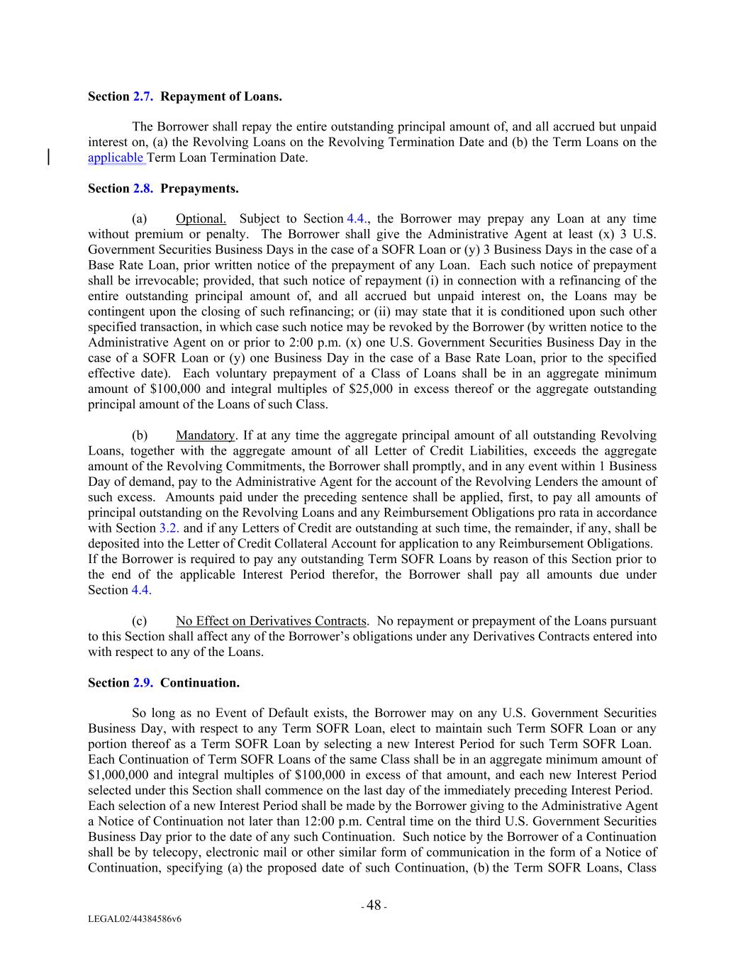 Section 2.7. Repayment of Loans. The Borrower shall repay the entire outstanding principal amount of, and all accrued but unpaid interest on, (a) the Revolving Loans on the Revolving Termination Date and (b) the Term Loans on the applicable Term Loan Termination Date. Section 2.8. Prepayments. (a) Optional. Subject to Section 4.4., the Borrower may prepay any Loan at any time without premium or penalty. The Borrower shall give the Administrative Agent at least (x) 3 U.S. Government Securities Business Days in the case of a SOFR Loan or (y) 3 Business Days in the case of a Base Rate Loan, prior written notice of the prepayment of any Loan. Each such notice of prepayment shall be irrevocable; provided, that such notice of repayment (i) in connection with a refinancing of the entire outstanding principal amount of, and all accrued but unpaid interest on, the Loans may be contingent upon the closing of such refinancing; or (ii) may state that it is conditioned upon such other specified transaction, in which case such notice may be revoked by the Borrower (by written notice to the Administrative Agent on or prior to 2:00 p.m. (x) one U.S. Government Securities Business Day in the case of a SOFR Loan or (y) one Business Day in the case of a Base Rate Loan, prior to the specified effective date). Each voluntary prepayment of a Class of Loans shall be in an aggregate minimum amount of $100,000 and integral multiples of $25,000 in excess thereof or the aggregate outstanding principal amount of the Loans of such Class. (b) Mandatory. If at any time the aggregate principal amount of all outstanding Revolving Loans, together with the aggregate amount of all Letter of Credit Liabilities, exceeds the aggregate amount of the Revolving Commitments, the Borrower shall promptly, and in any event within 1 Business Day of demand, pay to the Administrative Agent for the account of the Revolving Lenders the amount of such excess. Amounts paid under the preceding sentence shall be applied, first, to pay all amounts of principal outstanding on the Revolving Loans and any Reimbursement Obligations pro rata in accordance with Section 3.2. and if any Letters of Credit are outstanding at such time, the remainder, if any, shall be deposited into the Letter of Credit Collateral Account for application to any Reimbursement Obligations. If the Borrower is required to pay any outstanding Term SOFR Loans by reason of this Section prior to the end of the applicable Interest Period therefor, the Borrower shall pay all amounts due under Section 4.4. (c) No Effect on Derivatives Contracts. No repayment or prepayment of the Loans pursuant to this Section shall affect any of the Borrower’s obligations under any Derivatives Contracts entered into with respect to any of the Loans. Section 2.9. Continuation. So long as no Event of Default exists, the Borrower may on any U.S. Government Securities Business Day, with respect to any Term SOFR Loan, elect to maintain such Term SOFR Loan or any portion thereof as a Term SOFR Loan by selecting a new Interest Period for such Term SOFR Loan. Each Continuation of Term SOFR Loans of the same Class shall be in an aggregate minimum amount of $1,000,000 and integral multiples of $100,000 in excess of that amount, and each new Interest Period selected under this Section shall commence on the last day of the immediately preceding Interest Period. Each selection of a new Interest Period shall be made by the Borrower giving to the Administrative Agent a Notice of Continuation not later than 12:00 p.m. Central time on the third U.S. Government Securities Business Day prior to the date of any such Continuation. Such notice by the Borrower of a Continuation shall be by telecopy, electronic mail or other similar form of communication in the form of a Notice of Continuation, specifying (a) the proposed date of such Continuation, (b) the Term SOFR Loans, Class - 48 - LEGAL02/44384586v6