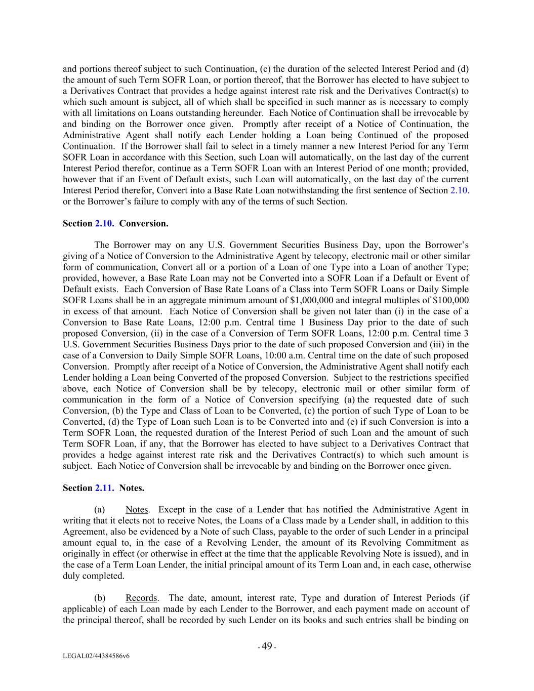 and portions thereof subject to such Continuation, (c) the duration of the selected Interest Period and (d) the amount of such Term SOFR Loan, or portion thereof, that the Borrower has elected to have subject to a Derivatives Contract that provides a hedge against interest rate risk and the Derivatives Contract(s) to which such amount is subject, all of which shall be specified in such manner as is necessary to comply with all limitations on Loans outstanding hereunder. Each Notice of Continuation shall be irrevocable by and binding on the Borrower once given. Promptly after receipt of a Notice of Continuation, the Administrative Agent shall notify each Lender holding a Loan being Continued of the proposed Continuation. If the Borrower shall fail to select in a timely manner a new Interest Period for any Term SOFR Loan in accordance with this Section, such Loan will automatically, on the last day of the current Interest Period therefor, continue as a Term SOFR Loan with an Interest Period of one month; provided, however that if an Event of Default exists, such Loan will automatically, on the last day of the current Interest Period therefor, Convert into a Base Rate Loan notwithstanding the first sentence of Section 2.10. or the Borrower’s failure to comply with any of the terms of such Section. Section 2.10. Conversion. The Borrower may on any U.S. Government Securities Business Day, upon the Borrower’s giving of a Notice of Conversion to the Administrative Agent by telecopy, electronic mail or other similar form of communication, Convert all or a portion of a Loan of one Type into a Loan of another Type; provided, however, a Base Rate Loan may not be Converted into a SOFR Loan if a Default or Event of Default exists. Each Conversion of Base Rate Loans of a Class into Term SOFR Loans or Daily Simple SOFR Loans shall be in an aggregate minimum amount of $1,000,000 and integral multiples of $100,000 in excess of that amount. Each Notice of Conversion shall be given not later than (i) in the case of a Conversion to Base Rate Loans, 12:00 p.m. Central time 1 Business Day prior to the date of such proposed Conversion, (ii) in the case of a Conversion of Term SOFR Loans, 12:00 p.m. Central time 3 U.S. Government Securities Business Days prior to the date of such proposed Conversion and (iii) in the case of a Conversion to Daily Simple SOFR Loans, 10:00 a.m. Central time on the date of such proposed Conversion. Promptly after receipt of a Notice of Conversion, the Administrative Agent shall notify each Lender holding a Loan being Converted of the proposed Conversion. Subject to the restrictions specified above, each Notice of Conversion shall be by telecopy, electronic mail or other similar form of communication in the form of a Notice of Conversion specifying (a) the requested date of such Conversion, (b) the Type and Class of Loan to be Converted, (c) the portion of such Type of Loan to be Converted, (d) the Type of Loan such Loan is to be Converted into and (e) if such Conversion is into a Term SOFR Loan, the requested duration of the Interest Period of such Loan and the amount of such Term SOFR Loan, if any, that the Borrower has elected to have subject to a Derivatives Contract that provides a hedge against interest rate risk and the Derivatives Contract(s) to which such amount is subject. Each Notice of Conversion shall be irrevocable by and binding on the Borrower once given. Section 2.11. Notes. (a) Notes. Except in the case of a Lender that has notified the Administrative Agent in writing that it elects not to receive Notes, the Loans of a Class made by a Lender shall, in addition to this Agreement, also be evidenced by a Note of such Class, payable to the order of such Lender in a principal amount equal to, in the case of a Revolving Lender, the amount of its Revolving Commitment as originally in effect (or otherwise in effect at the time that the applicable Revolving Note is issued), and in the case of a Term Loan Lender, the initial principal amount of its Term Loan and, in each case, otherwise duly completed. (b) Records. The date, amount, interest rate, Type and duration of Interest Periods (if applicable) of each Loan made by each Lender to the Borrower, and each payment made on account of the principal thereof, shall be recorded by such Lender on its books and such entries shall be binding on - 49 - LEGAL02/44384586v6