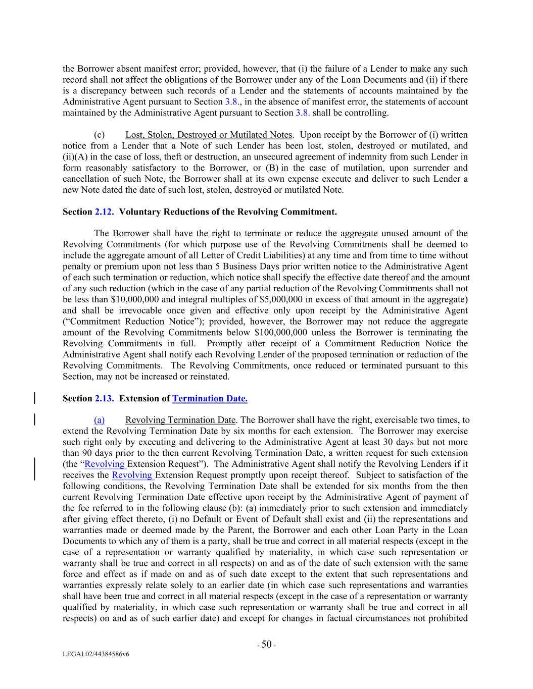 the Borrower absent manifest error; provided, however, that (i) the failure of a Lender to make any such record shall not affect the obligations of the Borrower under any of the Loan Documents and (ii) if there is a discrepancy between such records of a Lender and the statements of accounts maintained by the Administrative Agent pursuant to Section 3.8., in the absence of manifest error, the statements of account maintained by the Administrative Agent pursuant to Section 3.8. shall be controlling. (c) Lost, Stolen, Destroyed or Mutilated Notes. Upon receipt by the Borrower of (i) written notice from a Lender that a Note of such Lender has been lost, stolen, destroyed or mutilated, and (ii)(A) in the case of loss, theft or destruction, an unsecured agreement of indemnity from such Lender in form reasonably satisfactory to the Borrower, or (B) in the case of mutilation, upon surrender and cancellation of such Note, the Borrower shall at its own expense execute and deliver to such Lender a new Note dated the date of such lost, stolen, destroyed or mutilated Note. Section 2.12. Voluntary Reductions of the Revolving Commitment. The Borrower shall have the right to terminate or reduce the aggregate unused amount of the Revolving Commitments (for which purpose use of the Revolving Commitments shall be deemed to include the aggregate amount of all Letter of Credit Liabilities) at any time and from time to time without penalty or premium upon not less than 5 Business Days prior written notice to the Administrative Agent of each such termination or reduction, which notice shall specify the effective date thereof and the amount of any such reduction (which in the case of any partial reduction of the Revolving Commitments shall not be less than $10,000,000 and integral multiples of $5,000,000 in excess of that amount in the aggregate) and shall be irrevocable once given and effective only upon receipt by the Administrative Agent (“Commitment Reduction Notice”); provided, however, the Borrower may not reduce the aggregate amount of the Revolving Commitments below $100,000,000 unless the Borrower is terminating the Revolving Commitments in full. Promptly after receipt of a Commitment Reduction Notice the Administrative Agent shall notify each Revolving Lender of the proposed termination or reduction of the Revolving Commitments. The Revolving Commitments, once reduced or terminated pursuant to this Section, may not be increased or reinstated. Section 2.13. Extension of Termination Date. (a) Revolving Termination Date. The Borrower shall have the right, exercisable two times, to extend the Revolving Termination Date by six months for each extension. The Borrower may exercise such right only by executing and delivering to the Administrative Agent at least 30 days but not more than 90 days prior to the then current Revolving Termination Date, a written request for such extension (the “Revolving Extension Request”). The Administrative Agent shall notify the Revolving Lenders if it receives the Revolving Extension Request promptly upon receipt thereof. Subject to satisfaction of the following conditions, the Revolving Termination Date shall be extended for six months from the then current Revolving Termination Date effective upon receipt by the Administrative Agent of payment of the fee referred to in the following clause (b): (a) immediately prior to such extension and immediately after giving effect thereto, (i) no Default or Event of Default shall exist and (ii) the representations and warranties made or deemed made by the Parent, the Borrower and each other Loan Party in the Loan Documents to which any of them is a party, shall be true and correct in all material respects (except in the case of a representation or warranty qualified by materiality, in which case such representation or warranty shall be true and correct in all respects) on and as of the date of such extension with the same force and effect as if made on and as of such date except to the extent that such representations and warranties expressly relate solely to an earlier date (in which case such representations and warranties shall have been true and correct in all material respects (except in the case of a representation or warranty qualified by materiality, in which case such representation or warranty shall be true and correct in all respects) on and as of such earlier date) and except for changes in factual circumstances not prohibited - 50 - LEGAL02/44384586v6