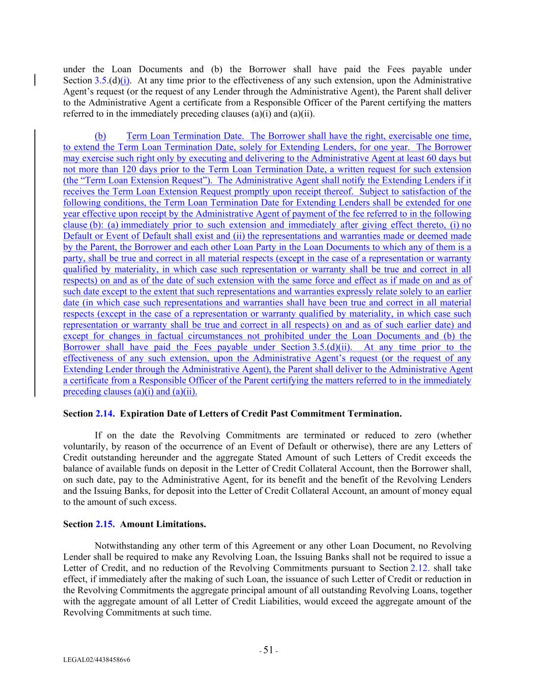 under the Loan Documents and (b) the Borrower shall have paid the Fees payable under Section 3.5.(d)(i). At any time prior to the effectiveness of any such extension, upon the Administrative Agent’s request (or the request of any Lender through the Administrative Agent), the Parent shall deliver to the Administrative Agent a certificate from a Responsible Officer of the Parent certifying the matters referred to in the immediately preceding clauses (a)(i) and (a)(ii). (b) Term Loan Termination Date. The Borrower shall have the right, exercisable one time, to extend the Term Loan Termination Date, solely for Extending Lenders, for one year. The Borrower may exercise such right only by executing and delivering to the Administrative Agent at least 60 days but not more than 120 days prior to the Term Loan Termination Date, a written request for such extension (the “Term Loan Extension Request”). The Administrative Agent shall notify the Extending Lenders if it receives the Term Loan Extension Request promptly upon receipt thereof. Subject to satisfaction of the following conditions, the Term Loan Termination Date for Extending Lenders shall be extended for one year effective upon receipt by the Administrative Agent of payment of the fee referred to in the following clause (b): (a) immediately prior to such extension and immediately after giving effect thereto, (i) no Default or Event of Default shall exist and (ii) the representations and warranties made or deemed made by the Parent, the Borrower and each other Loan Party in the Loan Documents to which any of them is a party, shall be true and correct in all material respects (except in the case of a representation or warranty qualified by materiality, in which case such representation or warranty shall be true and correct in all respects) on and as of the date of such extension with the same force and effect as if made on and as of such date except to the extent that such representations and warranties expressly relate solely to an earlier date (in which case such representations and warranties shall have been true and correct in all material respects (except in the case of a representation or warranty qualified by materiality, in which case such representation or warranty shall be true and correct in all respects) on and as of such earlier date) and except for changes in factual circumstances not prohibited under the Loan Documents and (b) the Borrower shall have paid the Fees payable under Section 3.5.(d)(ii). At any time prior to the effectiveness of any such extension, upon the Administrative Agent’s request (or the request of any Extending Lender through the Administrative Agent), the Parent shall deliver to the Administrative Agent a certificate from a Responsible Officer of the Parent certifying the matters referred to in the immediately preceding clauses (a)(i) and (a)(ii). Section 2.14. Expiration Date of Letters of Credit Past Commitment Termination. If on the date the Revolving Commitments are terminated or reduced to zero (whether voluntarily, by reason of the occurrence of an Event of Default or otherwise), there are any Letters of Credit outstanding hereunder and the aggregate Stated Amount of such Letters of Credit exceeds the balance of available funds on deposit in the Letter of Credit Collateral Account, then the Borrower shall, on such date, pay to the Administrative Agent, for its benefit and the benefit of the Revolving Lenders and the Issuing Banks, for deposit into the Letter of Credit Collateral Account, an amount of money equal to the amount of such excess. Section 2.15. Amount Limitations. Notwithstanding any other term of this Agreement or any other Loan Document, no Revolving Lender shall be required to make any Revolving Loan, the Issuing Banks shall not be required to issue a Letter of Credit, and no reduction of the Revolving Commitments pursuant to Section 2.12. shall take effect, if immediately after the making of such Loan, the issuance of such Letter of Credit or reduction in the Revolving Commitments the aggregate principal amount of all outstanding Revolving Loans, together with the aggregate amount of all Letter of Credit Liabilities, would exceed the aggregate amount of the Revolving Commitments at such time. - 51 - LEGAL02/44384586v6