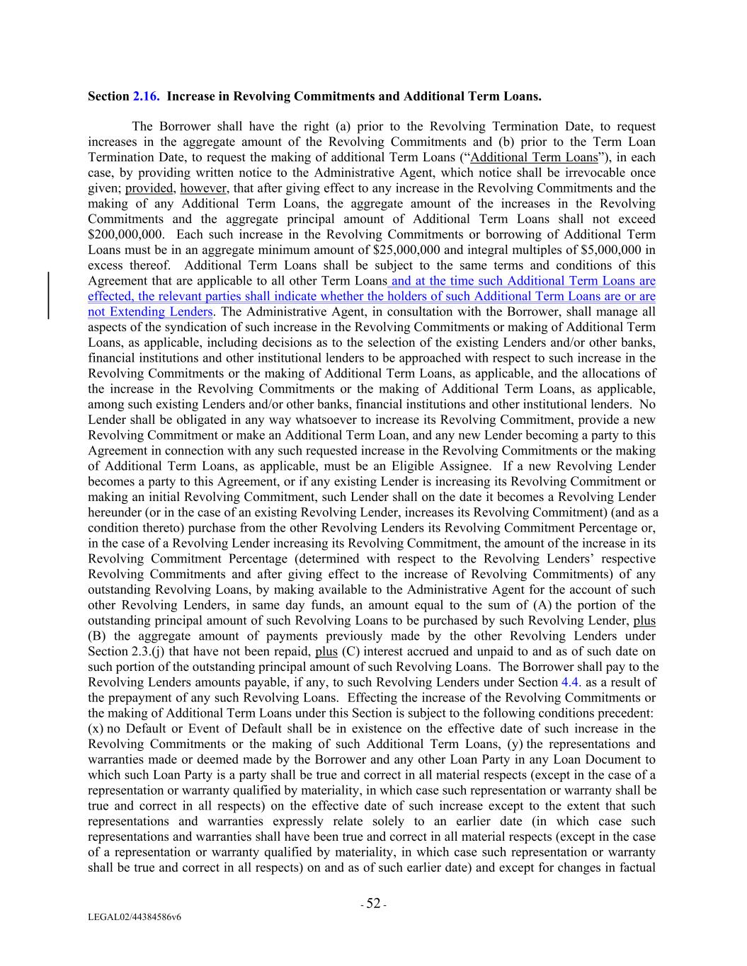 Section 2.16. Increase in Revolving Commitments and Additional Term Loans. The Borrower shall have the right (a) prior to the Revolving Termination Date, to request increases in the aggregate amount of the Revolving Commitments and (b) prior to the Term Loan Termination Date, to request the making of additional Term Loans (“Additional Term Loans”), in each case, by providing written notice to the Administrative Agent, which notice shall be irrevocable once given; provided, however, that after giving effect to any increase in the Revolving Commitments and the making of any Additional Term Loans, the aggregate amount of the increases in the Revolving Commitments and the aggregate principal amount of Additional Term Loans shall not exceed $200,000,000. Each such increase in the Revolving Commitments or borrowing of Additional Term Loans must be in an aggregate minimum amount of $25,000,000 and integral multiples of $5,000,000 in excess thereof. Additional Term Loans shall be subject to the same terms and conditions of this Agreement that are applicable to all other Term Loans and at the time such Additional Term Loans are effected, the relevant parties shall indicate whether the holders of such Additional Term Loans are or are not Extending Lenders. The Administrative Agent, in consultation with the Borrower, shall manage all aspects of the syndication of such increase in the Revolving Commitments or making of Additional Term Loans, as applicable, including decisions as to the selection of the existing Lenders and/or other banks, financial institutions and other institutional lenders to be approached with respect to such increase in the Revolving Commitments or the making of Additional Term Loans, as applicable, and the allocations of the increase in the Revolving Commitments or the making of Additional Term Loans, as applicable, among such existing Lenders and/or other banks, financial institutions and other institutional lenders. No Lender shall be obligated in any way whatsoever to increase its Revolving Commitment, provide a new Revolving Commitment or make an Additional Term Loan, and any new Lender becoming a party to this Agreement in connection with any such requested increase in the Revolving Commitments or the making of Additional Term Loans, as applicable, must be an Eligible Assignee. If a new Revolving Lender becomes a party to this Agreement, or if any existing Lender is increasing its Revolving Commitment or making an initial Revolving Commitment, such Lender shall on the date it becomes a Revolving Lender hereunder (or in the case of an existing Revolving Lender, increases its Revolving Commitment) (and as a condition thereto) purchase from the other Revolving Lenders its Revolving Commitment Percentage or, in the case of a Revolving Lender increasing its Revolving Commitment, the amount of the increase in its Revolving Commitment Percentage (determined with respect to the Revolving Lenders’ respective Revolving Commitments and after giving effect to the increase of Revolving Commitments) of any outstanding Revolving Loans, by making available to the Administrative Agent for the account of such other Revolving Lenders, in same day funds, an amount equal to the sum of (A) the portion of the outstanding principal amount of such Revolving Loans to be purchased by such Revolving Lender, plus (B) the aggregate amount of payments previously made by the other Revolving Lenders under Section 2.3.(j) that have not been repaid, plus (C) interest accrued and unpaid to and as of such date on such portion of the outstanding principal amount of such Revolving Loans. The Borrower shall pay to the Revolving Lenders amounts payable, if any, to such Revolving Lenders under Section 4.4. as a result of the prepayment of any such Revolving Loans. Effecting the increase of the Revolving Commitments or the making of Additional Term Loans under this Section is subject to the following conditions precedent: (x) no Default or Event of Default shall be in existence on the effective date of such increase in the Revolving Commitments or the making of such Additional Term Loans, (y) the representations and warranties made or deemed made by the Borrower and any other Loan Party in any Loan Document to which such Loan Party is a party shall be true and correct in all material respects (except in the case of a representation or warranty qualified by materiality, in which case such representation or warranty shall be true and correct in all respects) on the effective date of such increase except to the extent that such representations and warranties expressly relate solely to an earlier date (in which case such representations and warranties shall have been true and correct in all material respects (except in the case of a representation or warranty qualified by materiality, in which case such representation or warranty shall be true and correct in all respects) on and as of such earlier date) and except for changes in factual - 52 - LEGAL02/44384586v6