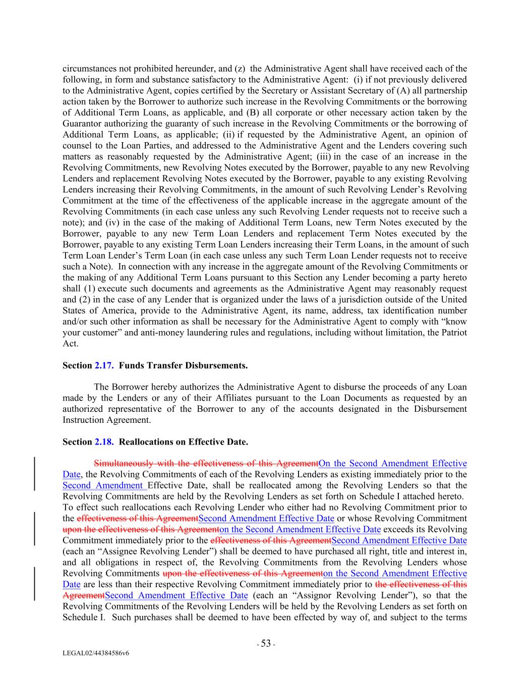 circumstances not prohibited hereunder, and (z) the Administrative Agent shall have received each of the following, in form and substance satisfactory to the Administrative Agent: (i) if not previously delivered to the Administrative Agent, copies certified by the Secretary or Assistant Secretary of (A) all partnership action taken by the Borrower to authorize such increase in the Revolving Commitments or the borrowing of Additional Term Loans, as applicable, and (B) all corporate or other necessary action taken by the Guarantor authorizing the guaranty of such increase in the Revolving Commitments or the borrowing of Additional Term Loans, as applicable; (ii) if requested by the Administrative Agent, an opinion of counsel to the Loan Parties, and addressed to the Administrative Agent and the Lenders covering such matters as reasonably requested by the Administrative Agent; (iii) in the case of an increase in the Revolving Commitments, new Revolving Notes executed by the Borrower, payable to any new Revolving Lenders and replacement Revolving Notes executed by the Borrower, payable to any existing Revolving Lenders increasing their Revolving Commitments, in the amount of such Revolving Lender’s Revolving Commitment at the time of the effectiveness of the applicable increase in the aggregate amount of the Revolving Commitments (in each case unless any such Revolving Lender requests not to receive such a note); and (iv) in the case of the making of Additional Term Loans, new Term Notes executed by the Borrower, payable to any new Term Loan Lenders and replacement Term Notes executed by the Borrower, payable to any existing Term Loan Lenders increasing their Term Loans, in the amount of such Term Loan Lender’s Term Loan (in each case unless any such Term Loan Lender requests not to receive such a Note). In connection with any increase in the aggregate amount of the Revolving Commitments or the making of any Additional Term Loans pursuant to this Section any Lender becoming a party hereto shall (1) execute such documents and agreements as the Administrative Agent may reasonably request and (2) in the case of any Lender that is organized under the laws of a jurisdiction outside of the United States of America, provide to the Administrative Agent, its name, address, tax identification number and/or such other information as shall be necessary for the Administrative Agent to comply with “know your customer” and anti-money laundering rules and regulations, including without limitation, the Patriot Act. Section 2.17. Funds Transfer Disbursements. The Borrower hereby authorizes the Administrative Agent to disburse the proceeds of any Loan made by the Lenders or any of their Affiliates pursuant to the Loan Documents as requested by an authorized representative of the Borrower to any of the accounts designated in the Disbursement Instruction Agreement. Section 2.18. Reallocations on Effective Date. Simultaneously with the effectiveness of this AgreementOn the Second Amendment Effective Date, the Revolving Commitments of each of the Revolving Lenders as existing immediately prior to the Second Amendment Effective Date, shall be reallocated among the Revolving Lenders so that the Revolving Commitments are held by the Revolving Lenders as set forth on Schedule I attached hereto. To effect such reallocations each Revolving Lender who either had no Revolving Commitment prior to the effectiveness of this AgreementSecond Amendment Effective Date or whose Revolving Commitment upon the effectiveness of this Agreementon the Second Amendment Effective Date exceeds its Revolving Commitment immediately prior to the effectiveness of this AgreementSecond Amendment Effective Date (each an “Assignee Revolving Lender”) shall be deemed to have purchased all right, title and interest in, and all obligations in respect of, the Revolving Commitments from the Revolving Lenders whose Revolving Commitments upon the effectiveness of this Agreementon the Second Amendment Effective Date are less than their respective Revolving Commitment immediately prior to the effectiveness of this AgreementSecond Amendment Effective Date (each an “Assignor Revolving Lender”), so that the Revolving Commitments of the Revolving Lenders will be held by the Revolving Lenders as set forth on Schedule I. Such purchases shall be deemed to have been effected by way of, and subject to the terms - 53 - LEGAL02/44384586v6