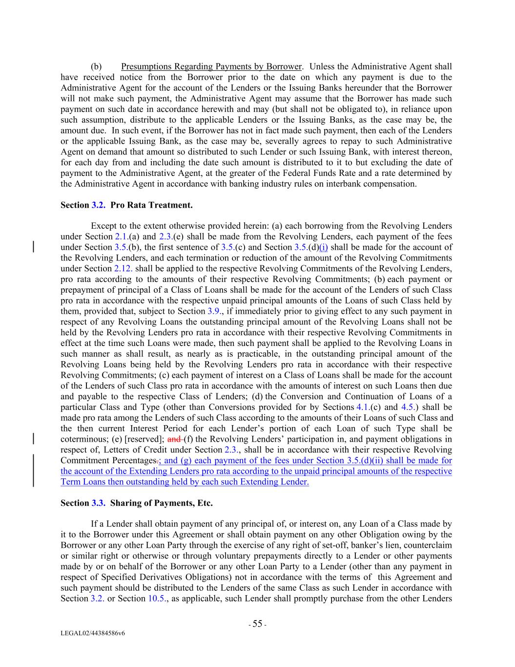 (b) Presumptions Regarding Payments by Borrower. Unless the Administrative Agent shall have received notice from the Borrower prior to the date on which any payment is due to the Administrative Agent for the account of the Lenders or the Issuing Banks hereunder that the Borrower will not make such payment, the Administrative Agent may assume that the Borrower has made such payment on such date in accordance herewith and may (but shall not be obligated to), in reliance upon such assumption, distribute to the applicable Lenders or the Issuing Banks, as the case may be, the amount due. In such event, if the Borrower has not in fact made such payment, then each of the Lenders or the applicable Issuing Bank, as the case may be, severally agrees to repay to such Administrative Agent on demand that amount so distributed to such Lender or such Issuing Bank, with interest thereon, for each day from and including the date such amount is distributed to it to but excluding the date of payment to the Administrative Agent, at the greater of the Federal Funds Rate and a rate determined by the Administrative Agent in accordance with banking industry rules on interbank compensation. Section 3.2. Pro Rata Treatment. Except to the extent otherwise provided herein: (a) each borrowing from the Revolving Lenders under Section 2.1.(a) and 2.3.(e) shall be made from the Revolving Lenders, each payment of the fees under Section 3.5.(b), the first sentence of 3.5.(c) and Section 3.5.(d)(i) shall be made for the account of the Revolving Lenders, and each termination or reduction of the amount of the Revolving Commitments under Section 2.12. shall be applied to the respective Revolving Commitments of the Revolving Lenders, pro rata according to the amounts of their respective Revolving Commitments; (b) each payment or prepayment of principal of a Class of Loans shall be made for the account of the Lenders of such Class pro rata in accordance with the respective unpaid principal amounts of the Loans of such Class held by them, provided that, subject to Section 3.9., if immediately prior to giving effect to any such payment in respect of any Revolving Loans the outstanding principal amount of the Revolving Loans shall not be held by the Revolving Lenders pro rata in accordance with their respective Revolving Commitments in effect at the time such Loans were made, then such payment shall be applied to the Revolving Loans in such manner as shall result, as nearly as is practicable, in the outstanding principal amount of the Revolving Loans being held by the Revolving Lenders pro rata in accordance with their respective Revolving Commitments; (c) each payment of interest on a Class of Loans shall be made for the account of the Lenders of such Class pro rata in accordance with the amounts of interest on such Loans then due and payable to the respective Class of Lenders; (d) the Conversion and Continuation of Loans of a particular Class and Type (other than Conversions provided for by Sections 4.1.(c) and 4.5.) shall be made pro rata among the Lenders of such Class according to the amounts of their Loans of such Class and the then current Interest Period for each Lender’s portion of each Loan of such Type shall be coterminous; (e) [reserved]; and (f) the Revolving Lenders’ participation in, and payment obligations in respect of, Letters of Credit under Section 2.3., shall be in accordance with their respective Revolving Commitment Percentages.; and (g) each payment of the fees under Section 3.5.(d)(ii) shall be made for the account of the Extending Lenders pro rata according to the unpaid principal amounts of the respective Term Loans then outstanding held by each such Extending Lender. Section 3.3. Sharing of Payments, Etc. If a Lender shall obtain payment of any principal of, or interest on, any Loan of a Class made by it to the Borrower under this Agreement or shall obtain payment on any other Obligation owing by the Borrower or any other Loan Party through the exercise of any right of set-off, banker’s lien, counterclaim or similar right or otherwise or through voluntary prepayments directly to a Lender or other payments made by or on behalf of the Borrower or any other Loan Party to a Lender (other than any payment in respect of Specified Derivatives Obligations) not in accordance with the terms of this Agreement and such payment should be distributed to the Lenders of the same Class as such Lender in accordance with Section 3.2. or Section 10.5., as applicable, such Lender shall promptly purchase from the other Lenders - 55 - LEGAL02/44384586v6