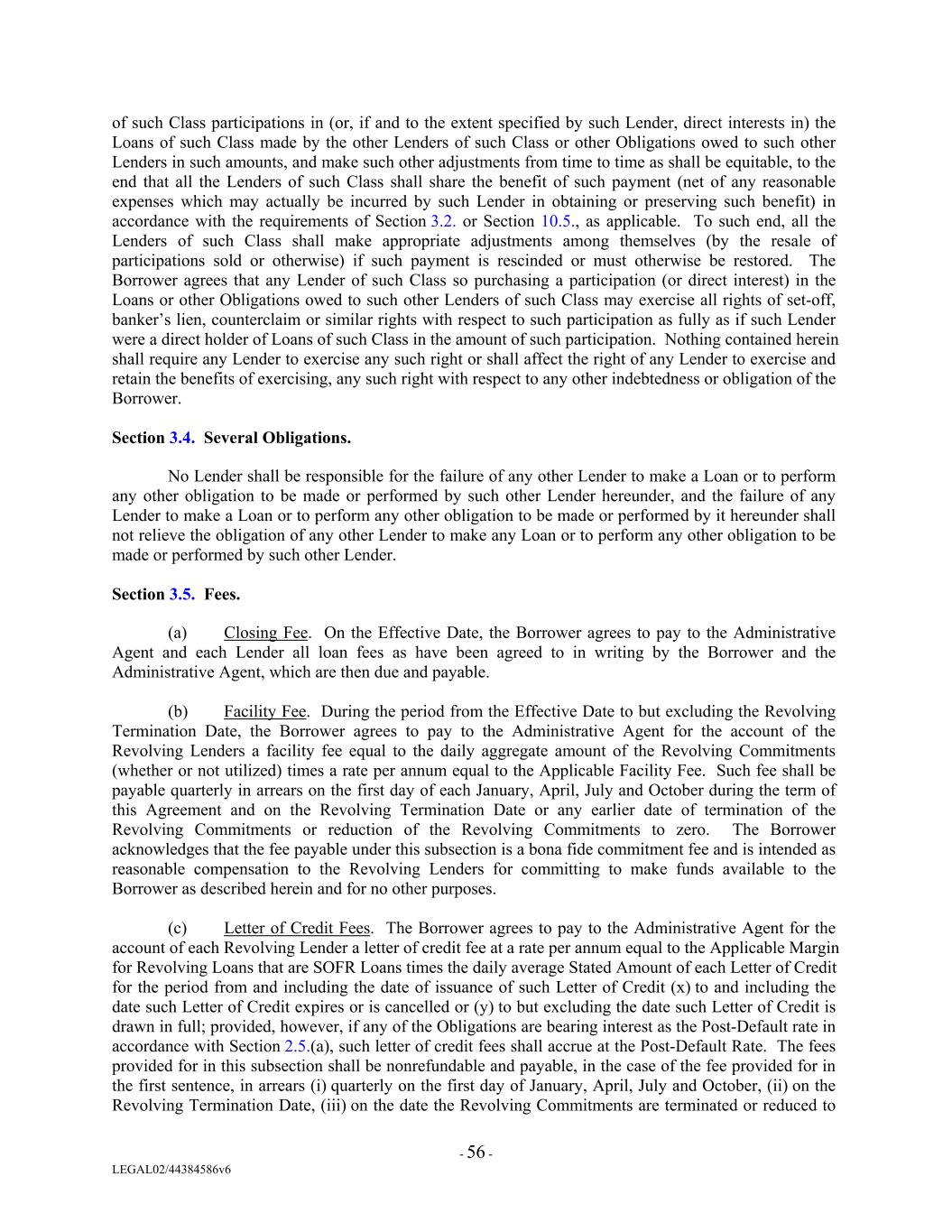 of such Class participations in (or, if and to the extent specified by such Lender, direct interests in) the Loans of such Class made by the other Lenders of such Class or other Obligations owed to such other Lenders in such amounts, and make such other adjustments from time to time as shall be equitable, to the end that all the Lenders of such Class shall share the benefit of such payment (net of any reasonable expenses which may actually be incurred by such Lender in obtaining or preserving such benefit) in accordance with the requirements of Section 3.2. or Section 10.5., as applicable. To such end, all the Lenders of such Class shall make appropriate adjustments among themselves (by the resale of participations sold or otherwise) if such payment is rescinded or must otherwise be restored. The Borrower agrees that any Lender of such Class so purchasing a participation (or direct interest) in the Loans or other Obligations owed to such other Lenders of such Class may exercise all rights of set-off, banker’s lien, counterclaim or similar rights with respect to such participation as fully as if such Lender were a direct holder of Loans of such Class in the amount of such participation. Nothing contained herein shall require any Lender to exercise any such right or shall affect the right of any Lender to exercise and retain the benefits of exercising, any such right with respect to any other indebtedness or obligation of the Borrower. Section 3.4. Several Obligations. No Lender shall be responsible for the failure of any other Lender to make a Loan or to perform any other obligation to be made or performed by such other Lender hereunder, and the failure of any Lender to make a Loan or to perform any other obligation to be made or performed by it hereunder shall not relieve the obligation of any other Lender to make any Loan or to perform any other obligation to be made or performed by such other Lender. Section 3.5. Fees. (a) Closing Fee. On the Effective Date, the Borrower agrees to pay to the Administrative Agent and each Lender all loan fees as have been agreed to in writing by the Borrower and the Administrative Agent, which are then due and payable. (b) Facility Fee. During the period from the Effective Date to but excluding the Revolving Termination Date, the Borrower agrees to pay to the Administrative Agent for the account of the Revolving Lenders a facility fee equal to the daily aggregate amount of the Revolving Commitments (whether or not utilized) times a rate per annum equal to the Applicable Facility Fee. Such fee shall be payable quarterly in arrears on the first day of each January, April, July and October during the term of this Agreement and on the Revolving Termination Date or any earlier date of termination of the Revolving Commitments or reduction of the Revolving Commitments to zero. The Borrower acknowledges that the fee payable under this subsection is a bona fide commitment fee and is intended as reasonable compensation to the Revolving Lenders for committing to make funds available to the Borrower as described herein and for no other purposes. (c) Letter of Credit Fees. The Borrower agrees to pay to the Administrative Agent for the account of each Revolving Lender a letter of credit fee at a rate per annum equal to the Applicable Margin for Revolving Loans that are SOFR Loans times the daily average Stated Amount of each Letter of Credit for the period from and including the date of issuance of such Letter of Credit (x) to and including the date such Letter of Credit expires or is cancelled or (y) to but excluding the date such Letter of Credit is drawn in full; provided, however, if any of the Obligations are bearing interest as the Post-Default rate in accordance with Section 2.5.(a), such letter of credit fees shall accrue at the Post-Default Rate. The fees provided for in this subsection shall be nonrefundable and payable, in the case of the fee provided for in the first sentence, in arrears (i) quarterly on the first day of January, April, July and October, (ii) on the Revolving Termination Date, (iii) on the date the Revolving Commitments are terminated or reduced to - 56 - LEGAL02/44384586v6