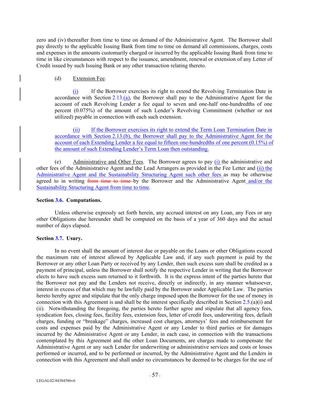 zero and (iv) thereafter from time to time on demand of the Administrative Agent. The Borrower shall pay directly to the applicable Issuing Bank from time to time on demand all commissions, charges, costs and expenses in the amounts customarily charged or incurred by the applicable Issuing Bank from time to time in like circumstances with respect to the issuance, amendment, renewal or extension of any Letter of Credit issued by such Issuing Bank or any other transaction relating thereto. (d) Extension Fee. (i) If the Borrower exercises its right to extend the Revolving Termination Date in accordance with Section 2.13.(a), the Borrower shall pay to the Administrative Agent for the account of each Revolving Lender a fee equal to seven and one-half one-hundredths of one percent (0.075%) of the amount of such Lender’s Revolving Commitment (whether or not utilized) payable in connection with each such extension. (ii) If the Borrower exercises its right to extend the Term Loan Termination Date in accordance with Section 2.13.(b), the Borrower shall pay to the Administrative Agent for the account of each Extending Lender a fee equal to fifteen one-hundredths of one percent (0.15%) of the amount of such Extending Lender’s Term Loan then outstanding. (e) Administrative and Other Fees. The Borrower agrees to pay (i) the administrative and other fees of the Administrative Agent and the Lead Arrangers as provided in the Fee Letter and (ii) the Administrative Agent and the Sustainability Structuring Agent such other fees as may be otherwise agreed to in writing from time to time by the Borrower and the Administrative Agent and/or the Sustainability Structuring Agent from time to time. Section 3.6. Computations. Unless otherwise expressly set forth herein, any accrued interest on any Loan, any Fees or any other Obligations due hereunder shall be computed on the basis of a year of 360 days and the actual number of days elapsed. Section 3.7. Usury. In no event shall the amount of interest due or payable on the Loans or other Obligations exceed the maximum rate of interest allowed by Applicable Law and, if any such payment is paid by the Borrower or any other Loan Party or received by any Lender, then such excess sum shall be credited as a payment of principal, unless the Borrower shall notify the respective Lender in writing that the Borrower elects to have such excess sum returned to it forthwith. It is the express intent of the parties hereto that the Borrower not pay and the Lenders not receive, directly or indirectly, in any manner whatsoever, interest in excess of that which may be lawfully paid by the Borrower under Applicable Law. The parties hereto hereby agree and stipulate that the only charge imposed upon the Borrower for the use of money in connection with this Agreement is and shall be the interest specifically described in Section 2.5.(a)(i) and (ii). Notwithstanding the foregoing, the parties hereto further agree and stipulate that all agency fees, syndication fees, closing fees, facility fees, extension fees, letter of credit fees, underwriting fees, default charges, funding or “breakage” charges, increased cost charges, attorneys’ fees and reimbursement for costs and expenses paid by the Administrative Agent or any Lender to third parties or for damages incurred by the Administrative Agent or any Lender, in each case, in connection with the transactions contemplated by this Agreement and the other Loan Documents, are charges made to compensate the Administrative Agent or any such Lender for underwriting or administrative services and costs or losses performed or incurred, and to be performed or incurred, by the Administrative Agent and the Lenders in connection with this Agreement and shall under no circumstances be deemed to be charges for the use of - 57 - LEGAL02/44384586v6