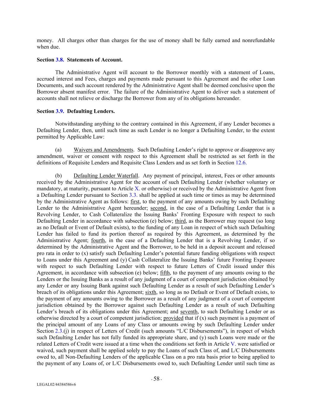 money. All charges other than charges for the use of money shall be fully earned and nonrefundable when due. Section 3.8. Statements of Account. The Administrative Agent will account to the Borrower monthly with a statement of Loans, accrued interest and Fees, charges and payments made pursuant to this Agreement and the other Loan Documents, and such account rendered by the Administrative Agent shall be deemed conclusive upon the Borrower absent manifest error. The failure of the Administrative Agent to deliver such a statement of accounts shall not relieve or discharge the Borrower from any of its obligations hereunder. Section 3.9. Defaulting Lenders. Notwithstanding anything to the contrary contained in this Agreement, if any Lender becomes a Defaulting Lender, then, until such time as such Lender is no longer a Defaulting Lender, to the extent permitted by Applicable Law: (a) Waivers and Amendments. Such Defaulting Lender’s right to approve or disapprove any amendment, waiver or consent with respect to this Agreement shall be restricted as set forth in the definitions of Requisite Lenders and Requisite Class Lenders and as set forth in Section 12.6. (b) Defaulting Lender Waterfall. Any payment of principal, interest, Fees or other amounts received by the Administrative Agent for the account of such Defaulting Lender (whether voluntary or mandatory, at maturity, pursuant to Article X. or otherwise) or received by the Administrative Agent from a Defaulting Lender pursuant to Section 3.3. shall be applied at such time or times as may be determined by the Administrative Agent as follows: first, to the payment of any amounts owing by such Defaulting Lender to the Administrative Agent hereunder; second, in the case of a Defaulting Lender that is a Revolving Lender, to Cash Collateralize the Issuing Banks’ Fronting Exposure with respect to such Defaulting Lender in accordance with subsection (e) below; third, as the Borrower may request (so long as no Default or Event of Default exists), to the funding of any Loan in respect of which such Defaulting Lender has failed to fund its portion thereof as required by this Agreement, as determined by the Administrative Agent; fourth, in the case of a Defaulting Lender that is a Revolving Lender, if so determined by the Administrative Agent and the Borrower, to be held in a deposit account and released pro rata in order to (x) satisfy such Defaulting Lender’s potential future funding obligations with respect to Loans under this Agreement and (y) Cash Collateralize the Issuing Banks’ future Fronting Exposure with respect to such Defaulting Lender with respect to future Letters of Credit issued under this Agreement, in accordance with subsection (e) below; fifth, to the payment of any amounts owing to the Lenders or the Issuing Banks as a result of any judgment of a court of competent jurisdiction obtained by any Lender or any Issuing Bank against such Defaulting Lender as a result of such Defaulting Lender’s breach of its obligations under this Agreement; sixth, so long as no Default or Event of Default exists, to the payment of any amounts owing to the Borrower as a result of any judgment of a court of competent jurisdiction obtained by the Borrower against such Defaulting Lender as a result of such Defaulting Lender’s breach of its obligations under this Agreement; and seventh, to such Defaulting Lender or as otherwise directed by a court of competent jurisdiction; provided that if (x) such payment is a payment of the principal amount of any Loans of any Class or amounts owing by such Defaulting Lender under Section 2.3.(j) in respect of Letters of Credit (such amounts “L/C Disbursements”), in respect of which such Defaulting Lender has not fully funded its appropriate share, and (y) such Loans were made or the related Letters of Credit were issued at a time when the conditions set forth in Article V. were satisfied or waived, such payment shall be applied solely to pay the Loans of such Class of, and L/C Disbursements owed to, all Non-Defaulting Lenders of the applicable Class on a pro rata basis prior to being applied to the payment of any Loans of, or L/C Disbursements owed to, such Defaulting Lender until such time as - 58 - LEGAL02/44384586v6