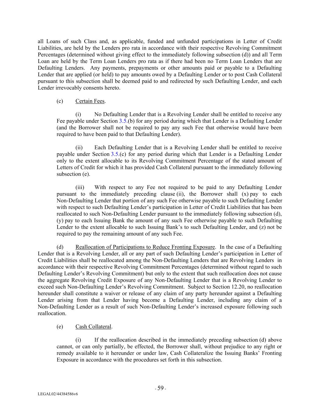 all Loans of such Class and, as applicable, funded and unfunded participations in Letter of Credit Liabilities, are held by the Lenders pro rata in accordance with their respective Revolving Commitment Percentages (determined without giving effect to the immediately following subsection (d)) and all Term Loan are held by the Term Loan Lenders pro rata as if there had been no Term Loan Lenders that are Defaulting Lenders. Any payments, prepayments or other amounts paid or payable to a Defaulting Lender that are applied (or held) to pay amounts owed by a Defaulting Lender or to post Cash Collateral pursuant to this subsection shall be deemed paid to and redirected by such Defaulting Lender, and each Lender irrevocably consents hereto. (c) Certain Fees. (i) No Defaulting Lender that is a Revolving Lender shall be entitled to receive any Fee payable under Section 3.5.(b) for any period during which that Lender is a Defaulting Lender (and the Borrower shall not be required to pay any such Fee that otherwise would have been required to have been paid to that Defaulting Lender). (ii) Each Defaulting Lender that is a Revolving Lender shall be entitled to receive payable under Section 3.5.(c) for any period during which that Lender is a Defaulting Lender only to the extent allocable to its Revolving Commitment Percentage of the stated amount of Letters of Credit for which it has provided Cash Collateral pursuant to the immediately following subsection (e). (iii) With respect to any Fee not required to be paid to any Defaulting Lender pursuant to the immediately preceding clause (ii), the Borrower shall (x) pay to each Non-Defaulting Lender that portion of any such Fee otherwise payable to such Defaulting Lender with respect to such Defaulting Lender’s participation in Letter of Credit Liabilities that has been reallocated to such Non-Defaulting Lender pursuant to the immediately following subsection (d), (y) pay to each Issuing Bank the amount of any such Fee otherwise payable to such Defaulting Lender to the extent allocable to such Issuing Bank’s to such Defaulting Lender, and (z) not be required to pay the remaining amount of any such Fee. (d) Reallocation of Participations to Reduce Fronting Exposure. In the case of a Defaulting Lender that is a Revolving Lender, all or any part of such Defaulting Lender’s participation in Letter of Credit Liabilities shall be reallocated among the Non-Defaulting Lenders that are Revolving Lenders in accordance with their respective Revolving Commitment Percentages (determined without regard to such Defaulting Lender’s Revolving Commitment) but only to the extent that such reallocation does not cause the aggregate Revolving Credit Exposure of any Non-Defaulting Lender that is a Revolving Lender to exceed such Non-Defaulting Lender’s Revolving Commitment. Subject to Section 12.20, no reallocation hereunder shall constitute a waiver or release of any claim of any party hereunder against a Defaulting Lender arising from that Lender having become a Defaulting Lender, including any claim of a Non-Defaulting Lender as a result of such Non-Defaulting Lender’s increased exposure following such reallocation. (e) Cash Collateral. (i) If the reallocation described in the immediately preceding subsection (d) above cannot, or can only partially, be effected, the Borrower shall, without prejudice to any right or remedy available to it hereunder or under law, Cash Collateralize the Issuing Banks’ Fronting Exposure in accordance with the procedures set forth in this subsection. - 59 - LEGAL02/44384586v6