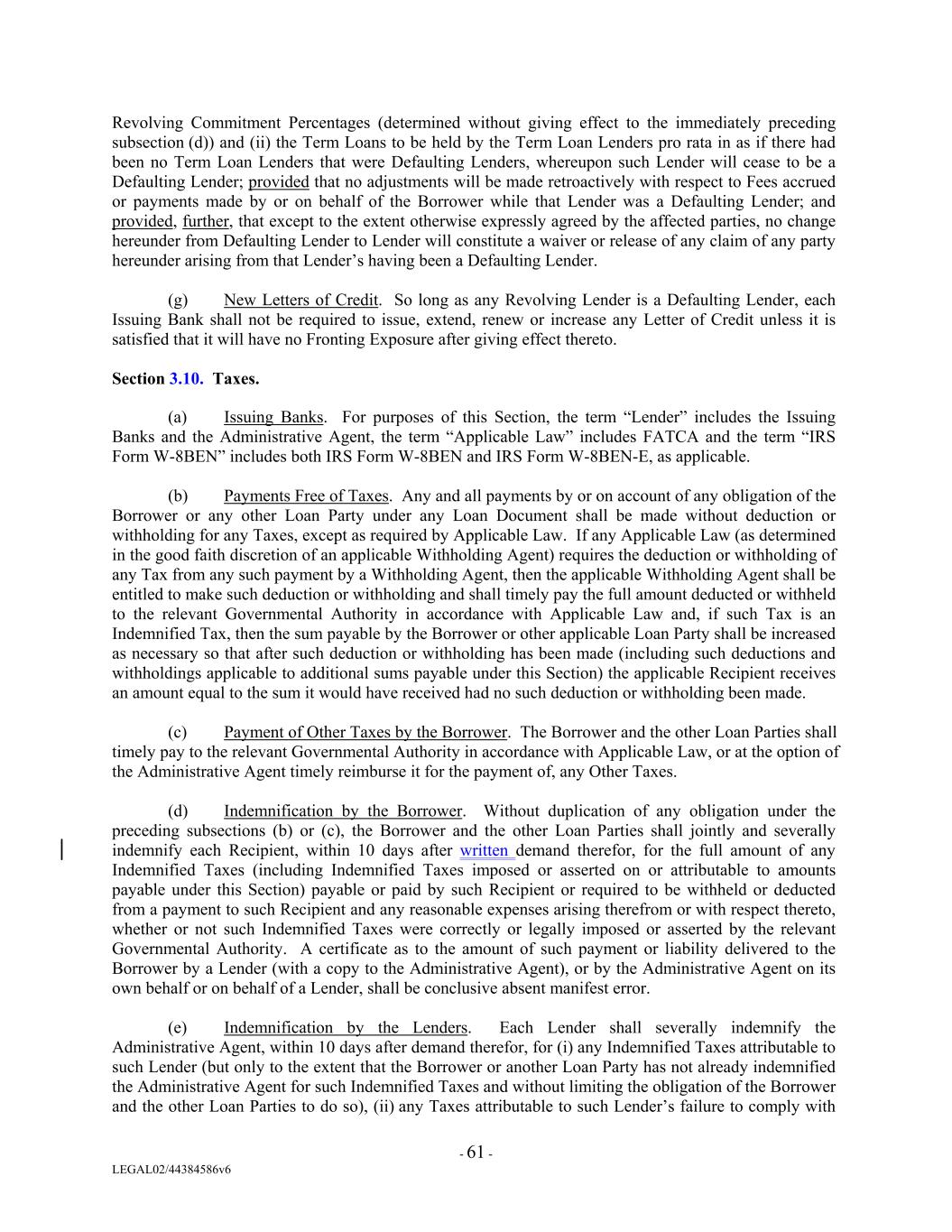 Revolving Commitment Percentages (determined without giving effect to the immediately preceding subsection (d)) and (ii) the Term Loans to be held by the Term Loan Lenders pro rata in as if there had been no Term Loan Lenders that were Defaulting Lenders, whereupon such Lender will cease to be a Defaulting Lender; provided that no adjustments will be made retroactively with respect to Fees accrued or payments made by or on behalf of the Borrower while that Lender was a Defaulting Lender; and provided, further, that except to the extent otherwise expressly agreed by the affected parties, no change hereunder from Defaulting Lender to Lender will constitute a waiver or release of any claim of any party hereunder arising from that Lender’s having been a Defaulting Lender. (g) New Letters of Credit. So long as any Revolving Lender is a Defaulting Lender, each Issuing Bank shall not be required to issue, extend, renew or increase any Letter of Credit unless it is satisfied that it will have no Fronting Exposure after giving effect thereto. Section 3.10. Taxes. (a) Issuing Banks. For purposes of this Section, the term “Lender” includes the Issuing Banks and the Administrative Agent, the term “Applicable Law” includes FATCA and the term “IRS Form W-8BEN” includes both IRS Form W-8BEN and IRS Form W-8BEN-E, as applicable. (b) Payments Free of Taxes. Any and all payments by or on account of any obligation of the Borrower or any other Loan Party under any Loan Document shall be made without deduction or withholding for any Taxes, except as required by Applicable Law. If any Applicable Law (as determined in the good faith discretion of an applicable Withholding Agent) requires the deduction or withholding of any Tax from any such payment by a Withholding Agent, then the applicable Withholding Agent shall be entitled to make such deduction or withholding and shall timely pay the full amount deducted or withheld to the relevant Governmental Authority in accordance with Applicable Law and, if such Tax is an Indemnified Tax, then the sum payable by the Borrower or other applicable Loan Party shall be increased as necessary so that after such deduction or withholding has been made (including such deductions and withholdings applicable to additional sums payable under this Section) the applicable Recipient receives an amount equal to the sum it would have received had no such deduction or withholding been made. (c) Payment of Other Taxes by the Borrower. The Borrower and the other Loan Parties shall timely pay to the relevant Governmental Authority in accordance with Applicable Law, or at the option of the Administrative Agent timely reimburse it for the payment of, any Other Taxes. (d) Indemnification by the Borrower. Without duplication of any obligation under the preceding subsections (b) or (c), the Borrower and the other Loan Parties shall jointly and severally indemnify each Recipient, within 10 days after written demand therefor, for the full amount of any Indemnified Taxes (including Indemnified Taxes imposed or asserted on or attributable to amounts payable under this Section) payable or paid by such Recipient or required to be withheld or deducted from a payment to such Recipient and any reasonable expenses arising therefrom or with respect thereto, whether or not such Indemnified Taxes were correctly or legally imposed or asserted by the relevant Governmental Authority. A certificate as to the amount of such payment or liability delivered to the Borrower by a Lender (with a copy to the Administrative Agent), or by the Administrative Agent on its own behalf or on behalf of a Lender, shall be conclusive absent manifest error. (e) Indemnification by the Lenders. Each Lender shall severally indemnify the Administrative Agent, within 10 days after demand therefor, for (i) any Indemnified Taxes attributable to such Lender (but only to the extent that the Borrower or another Loan Party has not already indemnified the Administrative Agent for such Indemnified Taxes and without limiting the obligation of the Borrower and the other Loan Parties to do so), (ii) any Taxes attributable to such Lender’s failure to comply with - 61 - LEGAL02/44384586v6