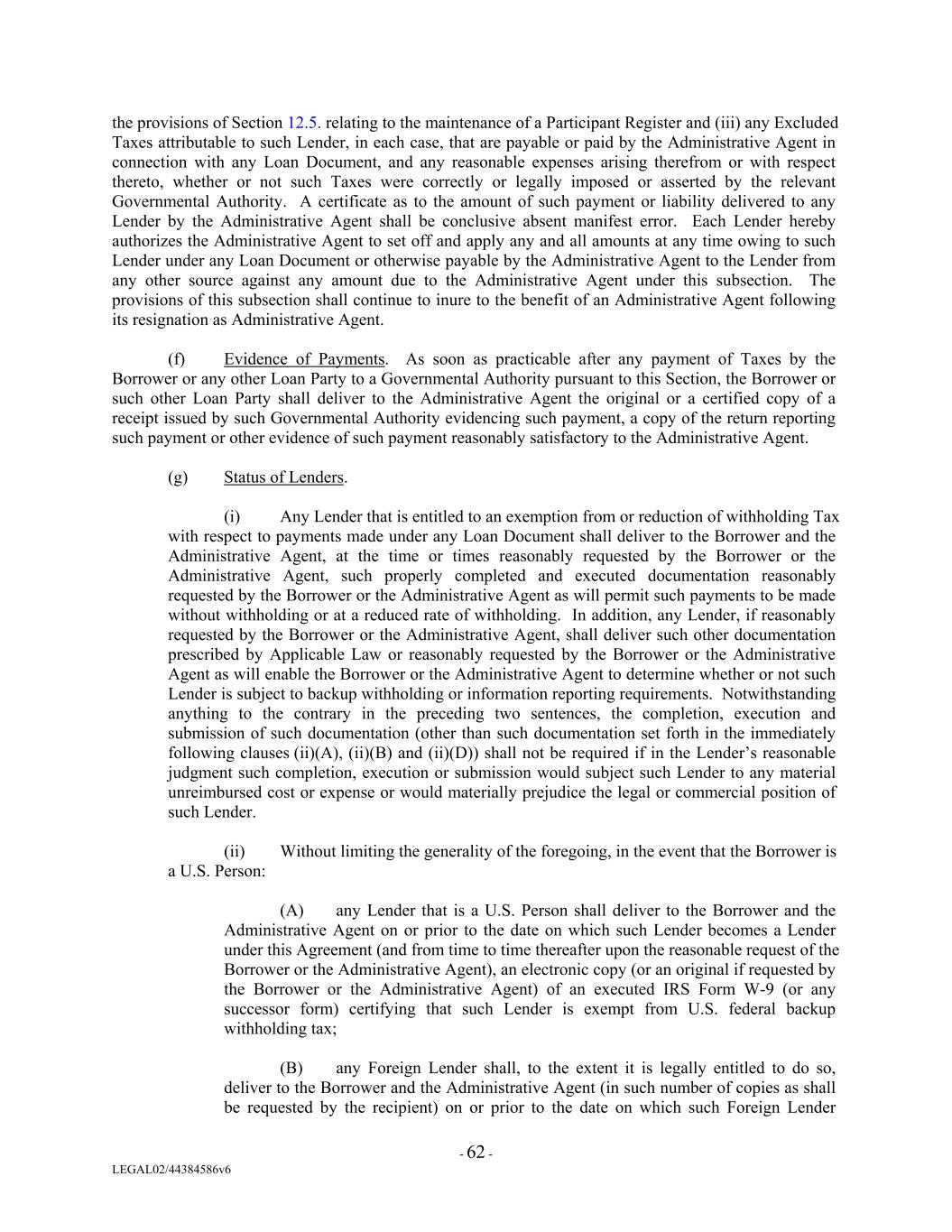 the provisions of Section 12.5. relating to the maintenance of a Participant Register and (iii) any Excluded Taxes attributable to such Lender, in each case, that are payable or paid by the Administrative Agent in connection with any Loan Document, and any reasonable expenses arising therefrom or with respect thereto, whether or not such Taxes were correctly or legally imposed or asserted by the relevant Governmental Authority. A certificate as to the amount of such payment or liability delivered to any Lender by the Administrative Agent shall be conclusive absent manifest error. Each Lender hereby authorizes the Administrative Agent to set off and apply any and all amounts at any time owing to such Lender under any Loan Document or otherwise payable by the Administrative Agent to the Lender from any other source against any amount due to the Administrative Agent under this subsection. The provisions of this subsection shall continue to inure to the benefit of an Administrative Agent following its resignation as Administrative Agent. (f) Evidence of Payments. As soon as practicable after any payment of Taxes by the Borrower or any other Loan Party to a Governmental Authority pursuant to this Section, the Borrower or such other Loan Party shall deliver to the Administrative Agent the original or a certified copy of a receipt issued by such Governmental Authority evidencing such payment, a copy of the return reporting such payment or other evidence of such payment reasonably satisfactory to the Administrative Agent. (g) Status of Lenders. (i) Any Lender that is entitled to an exemption from or reduction of withholding Tax with respect to payments made under any Loan Document shall deliver to the Borrower and the Administrative Agent, at the time or times reasonably requested by the Borrower or the Administrative Agent, such properly completed and executed documentation reasonably requested by the Borrower or the Administrative Agent as will permit such payments to be made without withholding or at a reduced rate of withholding. In addition, any Lender, if reasonably requested by the Borrower or the Administrative Agent, shall deliver such other documentation prescribed by Applicable Law or reasonably requested by the Borrower or the Administrative Agent as will enable the Borrower or the Administrative Agent to determine whether or not such Lender is subject to backup withholding or information reporting requirements. Notwithstanding anything to the contrary in the preceding two sentences, the completion, execution and submission of such documentation (other than such documentation set forth in the immediately following clauses (ii)(A), (ii)(B) and (ii)(D)) shall not be required if in the Lender’s reasonable judgment such completion, execution or submission would subject such Lender to any material unreimbursed cost or expense or would materially prejudice the legal or commercial position of such Lender. (ii) Without limiting the generality of the foregoing, in the event that the Borrower is a U.S. Person: (A) any Lender that is a U.S. Person shall deliver to the Borrower and the Administrative Agent on or prior to the date on which such Lender becomes a Lender under this Agreement (and from time to time thereafter upon the reasonable request of the Borrower or the Administrative Agent), an electronic copy (or an original if requested by the Borrower or the Administrative Agent) of an executed IRS Form W-9 (or any successor form) certifying that such Lender is exempt from U.S. federal backup withholding tax; (B) any Foreign Lender shall, to the extent it is legally entitled to do so, deliver to the Borrower and the Administrative Agent (in such number of copies as shall be requested by the recipient) on or prior to the date on which such Foreign Lender - 62 - LEGAL02/44384586v6