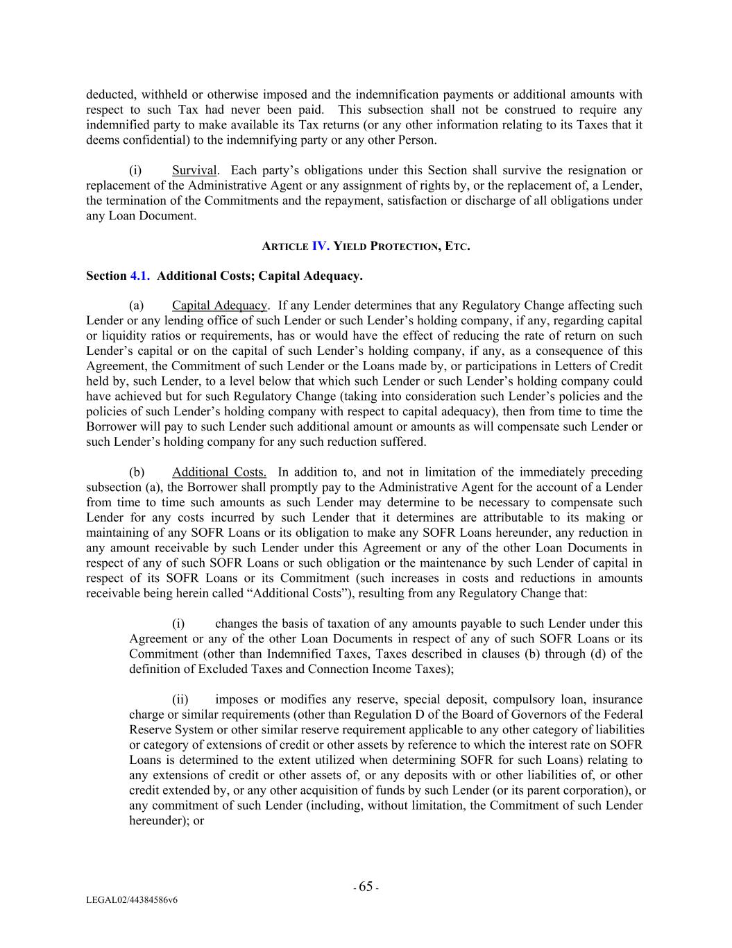 deducted, withheld or otherwise imposed and the indemnification payments or additional amounts with respect to such Tax had never been paid. This subsection shall not be construed to require any indemnified party to make available its Tax returns (or any other information relating to its Taxes that it deems confidential) to the indemnifying party or any other Person. (i) Survival. Each party’s obligations under this Section shall survive the resignation or replacement of the Administrative Agent or any assignment of rights by, or the replacement of, a Lender, the termination of the Commitments and the repayment, satisfaction or discharge of all obligations under any Loan Document. ARTICLE IV. YIELD PROTECTION, ETC. Section 4.1. Additional Costs; Capital Adequacy. (a) Capital Adequacy. If any Lender determines that any Regulatory Change affecting such Lender or any lending office of such Lender or such Lender’s holding company, if any, regarding capital or liquidity ratios or requirements, has or would have the effect of reducing the rate of return on such Lender’s capital or on the capital of such Lender’s holding company, if any, as a consequence of this Agreement, the Commitment of such Lender or the Loans made by, or participations in Letters of Credit held by, such Lender, to a level below that which such Lender or such Lender’s holding company could have achieved but for such Regulatory Change (taking into consideration such Lender’s policies and the policies of such Lender’s holding company with respect to capital adequacy), then from time to time the Borrower will pay to such Lender such additional amount or amounts as will compensate such Lender or such Lender’s holding company for any such reduction suffered. (b) Additional Costs. In addition to, and not in limitation of the immediately preceding subsection (a), the Borrower shall promptly pay to the Administrative Agent for the account of a Lender from time to time such amounts as such Lender may determine to be necessary to compensate such Lender for any costs incurred by such Lender that it determines are attributable to its making or maintaining of any SOFR Loans or its obligation to make any SOFR Loans hereunder, any reduction in any amount receivable by such Lender under this Agreement or any of the other Loan Documents in respect of any of such SOFR Loans or such obligation or the maintenance by such Lender of capital in respect of its SOFR Loans or its Commitment (such increases in costs and reductions in amounts receivable being herein called “Additional Costs”), resulting from any Regulatory Change that: (i) changes the basis of taxation of any amounts payable to such Lender under this Agreement or any of the other Loan Documents in respect of any of such SOFR Loans or its Commitment (other than Indemnified Taxes, Taxes described in clauses (b) through (d) of the definition of Excluded Taxes and Connection Income Taxes); (ii) imposes or modifies any reserve, special deposit, compulsory loan, insurance charge or similar requirements (other than Regulation D of the Board of Governors of the Federal Reserve System or other similar reserve requirement applicable to any other category of liabilities or category of extensions of credit or other assets by reference to which the interest rate on SOFR Loans is determined to the extent utilized when determining SOFR for such Loans) relating to any extensions of credit or other assets of, or any deposits with or other liabilities of, or other credit extended by, or any other acquisition of funds by such Lender (or its parent corporation), or any commitment of such Lender (including, without limitation, the Commitment of such Lender hereunder); or - 65 - LEGAL02/44384586v6