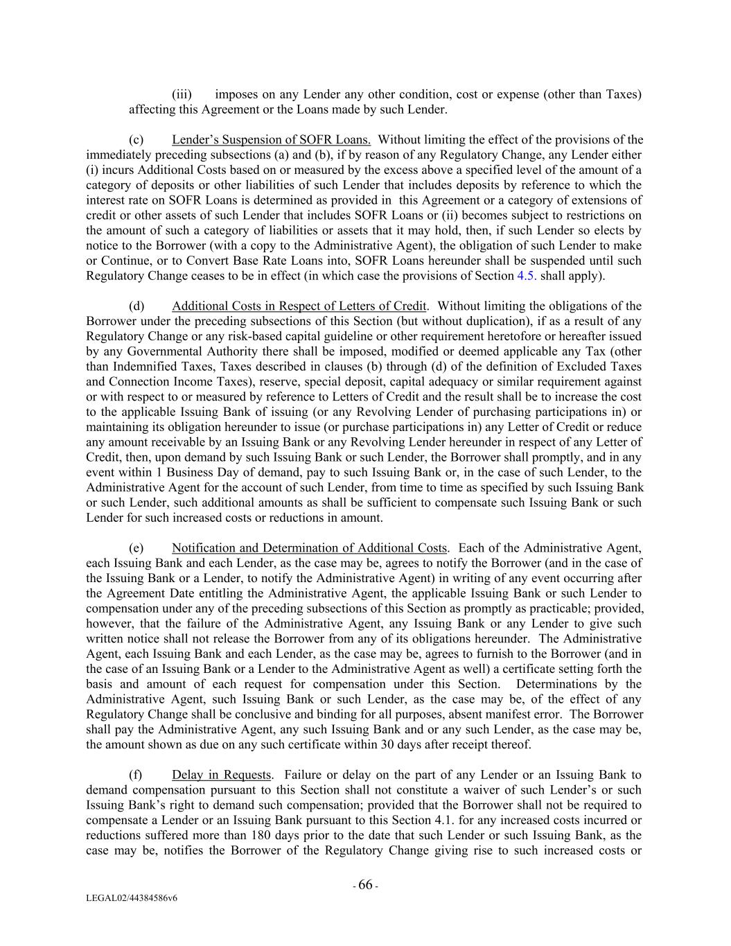 (iii) imposes on any Lender any other condition, cost or expense (other than Taxes) affecting this Agreement or the Loans made by such Lender. (c) Lender’s Suspension of SOFR Loans. Without limiting the effect of the provisions of the immediately preceding subsections (a) and (b), if by reason of any Regulatory Change, any Lender either (i) incurs Additional Costs based on or measured by the excess above a specified level of the amount of a category of deposits or other liabilities of such Lender that includes deposits by reference to which the interest rate on SOFR Loans is determined as provided in this Agreement or a category of extensions of credit or other assets of such Lender that includes SOFR Loans or (ii) becomes subject to restrictions on the amount of such a category of liabilities or assets that it may hold, then, if such Lender so elects by notice to the Borrower (with a copy to the Administrative Agent), the obligation of such Lender to make or Continue, or to Convert Base Rate Loans into, SOFR Loans hereunder shall be suspended until such Regulatory Change ceases to be in effect (in which case the provisions of Section 4.5. shall apply). (d) Additional Costs in Respect of Letters of Credit. Without limiting the obligations of the Borrower under the preceding subsections of this Section (but without duplication), if as a result of any Regulatory Change or any risk-based capital guideline or other requirement heretofore or hereafter issued by any Governmental Authority there shall be imposed, modified or deemed applicable any Tax (other than Indemnified Taxes, Taxes described in clauses (b) through (d) of the definition of Excluded Taxes and Connection Income Taxes), reserve, special deposit, capital adequacy or similar requirement against or with respect to or measured by reference to Letters of Credit and the result shall be to increase the cost to the applicable Issuing Bank of issuing (or any Revolving Lender of purchasing participations in) or maintaining its obligation hereunder to issue (or purchase participations in) any Letter of Credit or reduce any amount receivable by an Issuing Bank or any Revolving Lender hereunder in respect of any Letter of Credit, then, upon demand by such Issuing Bank or such Lender, the Borrower shall promptly, and in any event within 1 Business Day of demand, pay to such Issuing Bank or, in the case of such Lender, to the Administrative Agent for the account of such Lender, from time to time as specified by such Issuing Bank or such Lender, such additional amounts as shall be sufficient to compensate such Issuing Bank or such Lender for such increased costs or reductions in amount. (e) Notification and Determination of Additional Costs. Each of the Administrative Agent, each Issuing Bank and each Lender, as the case may be, agrees to notify the Borrower (and in the case of the Issuing Bank or a Lender, to notify the Administrative Agent) in writing of any event occurring after the Agreement Date entitling the Administrative Agent, the applicable Issuing Bank or such Lender to compensation under any of the preceding subsections of this Section as promptly as practicable; provided, however, that the failure of the Administrative Agent, any Issuing Bank or any Lender to give such written notice shall not release the Borrower from any of its obligations hereunder. The Administrative Agent, each Issuing Bank and each Lender, as the case may be, agrees to furnish to the Borrower (and in the case of an Issuing Bank or a Lender to the Administrative Agent as well) a certificate setting forth the basis and amount of each request for compensation under this Section. Determinations by the Administrative Agent, such Issuing Bank or such Lender, as the case may be, of the effect of any Regulatory Change shall be conclusive and binding for all purposes, absent manifest error. The Borrower shall pay the Administrative Agent, any such Issuing Bank and or any such Lender, as the case may be, the amount shown as due on any such certificate within 30 days after receipt thereof. (f) Delay in Requests. Failure or delay on the part of any Lender or an Issuing Bank to demand compensation pursuant to this Section shall not constitute a waiver of such Lender’s or such Issuing Bank’s right to demand such compensation; provided that the Borrower shall not be required to compensate a Lender or an Issuing Bank pursuant to this Section 4.1. for any increased costs incurred or reductions suffered more than 180 days prior to the date that such Lender or such Issuing Bank, as the case may be, notifies the Borrower of the Regulatory Change giving rise to such increased costs or - 66 - LEGAL02/44384586v6
