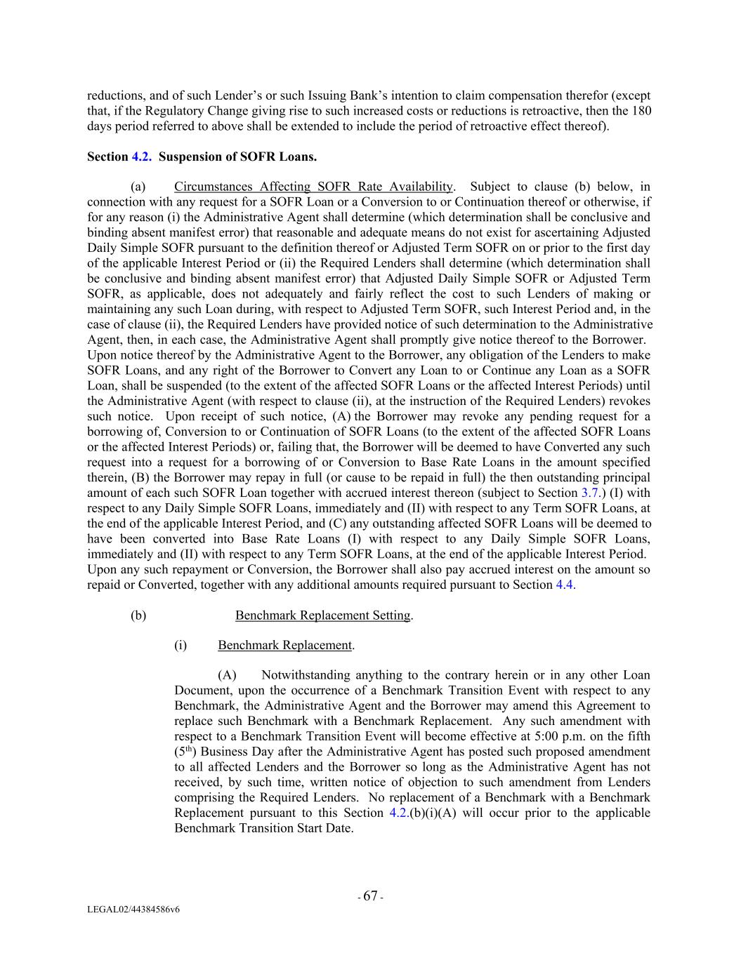 reductions, and of such Lender’s or such Issuing Bank’s intention to claim compensation therefor (except that, if the Regulatory Change giving rise to such increased costs or reductions is retroactive, then the 180 days period referred to above shall be extended to include the period of retroactive effect thereof). Section 4.2. Suspension of SOFR Loans. (a) Circumstances Affecting SOFR Rate Availability. Subject to clause (b) below, in connection with any request for a SOFR Loan or a Conversion to or Continuation thereof or otherwise, if for any reason (i) the Administrative Agent shall determine (which determination shall be conclusive and binding absent manifest error) that reasonable and adequate means do not exist for ascertaining Adjusted Daily Simple SOFR pursuant to the definition thereof or Adjusted Term SOFR on or prior to the first day of the applicable Interest Period or (ii) the Required Lenders shall determine (which determination shall be conclusive and binding absent manifest error) that Adjusted Daily Simple SOFR or Adjusted Term SOFR, as applicable, does not adequately and fairly reflect the cost to such Lenders of making or maintaining any such Loan during, with respect to Adjusted Term SOFR, such Interest Period and, in the case of clause (ii), the Required Lenders have provided notice of such determination to the Administrative Agent, then, in each case, the Administrative Agent shall promptly give notice thereof to the Borrower. Upon notice thereof by the Administrative Agent to the Borrower, any obligation of the Lenders to make SOFR Loans, and any right of the Borrower to Convert any Loan to or Continue any Loan as a SOFR Loan, shall be suspended (to the extent of the affected SOFR Loans or the affected Interest Periods) until the Administrative Agent (with respect to clause (ii), at the instruction of the Required Lenders) revokes such notice. Upon receipt of such notice, (A) the Borrower may revoke any pending request for a borrowing of, Conversion to or Continuation of SOFR Loans (to the extent of the affected SOFR Loans or the affected Interest Periods) or, failing that, the Borrower will be deemed to have Converted any such request into a request for a borrowing of or Conversion to Base Rate Loans in the amount specified therein, (B) the Borrower may repay in full (or cause to be repaid in full) the then outstanding principal amount of each such SOFR Loan together with accrued interest thereon (subject to Section 3.7.) (I) with respect to any Daily Simple SOFR Loans, immediately and (II) with respect to any Term SOFR Loans, at the end of the applicable Interest Period, and (C) any outstanding affected SOFR Loans will be deemed to have been converted into Base Rate Loans (I) with respect to any Daily Simple SOFR Loans, immediately and (II) with respect to any Term SOFR Loans, at the end of the applicable Interest Period. Upon any such repayment or Conversion, the Borrower shall also pay accrued interest on the amount so repaid or Converted, together with any additional amounts required pursuant to Section 4.4. (b) Benchmark Replacement Setting. (i) Benchmark Replacement. (A) Notwithstanding anything to the contrary herein or in any other Loan Document, upon the occurrence of a Benchmark Transition Event with respect to any Benchmark, the Administrative Agent and the Borrower may amend this Agreement to replace such Benchmark with a Benchmark Replacement. Any such amendment with respect to a Benchmark Transition Event will become effective at 5:00 p.m. on the fifth (5th) Business Day after the Administrative Agent has posted such proposed amendment to all affected Lenders and the Borrower so long as the Administrative Agent has not received, by such time, written notice of objection to such amendment from Lenders comprising the Required Lenders. No replacement of a Benchmark with a Benchmark Replacement pursuant to this Section 4.2.(b)(i)(A) will occur prior to the applicable Benchmark Transition Start Date. - 67 - LEGAL02/44384586v6