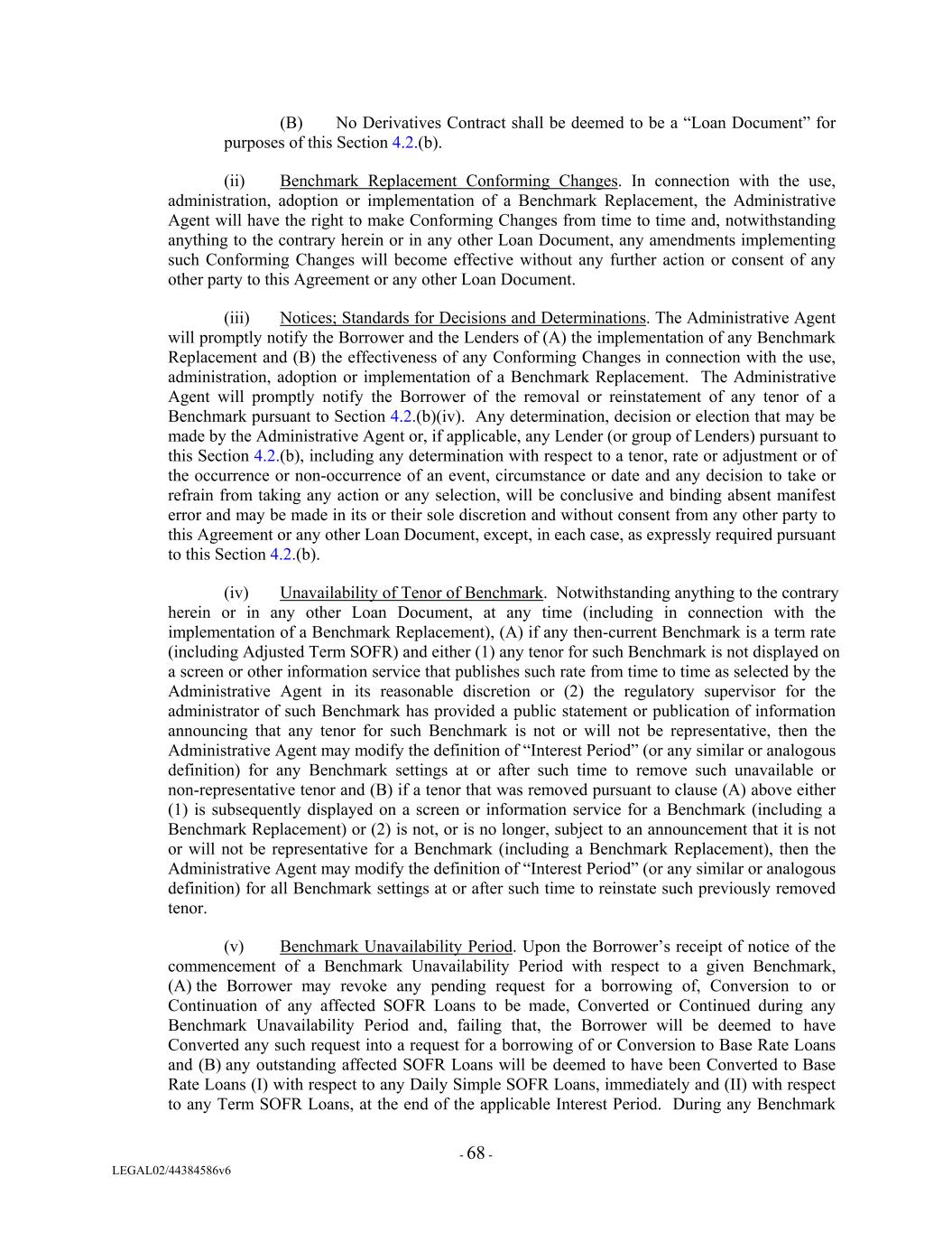 (B) No Derivatives Contract shall be deemed to be a “Loan Document” for purposes of this Section 4.2.(b). (ii) Benchmark Replacement Conforming Changes. In connection with the use, administration, adoption or implementation of a Benchmark Replacement, the Administrative Agent will have the right to make Conforming Changes from time to time and, notwithstanding anything to the contrary herein or in any other Loan Document, any amendments implementing such Conforming Changes will become effective without any further action or consent of any other party to this Agreement or any other Loan Document. (iii) Notices; Standards for Decisions and Determinations. The Administrative Agent will promptly notify the Borrower and the Lenders of (A) the implementation of any Benchmark Replacement and (B) the effectiveness of any Conforming Changes in connection with the use, administration, adoption or implementation of a Benchmark Replacement. The Administrative Agent will promptly notify the Borrower of the removal or reinstatement of any tenor of a Benchmark pursuant to Section 4.2.(b)(iv). Any determination, decision or election that may be made by the Administrative Agent or, if applicable, any Lender (or group of Lenders) pursuant to this Section 4.2.(b), including any determination with respect to a tenor, rate or adjustment or of the occurrence or non-occurrence of an event, circumstance or date and any decision to take or refrain from taking any action or any selection, will be conclusive and binding absent manifest error and may be made in its or their sole discretion and without consent from any other party to this Agreement or any other Loan Document, except, in each case, as expressly required pursuant to this Section 4.2.(b). (iv) Unavailability of Tenor of Benchmark. Notwithstanding anything to the contrary herein or in any other Loan Document, at any time (including in connection with the implementation of a Benchmark Replacement), (A) if any then-current Benchmark is a term rate (including Adjusted Term SOFR) and either (1) any tenor for such Benchmark is not displayed on a screen or other information service that publishes such rate from time to time as selected by the Administrative Agent in its reasonable discretion or (2) the regulatory supervisor for the administrator of such Benchmark has provided a public statement or publication of information announcing that any tenor for such Benchmark is not or will not be representative, then the Administrative Agent may modify the definition of “Interest Period” (or any similar or analogous definition) for any Benchmark settings at or after such time to remove such unavailable or non-representative tenor and (B) if a tenor that was removed pursuant to clause (A) above either (1) is subsequently displayed on a screen or information service for a Benchmark (including a Benchmark Replacement) or (2) is not, or is no longer, subject to an announcement that it is not or will not be representative for a Benchmark (including a Benchmark Replacement), then the Administrative Agent may modify the definition of “Interest Period” (or any similar or analogous definition) for all Benchmark settings at or after such time to reinstate such previously removed tenor. (v) Benchmark Unavailability Period. Upon the Borrower’s receipt of notice of the commencement of a Benchmark Unavailability Period with respect to a given Benchmark, (A) the Borrower may revoke any pending request for a borrowing of, Conversion to or Continuation of any affected SOFR Loans to be made, Converted or Continued during any Benchmark Unavailability Period and, failing that, the Borrower will be deemed to have Converted any such request into a request for a borrowing of or Conversion to Base Rate Loans and (B) any outstanding affected SOFR Loans will be deemed to have been Converted to Base Rate Loans (I) with respect to any Daily Simple SOFR Loans, immediately and (II) with respect to any Term SOFR Loans, at the end of the applicable Interest Period. During any Benchmark - 68 - LEGAL02/44384586v6