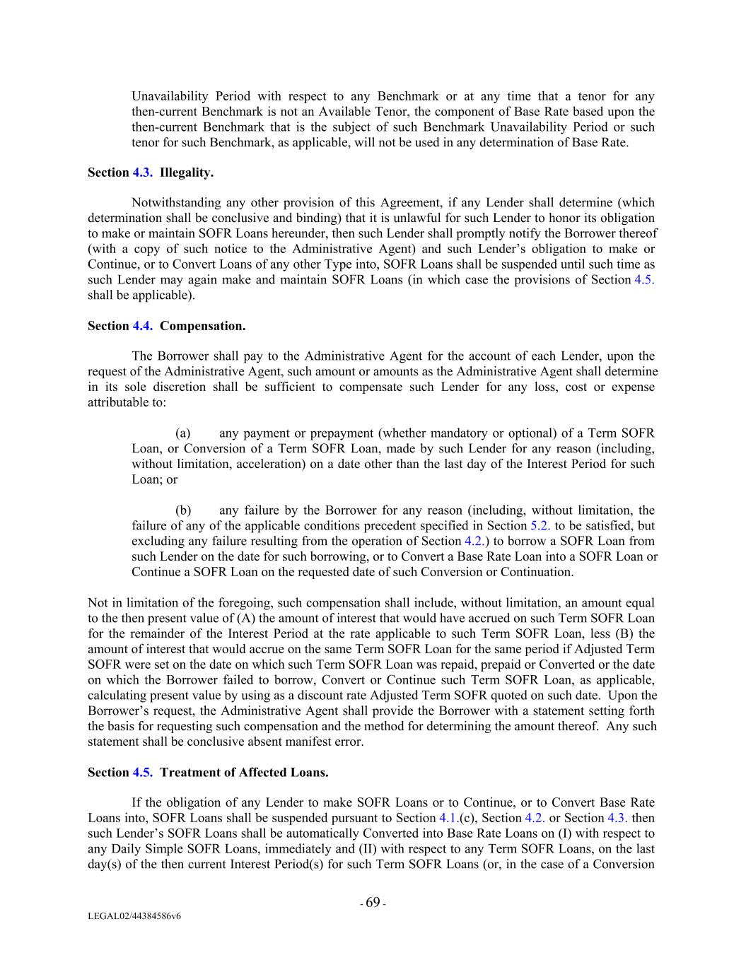 Unavailability Period with respect to any Benchmark or at any time that a tenor for any then-current Benchmark is not an Available Tenor, the component of Base Rate based upon the then-current Benchmark that is the subject of such Benchmark Unavailability Period or such tenor for such Benchmark, as applicable, will not be used in any determination of Base Rate. Section 4.3. Illegality. Notwithstanding any other provision of this Agreement, if any Lender shall determine (which determination shall be conclusive and binding) that it is unlawful for such Lender to honor its obligation to make or maintain SOFR Loans hereunder, then such Lender shall promptly notify the Borrower thereof (with a copy of such notice to the Administrative Agent) and such Lender’s obligation to make or Continue, or to Convert Loans of any other Type into, SOFR Loans shall be suspended until such time as such Lender may again make and maintain SOFR Loans (in which case the provisions of Section 4.5. shall be applicable). Section 4.4. Compensation. The Borrower shall pay to the Administrative Agent for the account of each Lender, upon the request of the Administrative Agent, such amount or amounts as the Administrative Agent shall determine in its sole discretion shall be sufficient to compensate such Lender for any loss, cost or expense attributable to: (a) any payment or prepayment (whether mandatory or optional) of a Term SOFR Loan, or Conversion of a Term SOFR Loan, made by such Lender for any reason (including, without limitation, acceleration) on a date other than the last day of the Interest Period for such Loan; or (b) any failure by the Borrower for any reason (including, without limitation, the failure of any of the applicable conditions precedent specified in Section 5.2. to be satisfied, but excluding any failure resulting from the operation of Section 4.2.) to borrow a SOFR Loan from such Lender on the date for such borrowing, or to Convert a Base Rate Loan into a SOFR Loan or Continue a SOFR Loan on the requested date of such Conversion or Continuation. Not in limitation of the foregoing, such compensation shall include, without limitation, an amount equal to the then present value of (A) the amount of interest that would have accrued on such Term SOFR Loan for the remainder of the Interest Period at the rate applicable to such Term SOFR Loan, less (B) the amount of interest that would accrue on the same Term SOFR Loan for the same period if Adjusted Term SOFR were set on the date on which such Term SOFR Loan was repaid, prepaid or Converted or the date on which the Borrower failed to borrow, Convert or Continue such Term SOFR Loan, as applicable, calculating present value by using as a discount rate Adjusted Term SOFR quoted on such date. Upon the Borrower’s request, the Administrative Agent shall provide the Borrower with a statement setting forth the basis for requesting such compensation and the method for determining the amount thereof. Any such statement shall be conclusive absent manifest error. Section 4.5. Treatment of Affected Loans. If the obligation of any Lender to make SOFR Loans or to Continue, or to Convert Base Rate Loans into, SOFR Loans shall be suspended pursuant to Section 4.1.(c), Section 4.2. or Section 4.3. then such Lender’s SOFR Loans shall be automatically Converted into Base Rate Loans on (I) with respect to any Daily Simple SOFR Loans, immediately and (II) with respect to any Term SOFR Loans, on the last day(s) of the then current Interest Period(s) for such Term SOFR Loans (or, in the case of a Conversion - 69 - LEGAL02/44384586v6