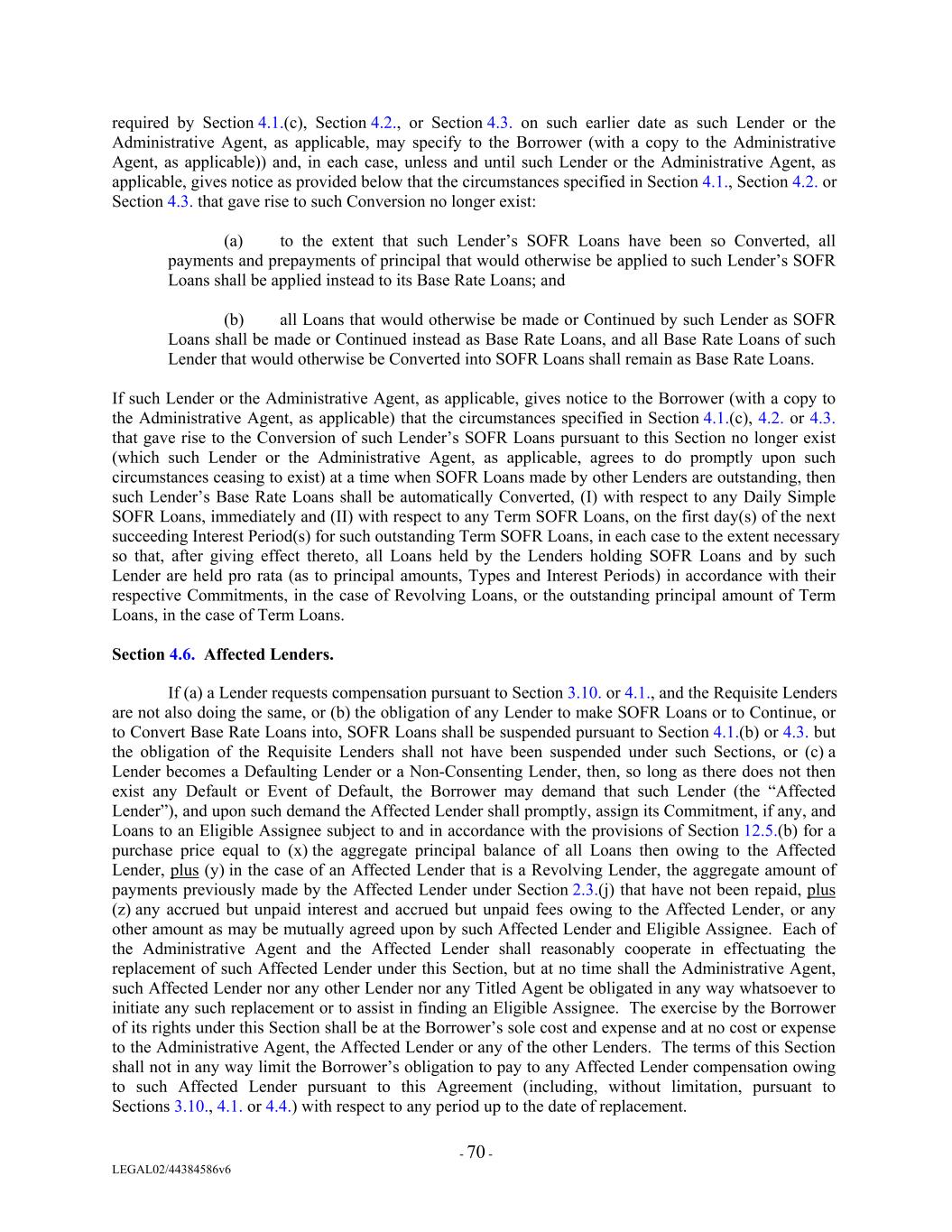 required by Section 4.1.(c), Section 4.2., or Section 4.3. on such earlier date as such Lender or the Administrative Agent, as applicable, may specify to the Borrower (with a copy to the Administrative Agent, as applicable)) and, in each case, unless and until such Lender or the Administrative Agent, as applicable, gives notice as provided below that the circumstances specified in Section 4.1., Section 4.2. or Section 4.3. that gave rise to such Conversion no longer exist: (a) to the extent that such Lender’s SOFR Loans have been so Converted, all payments and prepayments of principal that would otherwise be applied to such Lender’s SOFR Loans shall be applied instead to its Base Rate Loans; and (b) all Loans that would otherwise be made or Continued by such Lender as SOFR Loans shall be made or Continued instead as Base Rate Loans, and all Base Rate Loans of such Lender that would otherwise be Converted into SOFR Loans shall remain as Base Rate Loans. If such Lender or the Administrative Agent, as applicable, gives notice to the Borrower (with a copy to the Administrative Agent, as applicable) that the circumstances specified in Section 4.1.(c), 4.2. or 4.3. that gave rise to the Conversion of such Lender’s SOFR Loans pursuant to this Section no longer exist (which such Lender or the Administrative Agent, as applicable, agrees to do promptly upon such circumstances ceasing to exist) at a time when SOFR Loans made by other Lenders are outstanding, then such Lender’s Base Rate Loans shall be automatically Converted, (I) with respect to any Daily Simple SOFR Loans, immediately and (II) with respect to any Term SOFR Loans, on the first day(s) of the next succeeding Interest Period(s) for such outstanding Term SOFR Loans, in each case to the extent necessary so that, after giving effect thereto, all Loans held by the Lenders holding SOFR Loans and by such Lender are held pro rata (as to principal amounts, Types and Interest Periods) in accordance with their respective Commitments, in the case of Revolving Loans, or the outstanding principal amount of Term Loans, in the case of Term Loans. Section 4.6. Affected Lenders. If (a) a Lender requests compensation pursuant to Section 3.10. or 4.1., and the Requisite Lenders are not also doing the same, or (b) the obligation of any Lender to make SOFR Loans or to Continue, or to Convert Base Rate Loans into, SOFR Loans shall be suspended pursuant to Section 4.1.(b) or 4.3. but the obligation of the Requisite Lenders shall not have been suspended under such Sections, or (c) a Lender becomes a Defaulting Lender or a Non-Consenting Lender, then, so long as there does not then exist any Default or Event of Default, the Borrower may demand that such Lender (the “Affected Lender”), and upon such demand the Affected Lender shall promptly, assign its Commitment, if any, and Loans to an Eligible Assignee subject to and in accordance with the provisions of Section 12.5.(b) for a purchase price equal to (x) the aggregate principal balance of all Loans then owing to the Affected Lender, plus (y) in the case of an Affected Lender that is a Revolving Lender, the aggregate amount of payments previously made by the Affected Lender under Section 2.3.(j) that have not been repaid, plus (z) any accrued but unpaid interest and accrued but unpaid fees owing to the Affected Lender, or any other amount as may be mutually agreed upon by such Affected Lender and Eligible Assignee. Each of the Administrative Agent and the Affected Lender shall reasonably cooperate in effectuating the replacement of such Affected Lender under this Section, but at no time shall the Administrative Agent, such Affected Lender nor any other Lender nor any Titled Agent be obligated in any way whatsoever to initiate any such replacement or to assist in finding an Eligible Assignee. The exercise by the Borrower of its rights under this Section shall be at the Borrower’s sole cost and expense and at no cost or expense to the Administrative Agent, the Affected Lender or any of the other Lenders. The terms of this Section shall not in any way limit the Borrower’s obligation to pay to any Affected Lender compensation owing to such Affected Lender pursuant to this Agreement (including, without limitation, pursuant to Sections 3.10., 4.1. or 4.4.) with respect to any period up to the date of replacement. - 70 - LEGAL02/44384586v6