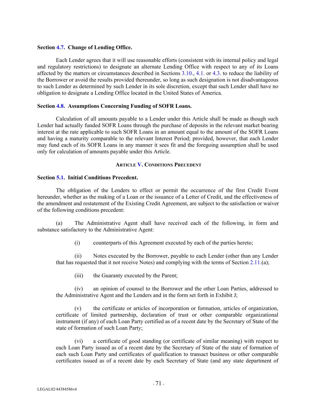 Section 4.7. Change of Lending Office. Each Lender agrees that it will use reasonable efforts (consistent with its internal policy and legal and regulatory restrictions) to designate an alternate Lending Office with respect to any of its Loans affected by the matters or circumstances described in Sections 3.10., 4.1. or 4.3. to reduce the liability of the Borrower or avoid the results provided thereunder, so long as such designation is not disadvantageous to such Lender as determined by such Lender in its sole discretion, except that such Lender shall have no obligation to designate a Lending Office located in the United States of America. Section 4.8. Assumptions Concerning Funding of SOFR Loans. Calculation of all amounts payable to a Lender under this Article shall be made as though such Lender had actually funded SOFR Loans through the purchase of deposits in the relevant market bearing interest at the rate applicable to such SOFR Loans in an amount equal to the amount of the SOFR Loans and having a maturity comparable to the relevant Interest Period; provided, however, that each Lender may fund each of its SOFR Loans in any manner it sees fit and the foregoing assumption shall be used only for calculation of amounts payable under this Article. ARTICLE V. CONDITIONS PRECEDENT Section 5.1. Initial Conditions Precedent. The obligation of the Lenders to effect or permit the occurrence of the first Credit Event hereunder, whether as the making of a Loan or the issuance of a Letter of Credit, and the effectiveness of the amendment and restatement of the Existing Credit Agreement, are subject to the satisfaction or waiver of the following conditions precedent: (a) The Administrative Agent shall have received each of the following, in form and substance satisfactory to the Administrative Agent: (i) counterparts of this Agreement executed by each of the parties hereto; (ii) Notes executed by the Borrower, payable to each Lender (other than any Lender that has requested that it not receive Notes) and complying with the terms of Section 2.11.(a); (iii) the Guaranty executed by the Parent; (iv) an opinion of counsel to the Borrower and the other Loan Parties, addressed to the Administrative Agent and the Lenders and in the form set forth in Exhibit J; (v) the certificate or articles of incorporation or formation, articles of organization, certificate of limited partnership, declaration of trust or other comparable organizational instrument (if any) of each Loan Party certified as of a recent date by the Secretary of State of the state of formation of such Loan Party; (vi) a certificate of good standing (or certificate of similar meaning) with respect to each Loan Party issued as of a recent date by the Secretary of State of the state of formation of each such Loan Party and certificates of qualification to transact business or other comparable certificates issued as of a recent date by each Secretary of State (and any state department of - 71 - LEGAL02/44384586v6