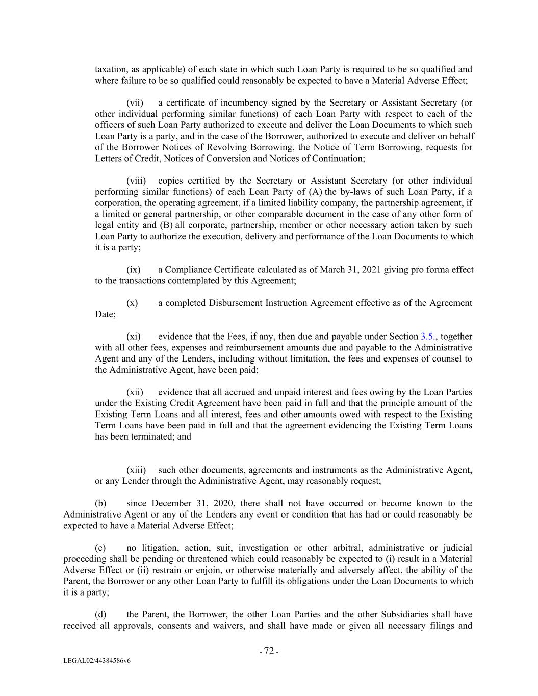 taxation, as applicable) of each state in which such Loan Party is required to be so qualified and where failure to be so qualified could reasonably be expected to have a Material Adverse Effect; (vii) a certificate of incumbency signed by the Secretary or Assistant Secretary (or other individual performing similar functions) of each Loan Party with respect to each of the officers of such Loan Party authorized to execute and deliver the Loan Documents to which such Loan Party is a party, and in the case of the Borrower, authorized to execute and deliver on behalf of the Borrower Notices of Revolving Borrowing, the Notice of Term Borrowing, requests for Letters of Credit, Notices of Conversion and Notices of Continuation; (viii) copies certified by the Secretary or Assistant Secretary (or other individual performing similar functions) of each Loan Party of (A) the by-laws of such Loan Party, if a corporation, the operating agreement, if a limited liability company, the partnership agreement, if a limited or general partnership, or other comparable document in the case of any other form of legal entity and (B) all corporate, partnership, member or other necessary action taken by such Loan Party to authorize the execution, delivery and performance of the Loan Documents to which it is a party; (ix) a Compliance Certificate calculated as of March 31, 2021 giving pro forma effect to the transactions contemplated by this Agreement; (x) a completed Disbursement Instruction Agreement effective as of the Agreement Date; (xi) evidence that the Fees, if any, then due and payable under Section 3.5., together with all other fees, expenses and reimbursement amounts due and payable to the Administrative Agent and any of the Lenders, including without limitation, the fees and expenses of counsel to the Administrative Agent, have been paid; (xii) evidence that all accrued and unpaid interest and fees owing by the Loan Parties under the Existing Credit Agreement have been paid in full and that the principle amount of the Existing Term Loans and all interest, fees and other amounts owed with respect to the Existing Term Loans have been paid in full and that the agreement evidencing the Existing Term Loans has been terminated; and (xiii) such other documents, agreements and instruments as the Administrative Agent, or any Lender through the Administrative Agent, may reasonably request; (b) since December 31, 2020, there shall not have occurred or become known to the Administrative Agent or any of the Lenders any event or condition that has had or could reasonably be expected to have a Material Adverse Effect; (c) no litigation, action, suit, investigation or other arbitral, administrative or judicial proceeding shall be pending or threatened which could reasonably be expected to (i) result in a Material Adverse Effect or (ii) restrain or enjoin, or otherwise materially and adversely affect, the ability of the Parent, the Borrower or any other Loan Party to fulfill its obligations under the Loan Documents to which it is a party; (d) the Parent, the Borrower, the other Loan Parties and the other Subsidiaries shall have received all approvals, consents and waivers, and shall have made or given all necessary filings and - 72 - LEGAL02/44384586v6