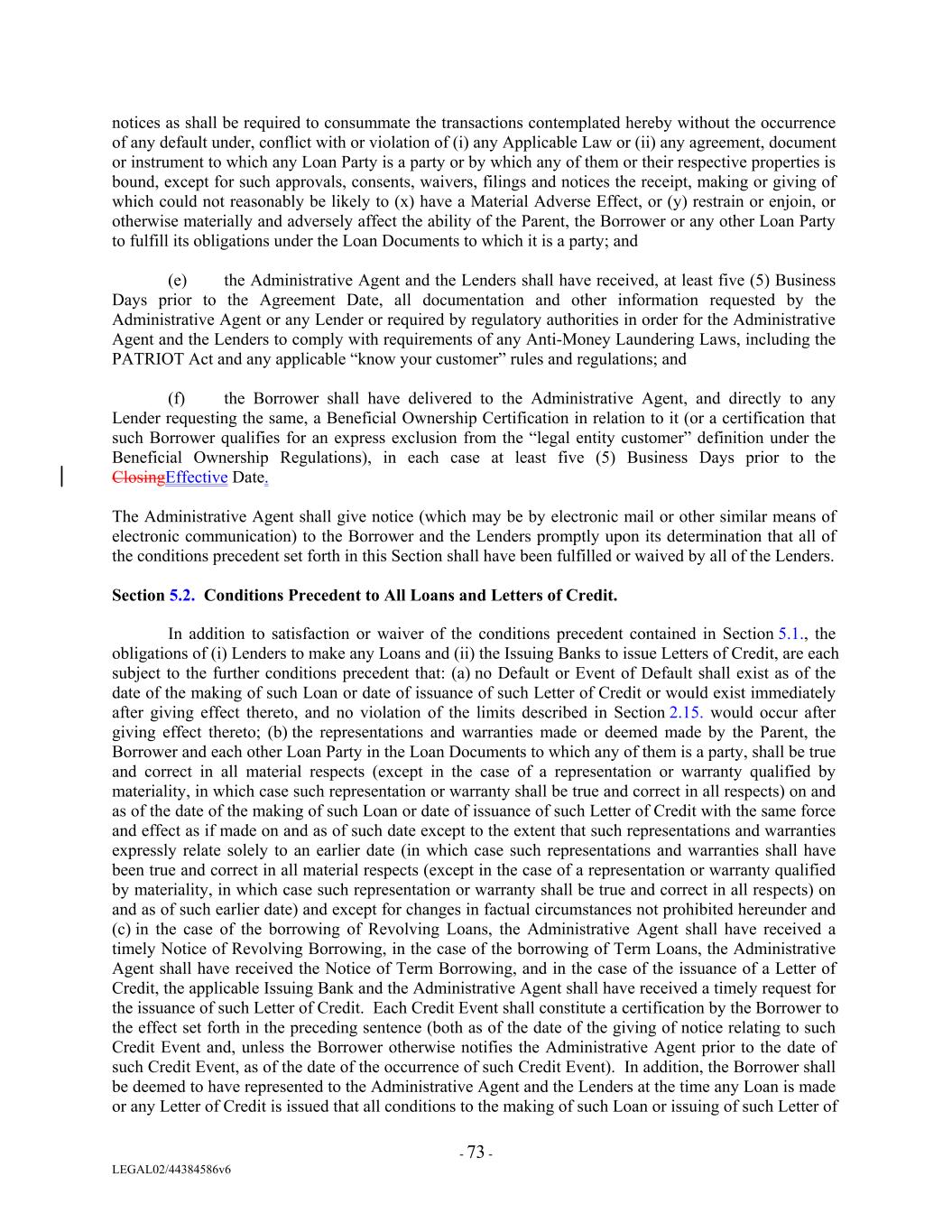 notices as shall be required to consummate the transactions contemplated hereby without the occurrence of any default under, conflict with or violation of (i) any Applicable Law or (ii) any agreement, document or instrument to which any Loan Party is a party or by which any of them or their respective properties is bound, except for such approvals, consents, waivers, filings and notices the receipt, making or giving of which could not reasonably be likely to (x) have a Material Adverse Effect, or (y) restrain or enjoin, or otherwise materially and adversely affect the ability of the Parent, the Borrower or any other Loan Party to fulfill its obligations under the Loan Documents to which it is a party; and (e) the Administrative Agent and the Lenders shall have received, at least five (5) Business Days prior to the Agreement Date, all documentation and other information requested by the Administrative Agent or any Lender or required by regulatory authorities in order for the Administrative Agent and the Lenders to comply with requirements of any Anti-Money Laundering Laws, including the PATRIOT Act and any applicable “know your customer” rules and regulations; and (f) the Borrower shall have delivered to the Administrative Agent, and directly to any Lender requesting the same, a Beneficial Ownership Certification in relation to it (or a certification that such Borrower qualifies for an express exclusion from the “legal entity customer” definition under the Beneficial Ownership Regulations), in each case at least five (5) Business Days prior to the ClosingEffective Date. The Administrative Agent shall give notice (which may be by electronic mail or other similar means of electronic communication) to the Borrower and the Lenders promptly upon its determination that all of the conditions precedent set forth in this Section shall have been fulfilled or waived by all of the Lenders. Section 5.2. Conditions Precedent to All Loans and Letters of Credit. In addition to satisfaction or waiver of the conditions precedent contained in Section 5.1., the obligations of (i) Lenders to make any Loans and (ii) the Issuing Banks to issue Letters of Credit, are each subject to the further conditions precedent that: (a) no Default or Event of Default shall exist as of the date of the making of such Loan or date of issuance of such Letter of Credit or would exist immediately after giving effect thereto, and no violation of the limits described in Section 2.15. would occur after giving effect thereto; (b) the representations and warranties made or deemed made by the Parent, the Borrower and each other Loan Party in the Loan Documents to which any of them is a party, shall be true and correct in all material respects (except in the case of a representation or warranty qualified by materiality, in which case such representation or warranty shall be true and correct in all respects) on and as of the date of the making of such Loan or date of issuance of such Letter of Credit with the same force and effect as if made on and as of such date except to the extent that such representations and warranties expressly relate solely to an earlier date (in which case such representations and warranties shall have been true and correct in all material respects (except in the case of a representation or warranty qualified by materiality, in which case such representation or warranty shall be true and correct in all respects) on and as of such earlier date) and except for changes in factual circumstances not prohibited hereunder and (c) in the case of the borrowing of Revolving Loans, the Administrative Agent shall have received a timely Notice of Revolving Borrowing, in the case of the borrowing of Term Loans, the Administrative Agent shall have received the Notice of Term Borrowing, and in the case of the issuance of a Letter of Credit, the applicable Issuing Bank and the Administrative Agent shall have received a timely request for the issuance of such Letter of Credit. Each Credit Event shall constitute a certification by the Borrower to the effect set forth in the preceding sentence (both as of the date of the giving of notice relating to such Credit Event and, unless the Borrower otherwise notifies the Administrative Agent prior to the date of such Credit Event, as of the date of the occurrence of such Credit Event). In addition, the Borrower shall be deemed to have represented to the Administrative Agent and the Lenders at the time any Loan is made or any Letter of Credit is issued that all conditions to the making of such Loan or issuing of such Letter of - 73 - LEGAL02/44384586v6