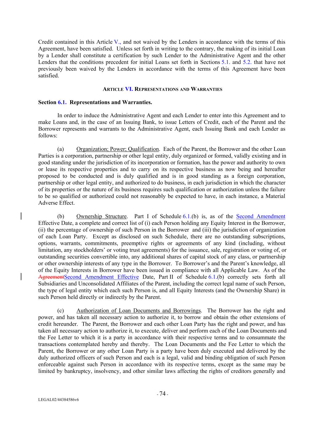 Credit contained in this Article V., and not waived by the Lenders in accordance with the terms of this Agreement, have been satisfied. Unless set forth in writing to the contrary, the making of its initial Loan by a Lender shall constitute a certification by such Lender to the Administrative Agent and the other Lenders that the conditions precedent for initial Loans set forth in Sections 5.1. and 5.2. that have not previously been waived by the Lenders in accordance with the terms of this Agreement have been satisfied. ARTICLE VI. REPRESENTATIONS AND WARRANTIES Section 6.1. Representations and Warranties. In order to induce the Administrative Agent and each Lender to enter into this Agreement and to make Loans and, in the case of an Issuing Bank, to issue Letters of Credit, each of the Parent and the Borrower represents and warrants to the Administrative Agent, each Issuing Bank and each Lender as follows: (a) Organization; Power; Qualification. Each of the Parent, the Borrower and the other Loan Parties is a corporation, partnership or other legal entity, duly organized or formed, validly existing and in good standing under the jurisdiction of its incorporation or formation, has the power and authority to own or lease its respective properties and to carry on its respective business as now being and hereafter proposed to be conducted and is duly qualified and is in good standing as a foreign corporation, partnership or other legal entity, and authorized to do business, in each jurisdiction in which the character of its properties or the nature of its business requires such qualification or authorization unless the failure to be so qualified or authorized could not reasonably be expected to have, in each instance, a Material Adverse Effect. (b) Ownership Structure. Part I of Schedule 6.1.(b) is, as of the Second Amendment Effective Date, a complete and correct list of (i) each Person holding any Equity Interest in the Borrower, (ii) the percentage of ownership of such Person in the Borrower and (iii) the jurisdiction of organization of each Loan Party. Except as disclosed on such Schedule, there are no outstanding subscriptions, options, warrants, commitments, preemptive rights or agreements of any kind (including, without limitation, any stockholders’ or voting trust agreements) for the issuance, sale, registration or voting of, or outstanding securities convertible into, any additional shares of capital stock of any class, or partnership or other ownership interests of any type in the Borrower. To Borrower’s and the Parent’s knowledge, all of the Equity Interests in Borrower have been issued in compliance with all Applicable Law. As of the AgreementSecond Amendment Effective Date, Part II of Schedule 6.1.(b) correctly sets forth all Subsidiaries and Unconsolidated Affiliates of the Parent, including the correct legal name of such Person, the type of legal entity which each such Person is, and all Equity Interests (and the Ownership Share) in such Person held directly or indirectly by the Parent. (c) Authorization of Loan Documents and Borrowings. The Borrower has the right and power, and has taken all necessary action to authorize it, to borrow and obtain the other extensions of credit hereunder. The Parent, the Borrower and each other Loan Party has the right and power, and has taken all necessary action to authorize it, to execute, deliver and perform each of the Loan Documents and the Fee Letter to which it is a party in accordance with their respective terms and to consummate the transactions contemplated hereby and thereby. The Loan Documents and the Fee Letter to which the Parent, the Borrower or any other Loan Party is a party have been duly executed and delivered by the duly authorized officers of such Person and each is a legal, valid and binding obligation of such Person enforceable against such Person in accordance with its respective terms, except as the same may be limited by bankruptcy, insolvency, and other similar laws affecting the rights of creditors generally and - 74 - LEGAL02/44384586v6