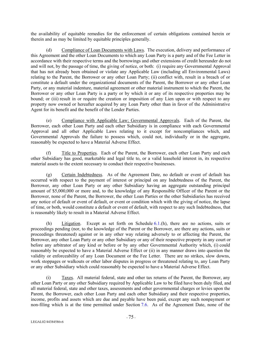 the availability of equitable remedies for the enforcement of certain obligations contained herein or therein and as may be limited by equitable principles generally. (d) Compliance of Loan Documents with Laws. The execution, delivery and performance of this Agreement and the other Loan Documents to which any Loan Party is a party and of the Fee Letter in accordance with their respective terms and the borrowings and other extensions of credit hereunder do not and will not, by the passage of time, the giving of notice, or both: (i) require any Governmental Approval that has not already been obtained or violate any Applicable Law (including all Environmental Laws) relating to the Parent, the Borrower or any other Loan Party; (ii) conflict with, result in a breach of or constitute a default under the organizational documents of the Parent, the Borrower or any other Loan Party, or any material indenture, material agreement or other material instrument to which the Parent, the Borrower or any other Loan Party is a party or by which it or any of its respective properties may be bound; or (iii) result in or require the creation or imposition of any Lien upon or with respect to any property now owned or hereafter acquired by any Loan Party other than in favor of the Administrative Agent for its benefit and the benefit of the Lender Parties. (e) Compliance with Applicable Law; Governmental Approvals. Each of the Parent, the Borrower, each other Loan Party and each other Subsidiary is in compliance with each Governmental Approval and all other Applicable Laws relating to it except for noncompliances which, and Governmental Approvals the failure to possess which, could not, individually or in the aggregate, reasonably be expected to have a Material Adverse Effect. (f) Title to Properties. Each of the Parent, the Borrower, each other Loan Party and each other Subsidiary has good, marketable and legal title to, or a valid leasehold interest in, its respective material assets to the extent necessary to conduct their respective businesses. (g) Certain Indebtedness. As of the Agreement Date, no default or event of default has occurred with respect to the payment of interest or principal on any Indebtedness of the Parent, the Borrower, any other Loan Party or any other Subsidiary having an aggregate outstanding principal amount of $5,000,000 or more and, to the knowledge of any Responsible Officer of the Parent or the Borrower, none of the Parent, the Borrower, the other Loan Parties or the other Subsidiaries has received any notice of default or event of default, or event or condition which with the giving of notice, the lapse of time, or both, would constitute a default or event of default, with respect to any such Indebtedness, that is reasonably likely to result in a Material Adverse Effect. (h) Litigation. Except as set forth on Schedule 6.1.(h), there are no actions, suits or proceedings pending (nor, to the knowledge of the Parent or the Borrower, are there any actions, suits or proceedings threatened) against or in any other way relating adversely to or affecting the Parent, the Borrower, any other Loan Party or any other Subsidiary or any of their respective property in any court or before any arbitrator of any kind or before or by any other Governmental Authority which, (i) could reasonably be expected to have a Material Adverse Effect or (ii) in any manner draws into question the validity or enforceability of any Loan Document or the Fee Letter. There are no strikes, slow downs, work stoppages or walkouts or other labor disputes in progress or threatened relating to, any Loan Party or any other Subsidiary which could reasonably be expected to have a Material Adverse Effect. (i) Taxes. All material federal, state and other tax returns of the Parent, the Borrower, any other Loan Party or any other Subsidiary required by Applicable Law to be filed have been duly filed, and all material federal, state and other taxes, assessments and other governmental charges or levies upon the Parent, the Borrower, each other Loan Party and each other Subsidiary and their respective properties, income, profits and assets which are due and payable have been paid, except any such nonpayment or non-filing which is at the time permitted under Section 7.6. As of the Agreement Date, none of the - 75 - LEGAL02/44384586v6
