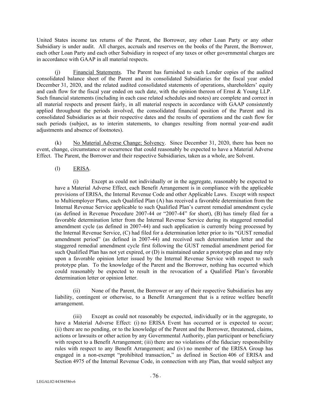 United States income tax returns of the Parent, the Borrower, any other Loan Party or any other Subsidiary is under audit. All charges, accruals and reserves on the books of the Parent, the Borrower, each other Loan Party and each other Subsidiary in respect of any taxes or other governmental charges are in accordance with GAAP in all material respects. (j) Financial Statements. The Parent has furnished to each Lender copies of the audited consolidated balance sheet of the Parent and its consolidated Subsidiaries for the fiscal year ended December 31, 2020, and the related audited consolidated statements of operations, shareholders’ equity and cash flow for the fiscal year ended on such date, with the opinion thereon of Ernst & Young LLP. Such financial statements (including in each case related schedules and notes) are complete and correct in all material respects and present fairly, in all material respects in accordance with GAAP consistently applied throughout the periods involved, the consolidated financial position of the Parent and its consolidated Subsidiaries as at their respective dates and the results of operations and the cash flow for such periods (subject, as to interim statements, to changes resulting from normal year-end audit adjustments and absence of footnotes). (k) No Material Adverse Change; Solvency. Since December 31, 2020, there has been no event, change, circumstance or occurrence that could reasonably be expected to have a Material Adverse Effect. The Parent, the Borrower and their respective Subsidiaries, taken as a whole, are Solvent. (l) ERISA. (i) Except as could not individually or in the aggregate, reasonably be expected to have a Material Adverse Effect, each Benefit Arrangement is in compliance with the applicable provisions of ERISA, the Internal Revenue Code and other Applicable Laws. Except with respect to Multiemployer Plans, each Qualified Plan (A) has received a favorable determination from the Internal Revenue Service applicable to such Qualified Plan’s current remedial amendment cycle (as defined in Revenue Procedure 2007-44 or “2007-44” for short), (B) has timely filed for a favorable determination letter from the Internal Revenue Service during its staggered remedial amendment cycle (as defined in 2007-44) and such application is currently being processed by the Internal Revenue Service, (C) had filed for a determination letter prior to its “GUST remedial amendment period” (as defined in 2007-44) and received such determination letter and the staggered remedial amendment cycle first following the GUST remedial amendment period for such Qualified Plan has not yet expired, or (D) is maintained under a prototype plan and may rely upon a favorable opinion letter issued by the Internal Revenue Service with respect to such prototype plan. To the knowledge of the Parent and the Borrower, nothing has occurred which could reasonably be expected to result in the revocation of a Qualified Plan’s favorable determination letter or opinion letter. (ii) None of the Parent, the Borrower or any of their respective Subsidiaries has any liability, contingent or otherwise, to a Benefit Arrangement that is a retiree welfare benefit arrangement. (iii) Except as could not reasonably be expected, individually or in the aggregate, to have a Material Adverse Effect: (i) no ERISA Event has occurred or is expected to occur; (ii) there are no pending, or to the knowledge of the Parent and the Borrower, threatened, claims, actions or lawsuits or other action by any Governmental Authority, plan participant or beneficiary with respect to a Benefit Arrangement; (iii) there are no violations of the fiduciary responsibility rules with respect to any Benefit Arrangement; and (iv) no member of the ERISA Group has engaged in a non-exempt “prohibited transaction,” as defined in Section 406 of ERISA and Section 4975 of the Internal Revenue Code, in connection with any Plan, that would subject any - 76 - LEGAL02/44384586v6