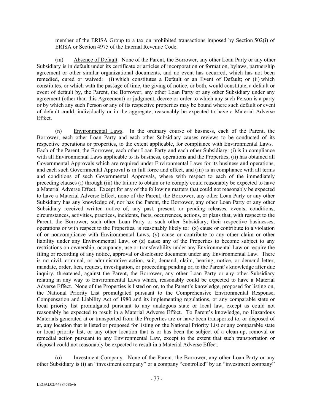 member of the ERISA Group to a tax on prohibited transactions imposed by Section 502(i) of ERISA or Section 4975 of the Internal Revenue Code. (m) Absence of Default. None of the Parent, the Borrower, any other Loan Party or any other Subsidiary is in default under its certificate or articles of incorporation or formation, bylaws, partnership agreement or other similar organizational documents, and no event has occurred, which has not been remedied, cured or waived: (i) which constitutes a Default or an Event of Default; or (ii) which constitutes, or which with the passage of time, the giving of notice, or both, would constitute, a default or event of default by, the Parent, the Borrower, any other Loan Party or any other Subsidiary under any agreement (other than this Agreement) or judgment, decree or order to which any such Person is a party or by which any such Person or any of its respective properties may be bound where such default or event of default could, individually or in the aggregate, reasonably be expected to have a Material Adverse Effect. (n) Environmental Laws. In the ordinary course of business, each of the Parent, the Borrower, each other Loan Party and each other Subsidiary causes reviews to be conducted of its respective operations or properties, to the extent applicable, for compliance with Environmental Laws. Each of the Parent, the Borrower, each other Loan Party and each other Subsidiary: (i) is in compliance with all Environmental Laws applicable to its business, operations and the Properties, (ii) has obtained all Governmental Approvals which are required under Environmental Laws for its business and operations, and each such Governmental Approval is in full force and effect, and (iii) is in compliance with all terms and conditions of such Governmental Approvals, where with respect to each of the immediately preceding clauses (i) through (iii) the failure to obtain or to comply could reasonably be expected to have a Material Adverse Effect. Except for any of the following matters that could not reasonably be expected to have a Material Adverse Effect, none of the Parent, the Borrower, any other Loan Party or any other Subsidiary has any knowledge of, nor has the Parent, the Borrower, any other Loan Party or any other Subsidiary received written notice of, any past, present, or pending releases, events, conditions, circumstances, activities, practices, incidents, facts, occurrences, actions, or plans that, with respect to the Parent, the Borrower, such other Loan Party or such other Subsidiary, their respective businesses, operations or with respect to the Properties, is reasonably likely to: (x) cause or contribute to a violation of or noncompliance with Environmental Laws, (y) cause or contribute to any other claim or other liability under any Environmental Law, or (z) cause any of the Properties to become subject to any restrictions on ownership, occupancy, use or transferability under any Environmental Law or require the filing or recording of any notice, approval or disclosure document under any Environmental Law. There is no civil, criminal, or administrative action, suit, demand, claim, hearing, notice, or demand letter, mandate, order, lien, request, investigation, or proceeding pending or, to the Parent’s knowledge after due inquiry, threatened, against the Parent, the Borrower, any other Loan Party or any other Subsidiary relating in any way to Environmental Laws which, reasonably could be expected to have a Material Adverse Effect. None of the Properties is listed on or, to the Parent’s knowledge, proposed for listing on, the National Priority List promulgated pursuant to the Comprehensive Environmental Response, Compensation and Liability Act of 1980 and its implementing regulations, or any comparable state or local priority list promulgated pursuant to any analogous state or local law, except as could not reasonably be expected to result in a Material Adverse Effect. To Parent’s knowledge, no Hazardous Materials generated at or transported from the Properties are or have been transported to, or disposed of at, any location that is listed or proposed for listing on the National Priority List or any comparable state or local priority list, or any other location that is or has been the subject of a clean-up, removal or remedial action pursuant to any Environmental Law, except to the extent that such transportation or disposal could not reasonably be expected to result in a Material Adverse Effect. (o) Investment Company. None of the Parent, the Borrower, any other Loan Party or any other Subsidiary is (i) an “investment company” or a company “controlled” by an “investment company” - 77 - LEGAL02/44384586v6