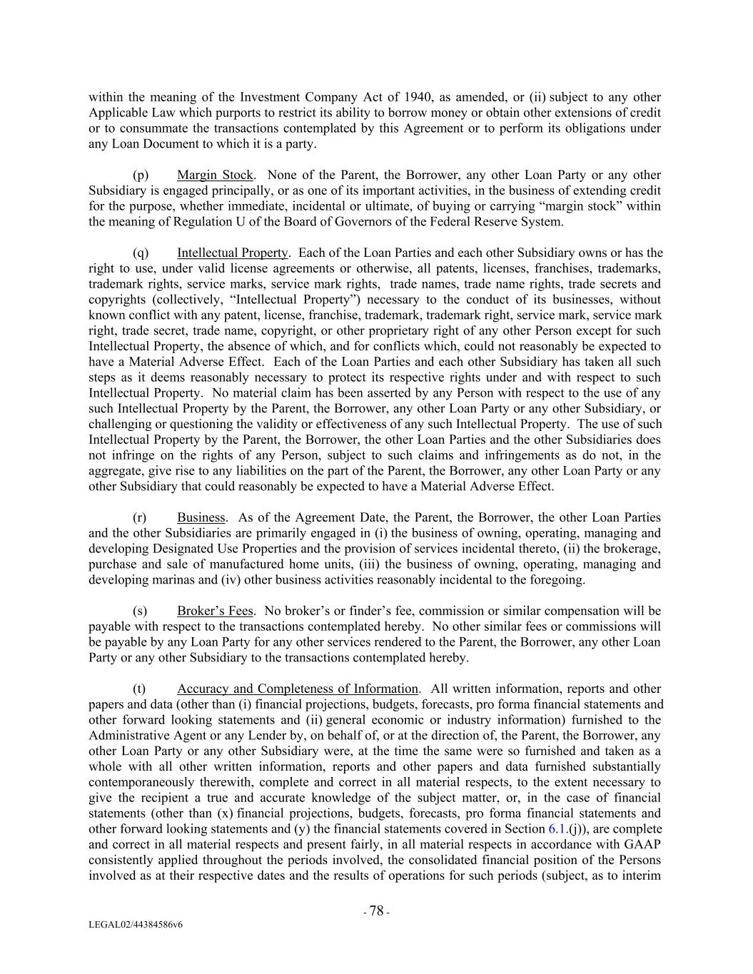 within the meaning of the Investment Company Act of 1940, as amended, or (ii) subject to any other Applicable Law which purports to restrict its ability to borrow money or obtain other extensions of credit or to consummate the transactions contemplated by this Agreement or to perform its obligations under any Loan Document to which it is a party. (p) Margin Stock. None of the Parent, the Borrower, any other Loan Party or any other Subsidiary is engaged principally, or as one of its important activities, in the business of extending credit for the purpose, whether immediate, incidental or ultimate, of buying or carrying “margin stock” within the meaning of Regulation U of the Board of Governors of the Federal Reserve System. (q) Intellectual Property. Each of the Loan Parties and each other Subsidiary owns or has the right to use, under valid license agreements or otherwise, all patents, licenses, franchises, trademarks, trademark rights, service marks, service mark rights, trade names, trade name rights, trade secrets and copyrights (collectively, “Intellectual Property”) necessary to the conduct of its businesses, without known conflict with any patent, license, franchise, trademark, trademark right, service mark, service mark right, trade secret, trade name, copyright, or other proprietary right of any other Person except for such Intellectual Property, the absence of which, and for conflicts which, could not reasonably be expected to have a Material Adverse Effect. Each of the Loan Parties and each other Subsidiary has taken all such steps as it deems reasonably necessary to protect its respective rights under and with respect to such Intellectual Property. No material claim has been asserted by any Person with respect to the use of any such Intellectual Property by the Parent, the Borrower, any other Loan Party or any other Subsidiary, or challenging or questioning the validity or effectiveness of any such Intellectual Property. The use of such Intellectual Property by the Parent, the Borrower, the other Loan Parties and the other Subsidiaries does not infringe on the rights of any Person, subject to such claims and infringements as do not, in the aggregate, give rise to any liabilities on the part of the Parent, the Borrower, any other Loan Party or any other Subsidiary that could reasonably be expected to have a Material Adverse Effect. (r) Business. As of the Agreement Date, the Parent, the Borrower, the other Loan Parties and the other Subsidiaries are primarily engaged in (i) the business of owning, operating, managing and developing Designated Use Properties and the provision of services incidental thereto, (ii) the brokerage, purchase and sale of manufactured home units, (iii) the business of owning, operating, managing and developing marinas and (iv) other business activities reasonably incidental to the foregoing. (s) Broker’s Fees. No broker’s or finder’s fee, commission or similar compensation will be payable with respect to the transactions contemplated hereby. No other similar fees or commissions will be payable by any Loan Party for any other services rendered to the Parent, the Borrower, any other Loan Party or any other Subsidiary to the transactions contemplated hereby. (t) Accuracy and Completeness of Information. All written information, reports and other papers and data (other than (i) financial projections, budgets, forecasts, pro forma financial statements and other forward looking statements and (ii) general economic or industry information) furnished to the Administrative Agent or any Lender by, on behalf of, or at the direction of, the Parent, the Borrower, any other Loan Party or any other Subsidiary were, at the time the same were so furnished and taken as a whole with all other written information, reports and other papers and data furnished substantially contemporaneously therewith, complete and correct in all material respects, to the extent necessary to give the recipient a true and accurate knowledge of the subject matter, or, in the case of financial statements (other than (x) financial projections, budgets, forecasts, pro forma financial statements and other forward looking statements and (y) the financial statements covered in Section 6.1.(j)), are complete and correct in all material respects and present fairly, in all material respects in accordance with GAAP consistently applied throughout the periods involved, the consolidated financial position of the Persons involved as at their respective dates and the results of operations for such periods (subject, as to interim - 78 - LEGAL02/44384586v6