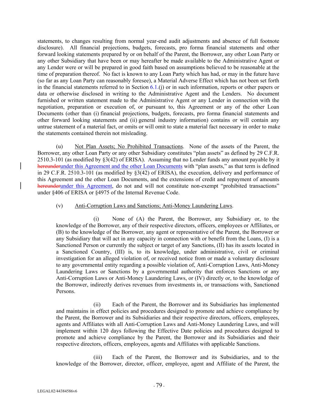 statements, to changes resulting from normal year-end audit adjustments and absence of full footnote disclosure). All financial projections, budgets, forecasts, pro forma financial statements and other forward looking statements prepared by or on behalf of the Parent, the Borrower, any other Loan Party or any other Subsidiary that have been or may hereafter be made available to the Administrative Agent or any Lender were or will be prepared in good faith based on assumptions believed to be reasonable at the time of preparation thereof. No fact is known to any Loan Party which has had, or may in the future have (so far as any Loan Party can reasonably foresee), a Material Adverse Effect which has not been set forth in the financial statements referred to in Section 6.1.(j) or in such information, reports or other papers or data or otherwise disclosed in writing to the Administrative Agent and the Lenders. No document furnished or written statement made to the Administrative Agent or any Lender in connection with the negotiation, preparation or execution of, or pursuant to, this Agreement or any of the other Loan Documents (other than (i) financial projections, budgets, forecasts, pro forma financial statements and other forward looking statements and (ii) general industry information) contains or will contain any untrue statement of a material fact, or omits or will omit to state a material fact necessary in order to make the statements contained therein not misleading. (u) Not Plan Assets; No Prohibited Transactions. None of the assets of the Parent, the Borrower, any other Loan Party or any other Subsidiary constitutes “plan assets” as defined by 29 C.F.R. 2510.3-101 (as modified by §3(42) of ERISA). Assuming that no Lender funds any amount payable by it hereunderunder this Agreement and the other Loan Documents with “plan assets,” as that term is defined in 29 C.F.R. 2510.3-101 (as modified by §3(42) of ERISA), the execution, delivery and performance of this Agreement and the other Loan Documents, and the extensions of credit and repayment of amounts hereunderunder this Agreement, do not and will not constitute non-exempt “prohibited transactions” under §406 of ERISA or §4975 of the Internal Revenue Code. (v) Anti-Corruption Laws and Sanctions; Anti-Money Laundering Laws. (i) None of (A) the Parent, the Borrower, any Subsidiary or, to the knowledge of the Borrower, any of their respective directors, officers, employees or Affiliates, or (B) to the knowledge of the Borrower, any agent or representative of the Parent, the Borrower or any Subsidiary that will act in any capacity in connection with or benefit from the Loans, (I) is a Sanctioned Person or currently the subject or target of any Sanctions, (II) has its assets located in a Sanctioned Country, (III) is, to its knowledge, under administrative, civil or criminal investigation for an alleged violation of, or received notice from or made a voluntary disclosure to any governmental entity regarding a possible violation of, Anti-Corruption Laws, Anti-Money Laundering Laws or Sanctions by a governmental authority that enforces Sanctions or any Anti-Corruption Laws or Anti-Money Laundering Laws, or (IV) directly or, to the knowledge of the Borrower, indirectly derives revenues from investments in, or transactions with, Sanctioned Persons. (ii) Each of the Parent, the Borrower and its Subsidiaries has implemented and maintains in effect policies and procedures designed to promote and achieve compliance by the Parent, the Borrower and its Subsidiaries and their respective directors, officers, employees, agents and Affiliates with all Anti-Corruption Laws and Anti-Money Laundering Laws, and will implement within 120 days following the Effective Date policies and procedures designed to promote and achieve compliance by the Parent, the Borrower and its Subsidiaries and their respective directors, officers, employees, agents and Affiliates with applicable Sanctions. (iii) Each of the Parent, the Borrower and its Subsidiaries, and to the knowledge of the Borrower, director, officer, employee, agent and Affiliate of the Parent, the - 79 - LEGAL02/44384586v6