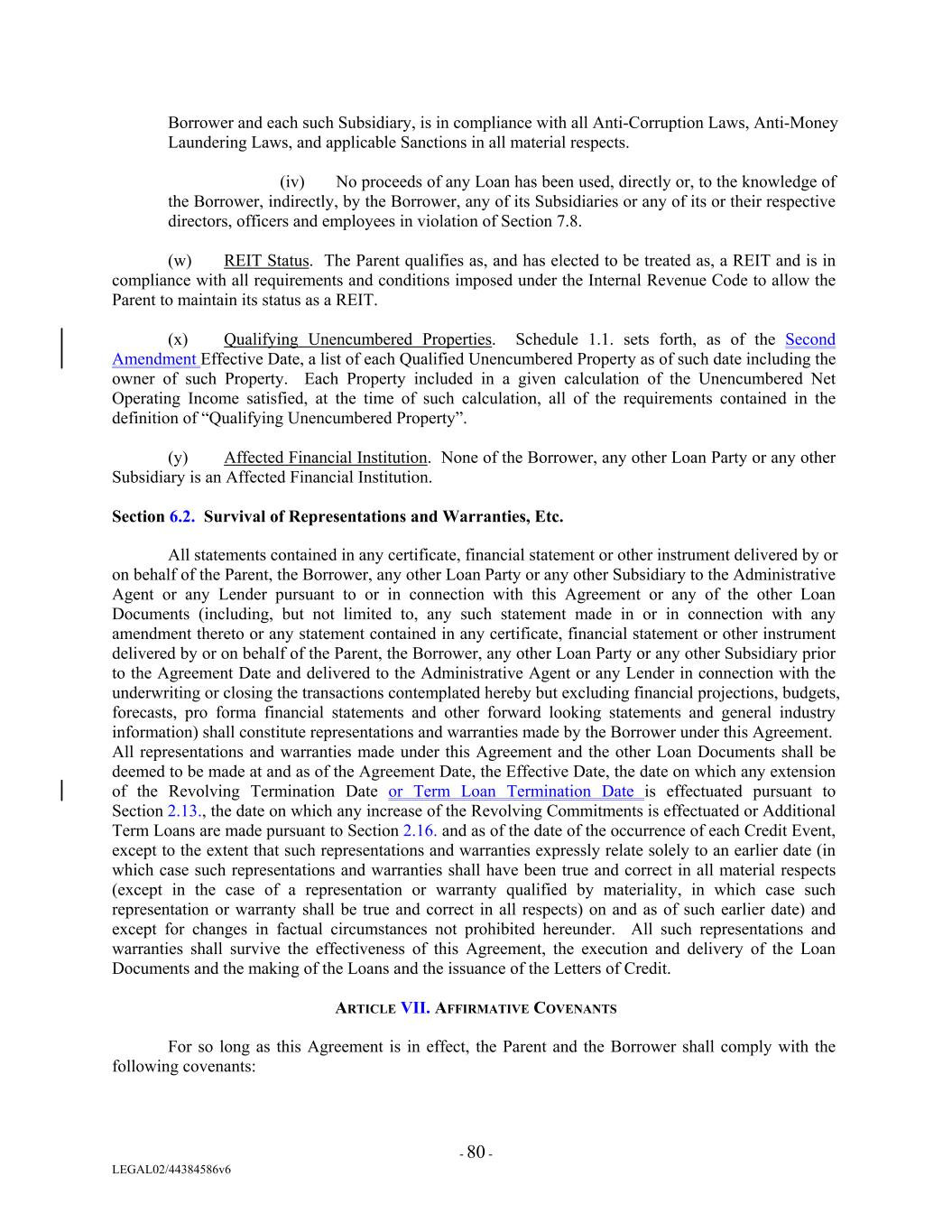 Borrower and each such Subsidiary, is in compliance with all Anti-Corruption Laws, Anti-Money Laundering Laws, and applicable Sanctions in all material respects. (iv) No proceeds of any Loan has been used, directly or, to the knowledge of the Borrower, indirectly, by the Borrower, any of its Subsidiaries or any of its or their respective directors, officers and employees in violation of Section 7.8. (w) REIT Status. The Parent qualifies as, and has elected to be treated as, a REIT and is in compliance with all requirements and conditions imposed under the Internal Revenue Code to allow the Parent to maintain its status as a REIT. (x) Qualifying Unencumbered Properties. Schedule 1.1. sets forth, as of the Second Amendment Effective Date, a list of each Qualified Unencumbered Property as of such date including the owner of such Property. Each Property included in a given calculation of the Unencumbered Net Operating Income satisfied, at the time of such calculation, all of the requirements contained in the definition of “Qualifying Unencumbered Property”. (y) Affected Financial Institution. None of the Borrower, any other Loan Party or any other Subsidiary is an Affected Financial Institution. Section 6.2. Survival of Representations and Warranties, Etc. All statements contained in any certificate, financial statement or other instrument delivered by or on behalf of the Parent, the Borrower, any other Loan Party or any other Subsidiary to the Administrative Agent or any Lender pursuant to or in connection with this Agreement or any of the other Loan Documents (including, but not limited to, any such statement made in or in connection with any amendment thereto or any statement contained in any certificate, financial statement or other instrument delivered by or on behalf of the Parent, the Borrower, any other Loan Party or any other Subsidiary prior to the Agreement Date and delivered to the Administrative Agent or any Lender in connection with the underwriting or closing the transactions contemplated hereby but excluding financial projections, budgets, forecasts, pro forma financial statements and other forward looking statements and general industry information) shall constitute representations and warranties made by the Borrower under this Agreement. All representations and warranties made under this Agreement and the other Loan Documents shall be deemed to be made at and as of the Agreement Date, the Effective Date, the date on which any extension of the Revolving Termination Date or Term Loan Termination Date is effectuated pursuant to Section 2.13., the date on which any increase of the Revolving Commitments is effectuated or Additional Term Loans are made pursuant to Section 2.16. and as of the date of the occurrence of each Credit Event, except to the extent that such representations and warranties expressly relate solely to an earlier date (in which case such representations and warranties shall have been true and correct in all material respects (except in the case of a representation or warranty qualified by materiality, in which case such representation or warranty shall be true and correct in all respects) on and as of such earlier date) and except for changes in factual circumstances not prohibited hereunder. All such representations and warranties shall survive the effectiveness of this Agreement, the execution and delivery of the Loan Documents and the making of the Loans and the issuance of the Letters of Credit. ARTICLE VII. AFFIRMATIVE COVENANTS For so long as this Agreement is in effect, the Parent and the Borrower shall comply with the following covenants: - 80 - LEGAL02/44384586v6