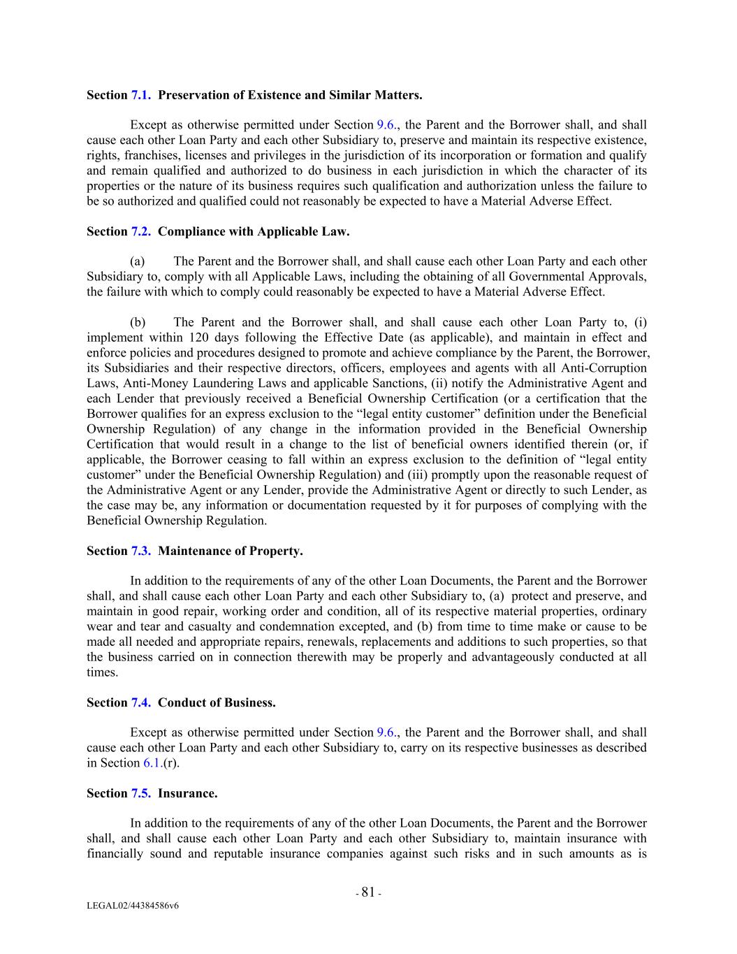 Section 7.1. Preservation of Existence and Similar Matters. Except as otherwise permitted under Section 9.6., the Parent and the Borrower shall, and shall cause each other Loan Party and each other Subsidiary to, preserve and maintain its respective existence, rights, franchises, licenses and privileges in the jurisdiction of its incorporation or formation and qualify and remain qualified and authorized to do business in each jurisdiction in which the character of its properties or the nature of its business requires such qualification and authorization unless the failure to be so authorized and qualified could not reasonably be expected to have a Material Adverse Effect. Section 7.2. Compliance with Applicable Law. (a) The Parent and the Borrower shall, and shall cause each other Loan Party and each other Subsidiary to, comply with all Applicable Laws, including the obtaining of all Governmental Approvals, the failure with which to comply could reasonably be expected to have a Material Adverse Effect. (b) The Parent and the Borrower shall, and shall cause each other Loan Party to, (i) implement within 120 days following the Effective Date (as applicable), and maintain in effect and enforce policies and procedures designed to promote and achieve compliance by the Parent, the Borrower, its Subsidiaries and their respective directors, officers, employees and agents with all Anti-Corruption Laws, Anti-Money Laundering Laws and applicable Sanctions, (ii) notify the Administrative Agent and each Lender that previously received a Beneficial Ownership Certification (or a certification that the Borrower qualifies for an express exclusion to the “legal entity customer” definition under the Beneficial Ownership Regulation) of any change in the information provided in the Beneficial Ownership Certification that would result in a change to the list of beneficial owners identified therein (or, if applicable, the Borrower ceasing to fall within an express exclusion to the definition of “legal entity customer” under the Beneficial Ownership Regulation) and (iii) promptly upon the reasonable request of the Administrative Agent or any Lender, provide the Administrative Agent or directly to such Lender, as the case may be, any information or documentation requested by it for purposes of complying with the Beneficial Ownership Regulation. Section 7.3. Maintenance of Property. In addition to the requirements of any of the other Loan Documents, the Parent and the Borrower shall, and shall cause each other Loan Party and each other Subsidiary to, (a) protect and preserve, and maintain in good repair, working order and condition, all of its respective material properties, ordinary wear and tear and casualty and condemnation excepted, and (b) from time to time make or cause to be made all needed and appropriate repairs, renewals, replacements and additions to such properties, so that the business carried on in connection therewith may be properly and advantageously conducted at all times. Section 7.4. Conduct of Business. Except as otherwise permitted under Section 9.6., the Parent and the Borrower shall, and shall cause each other Loan Party and each other Subsidiary to, carry on its respective businesses as described in Section 6.1.(r). Section 7.5. Insurance. In addition to the requirements of any of the other Loan Documents, the Parent and the Borrower shall, and shall cause each other Loan Party and each other Subsidiary to, maintain insurance with financially sound and reputable insurance companies against such risks and in such amounts as is - 81 - LEGAL02/44384586v6